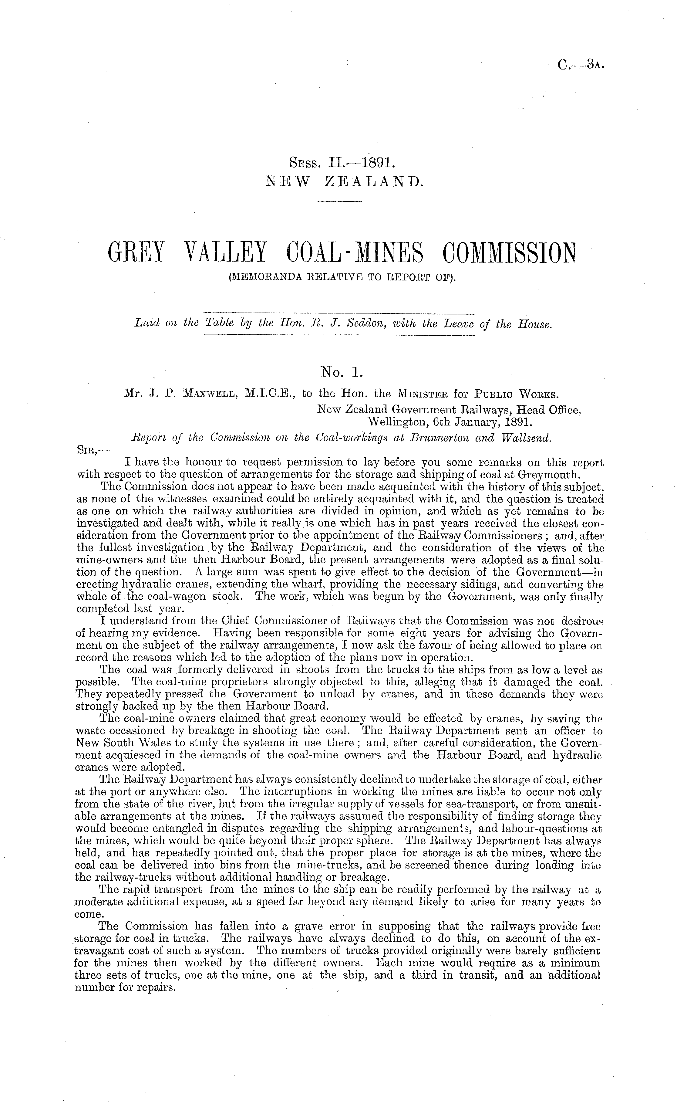 No. 1, Mr. J. P. Maxwell, M.1.C.E., to the Hon. the Minister for Public Works. New Zealand Government Railways, Head Office, Wellington, 6th January, 1891. Report of the Commission on the Coal-workings at Brunnerton and Walls&nd. Sib, — I have the honour to request permission to lay before you some remarks on this report with respect to the question of arrangements for the storage and shipping of coal at Greymouth. The Commission does not appear to have been made acquainted with the history of this subject, as none of the witnesses examined could be entirely acquainted with it, and the question is treated as one on which the railway authorities are divided in opinion, and which as yet remains to be investigated and dealt with, while it really is one which has in past years received the closest consideration from the Government prior to the appointment of the Railway Commissioners ; and, after the fullest investigation by the Railway Department, and the consideration of the views of the mine-owners and the then Harbour Board, the present arrangements were adopted as a final solution of the question. A large sum. was spent to give effect to the decision of the Government—in erecting hydraulic cranes, extending the wharf, providing the necessary sidings, and converting the whole of the coal-wagon stock. The work, which was begun by the Government, was only finally completed last year. I understand from the Chief Commissioner of Railways that the Commission was not desirous of hearing my evidence. Having been responsible for some eight years for advising the Government on the subject of the railway arrangements, I now ask the favour of being allowed to place on record the reasons which led to the adoption of the plans now in operation. The coal was formerly delivered in shoots from the trucks to the ships from as low a level as possible. The coal-mine proprietors strongly objected to this, alleging that it damaged the coal. They repeatedly pressed the Government to unload by cranes, and in these demands they were strongly backed up by the then Harbour Board. The coal-mine owners claimed that great economy would be effected by cranes, by saving the waste occasioned, by breakage in shooting the coal. The Railway Department sent an. officer to New South Wales to study the systems in use there ; and, after careful consideration, the Government acquiesced in the demands of the coal-mine owners and the Harbour Board, and hydraulic cranes were adopted. The Railway Department has always consistently declined to undertake the storage of coal, either at the port or anywhere else. The interruptions in working the mines are liable to occur not only from the state of the river, but from the irregular supply of vessels for sea-transport, or from unsuitable arrangements at the mines. If the railways assumed the responsibility of finding storage they would become entangled in disputes regarding the shipping arrangements, and labour-questions at the mines, which would be quite beyond their proper sphere. The Railway Department has always held, and has repeatedly pointed out, that the proper place for storage is at the mines, where the coal can be delivered into bins from the mine-trucks, and be screened thence during loading into the railway-trucks without additional handling or breakage. The rapid transport from the mines to the ship can be readily performed by the railway at a moderate additional expense, at a speed far beyond any demand likely to arise for many years to come. The Commission has fallen into a grave error in supposing that the railways provide free storage for coal in trucks. The railways have always declined to do this, on account of the extravagant cost of such a system. The numbers of trucks provided originally were barely sufficient for the mines then worked by the different owners. Each mine would require as a minimum three sets of trucks, one at the mine, one at the ship, and a third in transit, and an additional number for repairs.