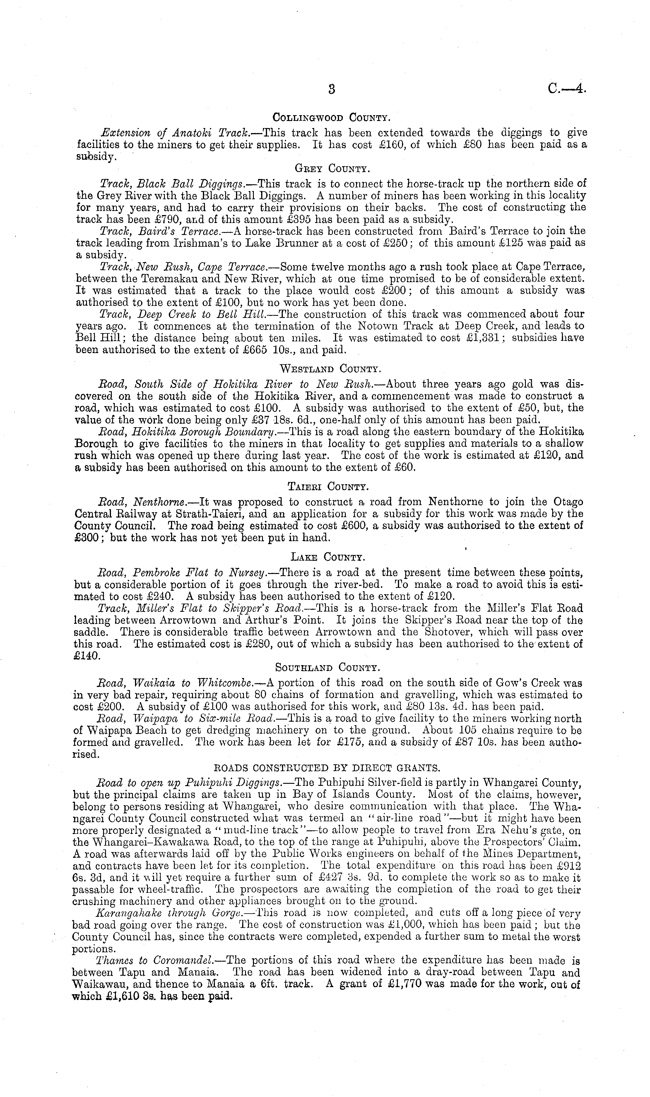 COLLINGWOOD COUNTY. Extension of Anatoki Track. —This track has been extended towards the diggings to give facilities to the miners to get their supplies. It has cost £160, of which £80 has been paid as a subsidy. Grey County. Track, Black Ball Diggings. —This track is to connect the horse-track up the northern side of the Grey Eiver with the Black Ball Diggings. A number of miners has been working in this locality for many years, and had to carry their provisions on their backs. The cost of constructing the track has been £790, and of this amount £395 has been paid as a subsidy. Track, Baird's Terrace. —A horse-track has been constructed from Baird's Terrace to join the track leading from Irishman's to Lake Brunner at a cost of £250; of this amount £125 was paid as a subsidy. Track, New Bush, Cape Terrace. —Some twelve months ago a rush took place at Cape Terrace, between the Teremakau and New Eiver, which at one time promised to be of considerable extent. It was estimated that a track to the place would cost £200; of this amount a subsidy was authorised to the extent of £100, but no work has yet been done. Track, Deep Creek to Bell Hill. —The construction of this track was commenced about four years ago. It commences at the termination of the Notown Track at Deep Creek, and leads to Bell Hill; the distance being about ten miles. It was estimated to cost £1,331; subsidies have been authorised to the extent of £665 10s., and paid. Westland County. Boad, South Side of Hokitika Biver to Neiv Bush. —About three years ago gold was discovered on the south side of the Hokitika Eiver, and a commencement was made to construct a road, which was estimated to cost £100. A subsidy was authorised to the extent of £50, but, the value of the work done being only £37 18s. 6d., one-half only of this amount has been paid. Boad, Hokitika Borough Boundary. —This is a road along the eastern boundary of the Hokitika Borough to give facilities to the miners in that locality to get supplies and materials to a shallow rush which was opened up there during last year. The cost of the work is estimated at £120, and a subsidy has been authorised on this amount to the extent of £60. Taieri County. Boad, Nenthorne. —lt was proposed to construct a road from Nenthorne to join the Otago Central Eailway at Strath-Taieri, and an application for a subsidy for this work was made by the County Council. The road being estimated to cost £600, a subsidy was authorised to the extent of £300; but the work has not yet been put in hand. Lake County. Boad, Pembroke Flat to Nursey. —There is a road at the present time between these points, but a considerable portion of it goes through the river-bed. To make a road to avoid this is estimated to cost £240. A subsidy has been authorised to the extent of £120. Track, Miller's Flat to Skipper's Boad. —This is a horse-track from the Miller's Plat Eoad leading between Arrowtown and Arthur's Point. It joins the Skipper's Eoad near the top of the saddle. There is considerable traffic between Arrowtown and the Shotover, which will pass over this road. The estimated cost is £280, out of which a subsidy has been authorised to the extent of £140. Southland County. Boad, Waikaia to Whitcombc. —A portion of this road on the south side of Gow's Creek was in very bad repair, requiring about 80 chains of formation and gravelling, which was estimated to cost £200. A subsidy of £100 was authorised for this work, and £80 13s. 4d. has been paid. Boad, Waipapa to Six-mile Boad. —This is a road to give facility to the miners working north of Waipapa Beach to get dredging machinery on to the ground. About 105 chains require to be formed and gravelled. The work has been let for £175, and a subsidy of £87 10s. has been authorised. ROADS CONSTEUCTED BY DIEEGT GRANTS. Boad to open up Puhipuhi Diggings. —The Puhipuhi Silver-field is partly in Whangarei County, but the principal claims are taken up in Bay of Islands County. Most of the claims, however, belong to persons residing at Whangarei, who desire communication with that place. The Whangarei County Council constructed what was termed an "air-line road"—but it might have been more properly designated a " mud-line track"—to allow people to travel from Era Nehu's gate, on the Whangarei-Kawakawa Eoad, to the top of the range at Puhipuhi, above the Prospectors' Claim. A road was afterwards laid off by the Public Works engineers on behalf of the Mines Department, and contracts have been let for its completion. The total expenditure on this road has been £912 6s. 3d, and it -will yet require a further sum of £427 3s. 9d. to complete the work so as to make it passable for wheel-traffic. The prospectors are awaiting the completion of the road to get their crushing machinery and other appliances brought on to the ground. Karangahake through Gorge. —This road is now completed, and cuts off a long piece of very bad road going over the range. The cost of construction was £1,000, which has been paid ; but the County Council has, since the contracts were completed, expended a further sum to metal the worst portions. Thames to Coromandel.- —The portions of this road where the expenditure has been made is between Tapu and Manaia. The road has been widened into a dray-road between Tapu and Waikawau, and thence to Manaia a 6ft, track. A grant of £1,770 was made for the work, out of which £1,610 3s. has been paid.