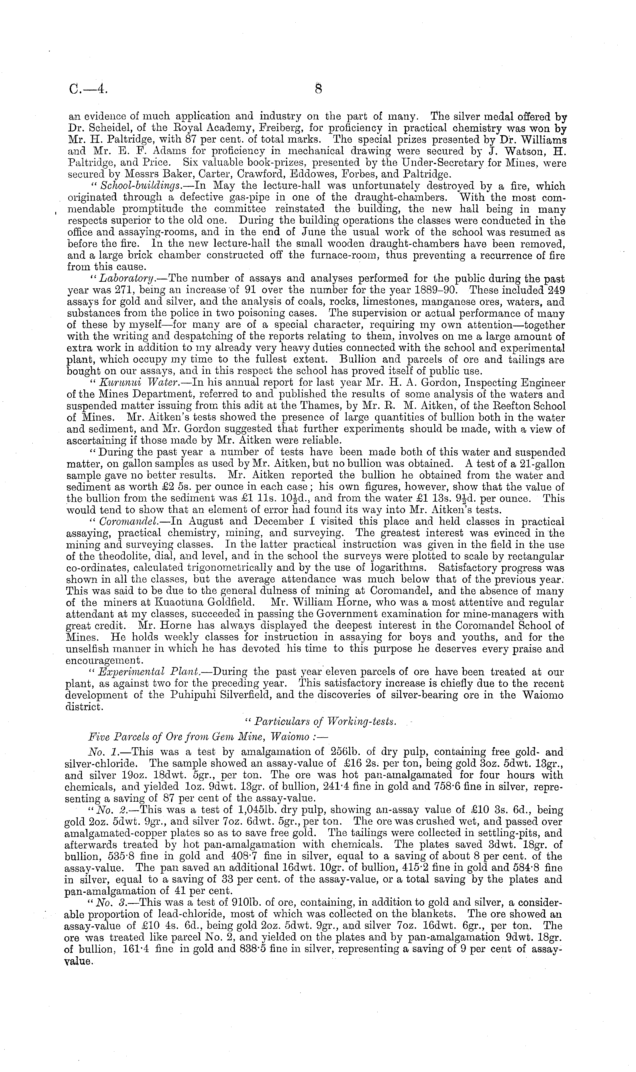 an evidence of much application and industry on the part of many. The silver medal offered by Dr. Scheidel, of the Eoyal Academy, Freiberg, for proficiency in practical chemistry was won by Mr. H. Paltridge, with 87 per cent, of total marks. The special prizes presented by Dr. Williams and Mr. E. P. Adams for proficiency in mechanical drawing were secured by J. Watson, H. Paltridge, and Price. Six valuable book-prizes, presented by the Under-Secretary for Mines, were secured by Messrs Baker, Carter, Crawford, Eddowes, Forbes, and Paltridge. " School-buildings. —ln May the lecture-hall was unfortunately destroyed by a fire, which originated through a defective gas-pipe in one of the draught-chambers. With the most commendable promptitude the committee reinstated the building, the new hall being in many respects superior to the old one. During the building operations the classes were conducted in the office and assaying-rooms, and in the end of June the usual work of the school was resumed as before the fire. In the new lecture-hall the small wooden draught-chambers have been removed, and a large brick chamber constructed off the furnace-room, thus preventing a recurrence of fire from this cause. "Laboratory. —The number of assays and analyses performed for the public during the past year was 271, being an increase of 91 over the number for the year 1889-90. These included 249 assays for gold and silver, and the analysis of coals, rocks, limestones, manganese ores, waters, and substances from the police in two poisoning cases. The supervision or actual performance of many of these by myself—for many are of a special character, requiring my own attention—together with the writing and despatching of the reports relating to them, involves on me a large amount of extra work in addition to my already very heavy duties connected with the school and experimental plant, which occupy my time to the fullest extent. Bullion and parcels of ore and tailings are bought on our assays, and in this respect the school has proved itself of public use. " Kurunui Water. —ln his annual report for last year Mr. H. A. Gordon, Inspecting Engineer of the Mines Department, referred to and published the results of some analysis of the waters and suspended matter issuing from this adit at the Thames, by Mr. E. M. Aitken, of the Eeefton School of Mines. Mr. Aitken's tests showed the presence of large quantities of bullion both in the water and sediment, and Mr. Gordon suggested that further experiments should be made, with a view of ascertaining if those made by Mr. Aitken were reliable. " During the past year a number of tests have been made both of this water and suspended matter, on gallon samples as used by Mr. Aitken, but no bullion was obtained. A test of a 21-gallon sample gave no better results. Mr. Aitken reported the bullion he obtained from the water and sediment as worth £2 ss. per ounce in each case; his own figures, however, show that the value of the bullion from the sediment was £1 lis. 10Jd., and from the water £1 13s. 9-Jfl. per ounce. This would tend to show that an element of error had found its way into Mr. Aitken's tests. " Coromandel. —In August and December 1 visited this place and held classes in practical assaying, practical chemistry, mining, and surveying. The greatest interest was evinced in the mining and surveying classes. In the latter practical instruction was given in the field in the use of the theodolite, dial, and level, and in the school the surveys were plotted to scale by rectangular co-ordinates, calculated trigonometrically and by the use of logarithms. Satisfactory progress was shown in all the classes, but the average attendance was much below that of the previous year. This was said to be due to the general dulness of mining at Coromandel, and the absence of many of the miners at Kuaotuna Goldfield. Mr. William Home, who was a most attentive and regular attendant at my classes, succeeded in passing the Government examination for mine-managers with great credit. Mr. Home has always displayed the deepest interest in the Coromandel School of Mines. He holds weekly classes for instruction in assaying for boys and youths, and for the unselfish manner in which he has devoted his time to this purpose he deserves every praise and encouragement. " Experimental Plant. —During the past year eleven parcels of ore have been treated at our plant, as against two for the preceding year. This satisfactory increase is chiefly due to the recent development of the Puhipuhi Silverfield, and the discoveries of silver-bearing ore in the Waiomo district. " Particulars of Working-tests. Five Parcels of Ore from Gem Mine, Waiomo : — No. I. —This was a test by amalgamation of 2561b. of dry pulp, containing free gold- and silver-chloride. The sample showed an assay-value of £16 2s. per ton, being gold 3oz. sdwt. 13gr., and silver 19oz. 18dwt. sgr., per ton. The ore was hot pan-amalgamated for four hours with chemicals, and yielded loz. 9dwt. 13gr. of bullion, 241-4 fine in gold and 758-6 fine in silver, representing a saving of 87 per cent of the assay-value. " No. 2. —This was a test of 1,0451b. dry pulp, showing an-assay value of £10 3s. 6d., being gold 2oz. sdwt. 9gr., and silver 7oz. 6dwt. sgr.,per ton. The ore was crushed wet, and passed over amalgamated-copper plates so as to save free gold. The tailings were collected in settling-pits, and afterwards treated by hot pan-amalgamation with chemicals. The plates saved 3dwt. 18gr. of bullion, 535-8 fine in gold and 408-7 fine in silver, equal to a saving of about 8 per cent, of the assay-value. The pan saved an additional 16dwt. lOgr. of bullion, 415-2 fine in gold and 584-8 fine in silver, equal to a saving of 33 per cent, of the assay-value, or a total saving by the plates and pan-amalgamation of 41 per cent. " No. 3. —This was a test of 9101b. of ore, containing, in addition to gold and silver, a considerable proportion 