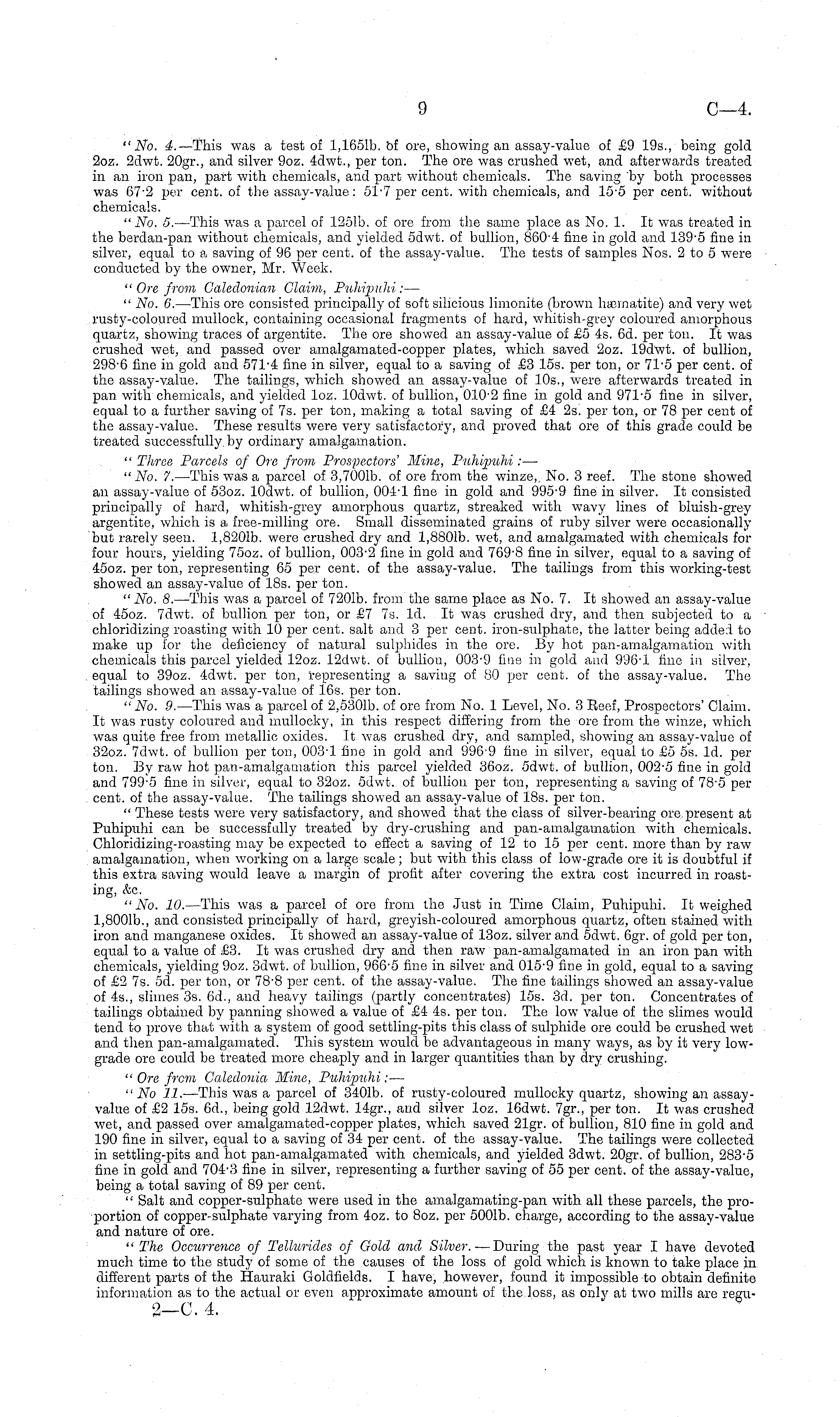 "No. 4. —This was a test of 1,1651b. Of ore, showing an assay-value of £9 195., being gold 2oz. 2dwt. 20gr., and silver 9oz. 4dwt., per ton. The ore was crushed wet, and afterwards treated in an iron pan, part with chemicals, and part without chemicals. The saving by both processes was 67-2 per cent, of the assay-value: 51-7 per cent, with chemicals, and 15-5 per cent, without chemicals. " No. 5. —This w r as a parcel of 1251b. of ore from the same place as No. 1. It was treated in the berdan-pan without chemicals, and yielded sdwt. of bullion, 860-4 fine in gold and 139-5 fine in silver, equal to a saving of 96 per cent, of the assay-value. The tests of samples Nos. 2to 5 were conducted by the owner, Mr. Week. " Ore from Caledonian Claim, Puhipuhi: — " No. 6. —This ore consisted principally of soft sihcious limonite (brown haematite) and very wet rusty-coloured mullock, containing occasional fragments of hard, whitish-grey coloured amorphous quartz, showing traces of argentite. The ore showed an assay-value of £5 4s. 6d. per ton. It was crushed wet, and passed over amalgamated-copper plates, which saved 2oz. 19dwt. of bullion, 298-6 fine in gold and 571-4 fine in silver, equal to a saving of £3 15s. per ton, or 71-5 per cent, of the assay-value. The tailings, which showed an assay-value of 10s., were afterwards treated in pan with chemicals, and yielded loz. lOdwt. of bullion, 010-2 fine in gold and 971-5 fine in silver, equal to a further saving of 7s. per ton, making a total saving of £4 2s. per ton, or 78 per cent of the assay-value. These results were very satisfactory, and proved that ore of this grade could be treated successfully by ordinary amalgamation. " Three Parcels of Ore from Prospectors' Mine, Puhipuhi : — " No. 7. —This was a parcel of 3,7001b. of ore from the winze,. No. 3 reef. The stone showed an assay-value of 530z. lOdwt. of bullion, 004-1 fine in gold and 995-9 fine in silver. It consisted principally of hard, whitish-grey amorphous quartz, streaked with wavy lines of bluish-grey argentite, which is a free-milling ore. Small disseminated grains of ruby silver were occasionally but rarely seen. 1,8201b. were crushed dry and I,BBolb. wet, and amalgamated with chemicals for four hours, yielding 750z. of bullion, 003-2 fine in gold and 769-8 fine in silver, equal to a saving of 450z. per ton, representing 65 per cent, of the assay-value. The tailings from this working-test showed an assay-value of 18s. per ton. " No. B. —This was a parcel of 7201b. from the same place as No. 7. It showed an assay-value of 450z. 7dwt. of bullion per ton, or £7 7s. Id. It was crushed dry, and then subjected to a chloridizing roasting with 10 per cent, salt and 3 per cent, iron-sulphate, the latter being added to make up for the deficiency of natural sulphides in the ore. By hot pan-amalgamation with chemicals this parcel yielded 12oz. 12dwt. of bullion, 003-9 fine in gold and 996-1 fine in silver, equal to 390z. 4dwt. per ton, representing a saving of 80 per cent, of the assay-value. The tailings showed an assay-value of 16s. per ton. " No. 9. —This was a parcel of 2,5301b. of ore from No. 1 Level, No. 3 Eeef, Prospectors' Claim. It was rusty coloured and mullocky, in this respect differing from the ore from the winze, which was quite free from metallic oxides. It was crushed dry, and sampled, showing an assay-value of 320z. 7dwt. of bullion per ton, 003-1 fine in gold and 996-9 fine in silver, equal to £5 ss. Id. per ton. By raw hot pan-amalgamation this parcel yielded 360z. sdwt. of bullion, 002-5 fine in gold and 799-5 fine in silver, equal to 320z. sdwt. of bullion per ton, representing a saving of 78-5 per cent, of the assay-value. The tailings showed an assay-value of 18s. per ton. " These tests were very satisfactory, and showed that the class of silver-bearing ore. present at Puhipuhi can be successfully treated by dry-crushing and pan-amalgamation with chemicals. Chloridizing-roasting may be expected to effect a saving of 12 to 15 per cent, more than by raw amalgamation, when working on a large scale; but with this class of low-grade ore it is doubtful if this extra saving would leave a margin of profit after covering the extra cost incurred in roasting, &c. "No. 10. —This was a parcel of ore from the Just in Time Claim, Puhipuhi. It weighed 1,8001b., and consisted principally of hard, greyish-coloured amorphous quartz, often stained with iron and manganese oxides. It showed an assay-value of 13oz. silver and sdwt. 6gr. of gold per ton, equal to a value of £3. It was crushed dry and then raw pan-amalgamated in an iron pan with chemicals, yielding 9oz. Sdwt. of bullion, 966-5 fine in silver and 015-9 fine in gold, equal to a saving of £2 7s. sd. per ton, or 78-8 per cent, of the assay-value. The fine tailings showed an assay-value of 45., slimes 3s. 6d., and heavy tailings (partly concentrates) 15s. 3d. per ton. Concentrates of tailings obtained by panning showed a value of £4 4s. per ton. The low value of the slimes would tend to prove that with a system of good settling-pits this class of sulphide ore could be crushed wet and then pan-amalgamated. This system would be advantageous in many ways, as by it very lowgrade ore could be treated more cheaply and in larger quantities than by dry crushing. " Ore f rem Caledonia Mine, Puhipuhi: — "No 11. —This was a parcel of 3401b. of rusty-coloured mullocky quartz, showing an assay - value of £2 15s. 6d., being gold 12dwt. 14gr., and silver loz. 16dwt. 7gr., per ton. It was crushed wet, and passed over amalgamated-copper plates, which saved 21gr. of bullion, 810 fine in gold and 190 fine in silver, equal to a saving of 34 per cent, of the assay-value. The tailings were collected in settling-pits and hot pan-amalgamated with chemicals, and yielded 3dwt. 20gr. of bullion, 283-5 fine in gold and 704-3 fine in silver, representing a further saving of 55 per cent, of the assay-value, being a total saving of 89
