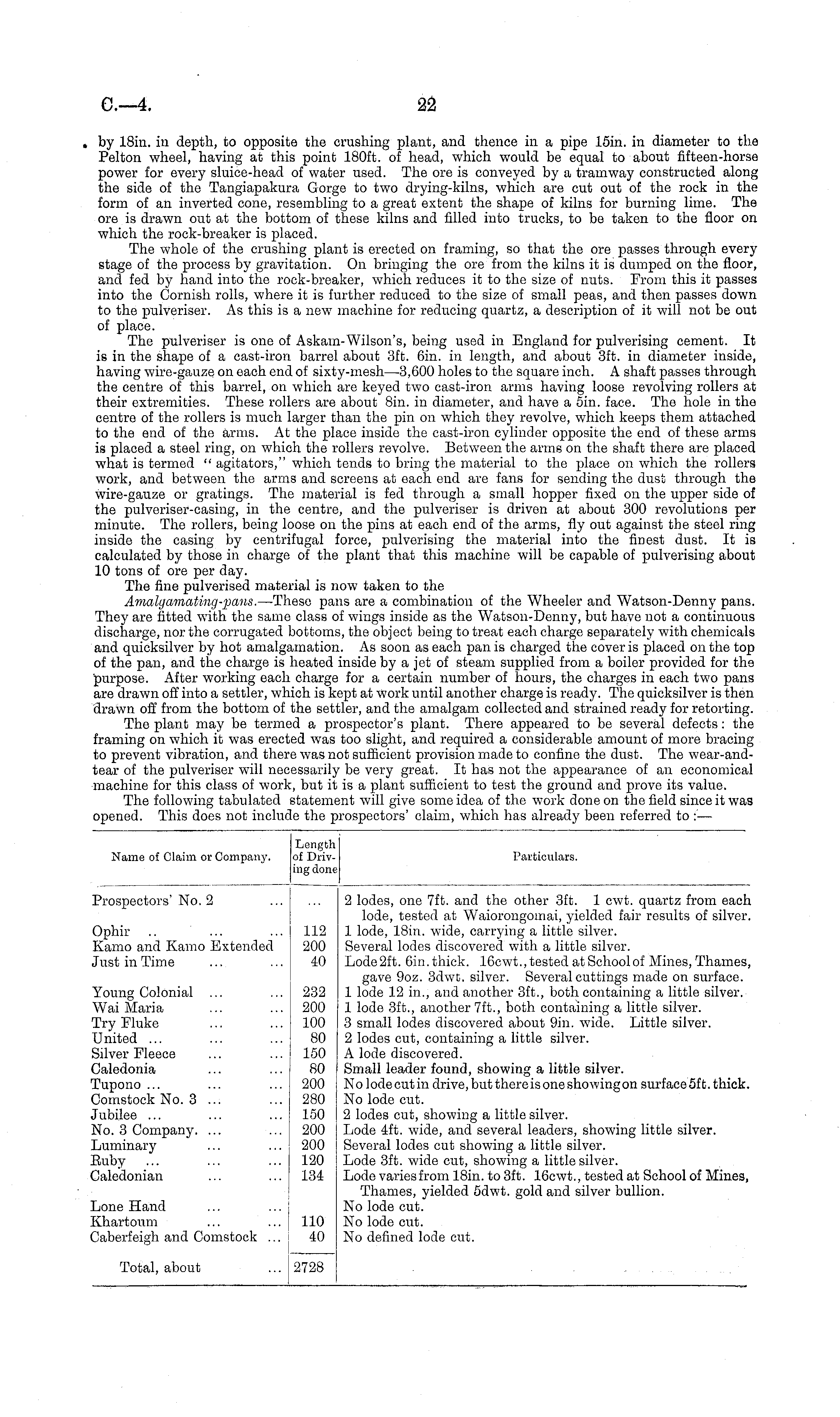 by 18in. in depth, to opposite the crushing plant, and thence in a pipe 15in. in diameter to the Pelton wheel, having at this point 180 ft. of head, which would be equal to about fifteen-horse power for every sluice-heacl of water used. The ore is conveyed by a tramway constructed along the side of the Tangiapakura Gorge to two drying-kilns, which are cut out of the rock in the form of an inverted cone, resembling to a great extent the shape of kilns for burning lime. The ore is drawn out at the bottom of these kilns and filled into trucks, to be taken to the floor on which the rock-breaker is placed. The whole of the crushing plant is erected on framing, so that the ore passes through every stage of the process by gravitation. On bringing the ore from the kilns it is dumped on the floor, and fed by hand into the rock-breaker, which reduces it to the size of nuts. From this it passes into the Cornish rolls, where it is further reduced to the size of small peas, and then passes down to the pulveriser. As this is a new machine for reducing quartz, a description of it will not be out of place. The pulveriser is one of Askam-Wilson's, being used in England for pulverising cement. It is in the shape of a cast-iron barrel about 3ft. 6in. in length, and about 3ft. in diameter inside, having wire-gauze on each end of sixty-mesh—3,6oo holes to the square inch. A shaft passes through the centre of this barrel, on which are keyed two cast-iron arms having loose revolving rollers at their extremities. These rollers are about Bin. in diameter, and have a sin. face. The hole in the centre of the rollers is much larger than the pin on which they revolve, which keeps them attached to the end of the arms. At the place inside the cast-iron cylinder opposite the end of these arms is placed a steel ring, on which the rollers revolve. Between the arms on the shaft there are placed what is termed " agitators," which tends to bring the material to the place on which the rollers work, and between the arms and screens at each end are fans for sending the dust through the wire-gauze or gratings. The material is fed through a small hopper fixed on the upper side of the pulveriser-casing, in the centre, and the pulveriser is driven at about 300 revolutions per minute. The rollers, being loose on the pins at each end of the arms, fly out against the steel ring inside the easing by centrifugal force, pulverising the material into the finest dust. It is calculated by those in charge of the plant that this machine will be capable of pulverising about 10 tons of ore per day. The fine pulverised material is now taken to the Amalgamating-pans. —-These pans are a combination of the Wheeler and Watson-Denny pans. They are fitted with the same class of wings inside as the Watson-Denny, but have not a continuous discharge, nor the corrugated bottoms, the object being to treat each charge separately with chemicals and quicksilver by hot amalgamation. As soon as each pan is charged the cover is placed on the top of the pan, and the charge is heated inside by a jet of steam supplied from a boiler provided for the purpose. After working each charge for a certain number of hours, the charges in each two pans are drawn off into a settler, which is kept at work until another charge is ready. The quicksilver is then drawn off from the bottom of the settler, and the amalgam collected and strained ready for retorting. The plant may be termed a prospector's plant. There appeared to be several defects: the framing on which it was erected was too slight, and required a considerable amount of more bracing to prevent vibration, and there was not sufficient provision made to confine the dust. The wear-and-tear of the pulveriser will necessarily be very great. It has not the appearance of an economical •machine for this class of work, but it is a plant sufficient to test the ground and prove its value. The following tabulated statement will give some idea of the work done on the field since it was opened. This does not include the prospectors' claim, which has already been referred to : —