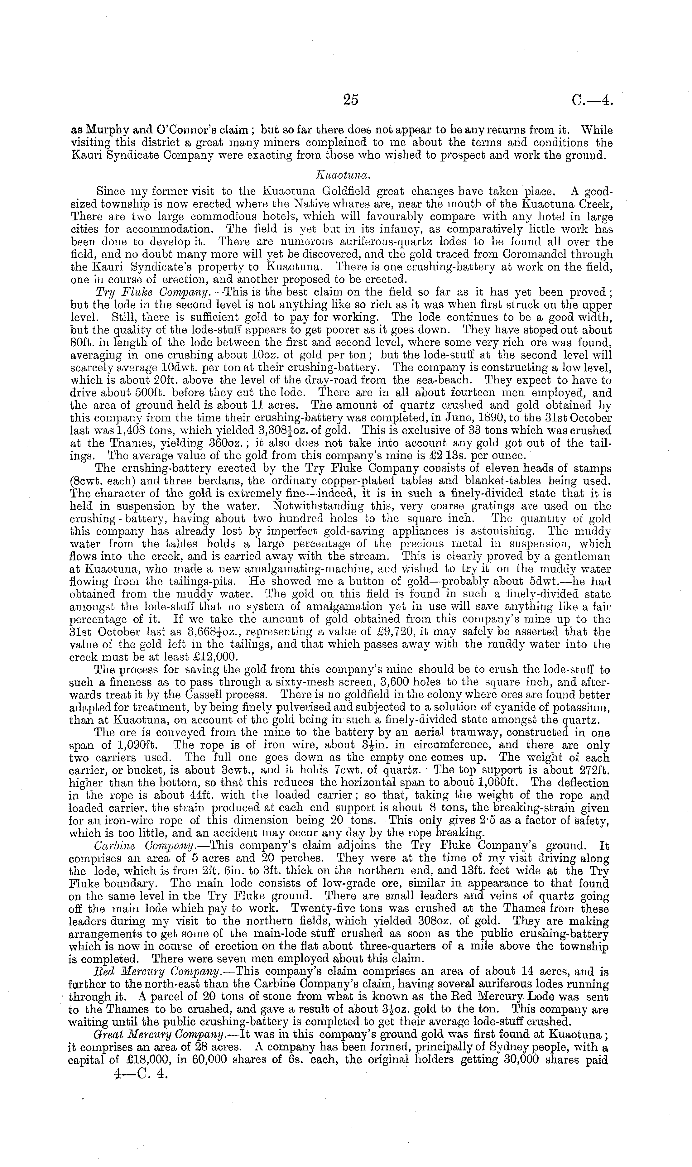 as Murphy and O'Connor's claim ; but so far there does not appear to beany returns from it. While visiting this district a great many miners complained to me about the terms and conditions the Kauri Syndicate Company were exacting from those who wished to prospect and work the ground. Kuaotuna. Since my former visit to the Kuaotuna Goldfield great changes have taken place. A goodsized township is now erected where the Native whares are, near the mouth of the Kuaotuna Creek, There are two large commodious hotels, which will favourably compare with any hotel in large cities for accommodation. The field is yet but in its infancy, as comparatively little work has been done to develop it. There are numerous auriferous-quartz lodes to be found all over the field, and no doubt many more will yet be discovered, and the gold traced from Coromandel through the Kauri Syndicate's property to Kuaotuna. There is one crushing-battery at work on the field, one in course of erection, and another proposed to be erected. Try Fluke Company. —This is the best claim on the field so far as it has yet been proved; but the lode in the second level is not anything like so rich as it was when first struck on the upper level. Still, there is sufficient gold to pay for working. The lode continues to be a good width, but the quality of the lode-stuff appears to get poorer as it goes down. They have stoped out about 80ft. in length of the lode between the first and second level, where some very rich ore was found, averaging in one crushing about lOoz. of gold per ton; but the lode-stuff at the second level will scarcely average lOdwt. per ton at their crushing-battery. The company is constructing a low level, which is about 20ft. above the level of the dray-road from the sea-beach. They expect to have to drive about 500 ft. before they cut the lode. There are in all about fourteen men employed, and the area of ground held is about 11 acres. The amount of quartz crushed and gold obtained by this company from the time their crushing-battery was completed, in June, 1890, to the 31st October last was 1,408 tons, which yielded 3,308J0z. of gold. This is exclusive of 33 tons which was crushed at the Thames, yielding 3600z.; it also does not take into account any gold got out of the tailings. The average value of the gold from this company's mine is £2 13s. per ounce. The crushing-battery erected by the Try Fluke Company consists of eleven heads of stamps (Bcwt. each) and three berdans, the ordinary copper-plated tables and blanket-tables being used. The character of the gold is extremely fine—indeed, it is in such a finely-divided state that it is held in suspension by the water. Notwithstanding this, very coarse gratings are used on the crushing - battery, having about two hundred holes to the square inch. The quantity of gold this company has already lost by imperfect gold-saving appliances is astonishing. The muddy water from the tables holds a large percentage of the precious metal in suspension, which flows into the creek, and is carried away with the stream. This is clearly proved by a gentleman at Kuaotuna, who made a new ainalgamating-machine, and wished to try it on the muddy water flowing from the tailings-pits. He showed me a button of gold—probably about sdwt.—he had obtained from the muddy water. The gold on this field is found in such a finely-divided state amongst the lode-stuff that no system of amalgamation yet in use will save anything like a fair percentage of it. If we take the amount of gold obtained from this company's mine up to the 31st October last as 3,668|-oz., representing a value of £9,720, it may safely be asserted that the value of the gold left in the tailings, and that which passes away with the muddy water into the creek must be at least £12,000. The process for saving the gold from this company's mine should be to crush the lode-stuff to such a fineness as to pass through a sixty-mesh screen, 3,600 holes to the square inch, and afterwards treat it by the Cassell process. There is no goldfield in the colony where ores are found better adapted for treatment, by being finely pulverised and subjected to a solution of cyanide of potassium, than at Kuaotuna, on account of the gold being in such a finely-divided state amongst the quartz. The ore is conveyed from the mine to the battery by an aerial tramway, constructed in one span of 1,090 ft. The rope is of iron wire, about 3-|in. in circumference, and there are only two carriers used. The full one goes down as the empty one comes up. The weight of each carrier, or bucket, is about 3cwt., and it holds 7cwt. of quartz. ■ The top support is about 272 ft. higher than the bottom, so that this reduces the horizontal span to about 1,060 ft. The deflection in the rope is about 44ft. with the loaded carrier; so that, taking the weight of the rope and loaded carrier, the strain produced at each end support is about 8 tons, the breaking-strain given for an iron-wire rope of this dimension being 20 tons. This only gives 2-5 as a factor of safety, which is too little, and an accident may occur any day by the rope breaking. Carbine Company. —This company's claim adjoins the Try Fluke Company's ground. It comprises an area of 5 acres and 20 perches. They were at the time of my visit driving along the lode, which is from 2ft. 6in. to 3ft. thick on the northern end, and 13ft. feet wide at the Try Fluke boundary. The main lode consists of low-grade ore, similar in appearance to that found on the same level in the Try Fluke ground. There are small leaders and veins of quartz going off the main lode which pay to work. Twenty-five tons was crushed at the Thames from these leaders during my visit to the northern fields, which yielded 308oz. of gold. They are making arrangements to get some of the main-lode stuff crushed as soon as the public crushing-battery which is now in course of erection on the flat about three-quarters of a mile above the townsh