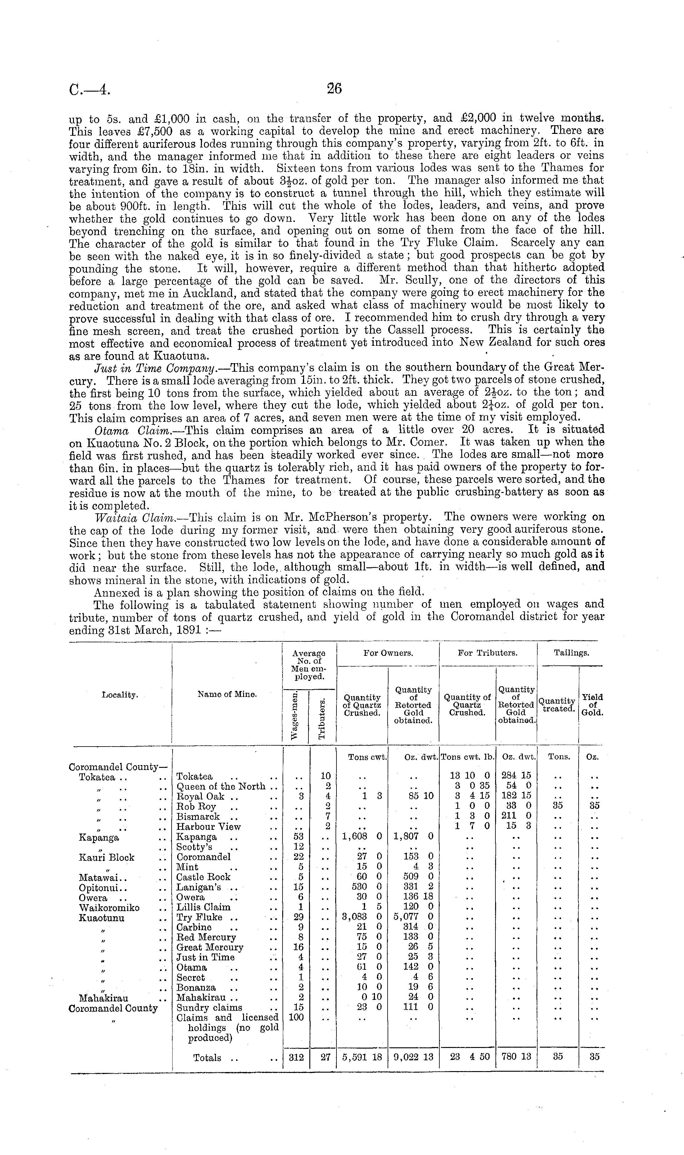 up to ss. and £1,000 in cash, on the transfer of the property, and £2,000 in twelve months. This leaves £7,500 as a working capital to develop the mine and erect machinery. There are four different auriferous lodes running through this company's property, varying from 2ft. to 6ft. in width, and the manager informed me that in addition to these there are eight leaders or veins varying from 6in. to 18in. in width. Sixteen tons from various lodes was sent to the Thames for treatment, and gave a result of about 3|oz. of gold per ton. The manager also informed me that the intention of the company is to construct a tunnel through the hill, which they estimate will be about 900 ft. in length. This will cut the whole of the lodes, leaders, and veins, and prove whether the gold continues to go down. Very little work has been done on any of the lodes beyond trenching on the surface, and opening out on some of them from the face of the hill. The character of the gold is similar to that found in the Try Fluke Claim. Scarcely any can be seen with the naked eye, it is in so finely-divided a state; but good prospects can be got by pounding the stone. It will, however, require a different method than that hitherto adopted before a large percentage of the gold can be saved. Mr. Scully, one of the directors of this company, met me in Auckland, and stated that the company were going to erect machinery for the reduction and treatment of the ore, and asked what class of machinery would be most likely to prove successful in dealing with that class of ore. I recommended him to crush dry through a very fine mesh screen, and treat the crushed portion by the Cassell process. This is certainly the most effective and economical process of treatment yet introduced into New Zealand for such ores as are found at Kuaotuna. Just in Time Company. —This company's claim is on the southern boundary of the Great Mercury. There is a small lode averaging from 15in. to 2ft. thick. They got two parcels of stone crushed, the first being 10 tons from the surface, which yielded about an average of 2|oz. to the ton; and 25 tons from the low level, where they cut the lode, which yielded about 2Joz. of gold per ton. This claim comprises an area of 7 acres, and seven men were at the time of my visit employed. Otama Claim. —This claim comprises an area of a little over 20 acres. It is situated on Kuaotuna No. 2 Block, on the portion which belongs to Mr. Comer. It was taken up when the field was first rushed, and has been steadily worked ever since. The lodes are small—not more than 6in. in places—but the quartz is tolerably rich, and it has paid owners of the property to forward all the parcels to the Thames for treatment. Of course, these parcels were sorted, and the residue is now at the mouth of the mine, to be treated at the public crushing-battery as soon as it is completed. Waitaia Claim. —This claim is on Mr. McPherson's property. The owners were working on the cap of the lode during my former visit, and were then obtaining very good auriferous stone. Since then they have constructed two low levels on the lode, and have done a considerable amount of work; but the stone from these levels has not the appearance of carrying nearly so much gold as it did near the surface. Still, the lode, although small—about Ift. in width—is well defined, and shows mineral in the stone, with indications of gold. Annexed is a plan showing the position of claims on the field. The following is a tabulated statement showing number of men employed on wages and tribute, number of tons of quartz crushed, and yield of gold in the Coromandel district for year ending 31st March, 1891 :—