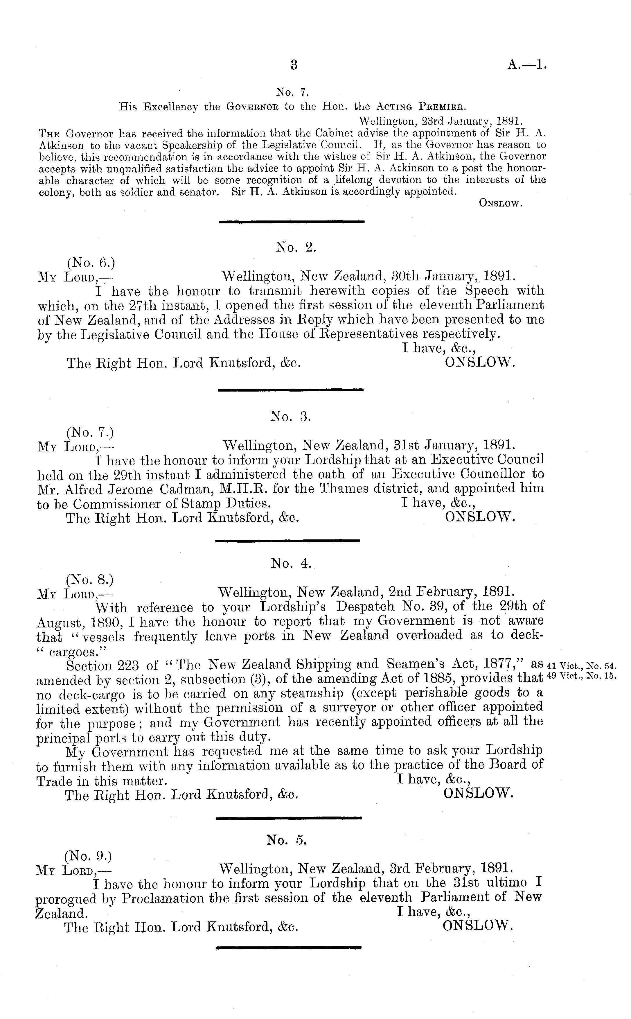No. 7. His Excellency the Goveenoe to the Hon. the Acting Pbemiee. Wellington, 23rd January, 1891. The Governor has received the information that the Cabinet advise the appointment of Sir H. A. Atkinson to the vacant Speakership of the Legislative Council. If, as the Governor has reason to believe, this recommendation is in accordance with the wishes of Sir H. A. Atkinson, the Governor accepts with unqualified satisfaction the advice to appoint Sir H. A. Atkinson to a post the honourable character of which will be some recognition of a .lifelong devotion to the interests of the colony, both as soldier and senator. Sir H. A. Atkinson is accordingly appointed. Onslow.