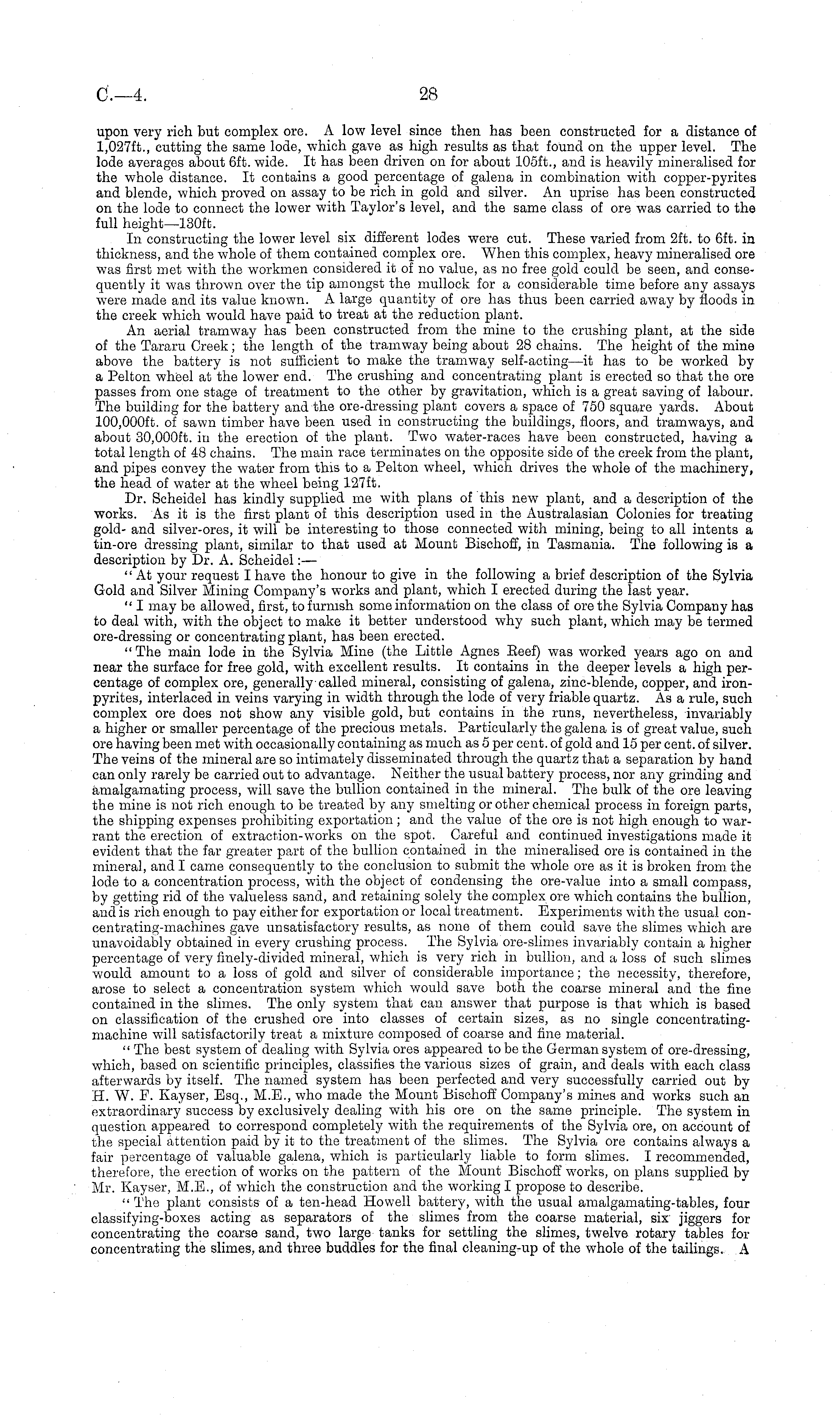upon very rich but complex ore. A low level since then has been constructed for a distance of 1,027 ft., cutting the same lode, which gave as high results as that found on the upper level. The lode averages about 6ft. wide. It has been driven on for about 105 ft., and is heavily mineralised for the whole distance. It contains a good percentage of galena in combination with copper-pyrites and blende, which proved on assay to be rich in gold and silver. An uprise has been constructed on the lode to connect the lower with Taylor's level, and the same class of ore was carried to the full height—l3oft. In constructing the lower level six different lodes were cut. These varied from 2ft. to 6ft. in thickness, and the whole of them contained complex ore. When this complex, heavy mineralised ore was first met with the workmen considered it of no value, as no free gold could be seen, and consequently it was thrown over the tip amongst the mullock for a considerable time before any assays were made and its value known. A large quantity of ore has thus been carried away by floods in the creek which would have paid to treat at the reduction plant. An aerial tramway has been constructed from the mine to the crushing plant, at the side of the Tararu Creek; the length of the tramway being about 28 chains. The height of the mine above the battery is not sufficient to make the tramway self-acting—it has to be worked by a Pelton wheel at the lower end. The crushing and concentrating plant is erected so that the ore passes from one stage of treatment to the other by gravitation, which is a great saving of labour. The building for the battery and the ore-dressing plant covers a space of 750 square yards. About 100,000 ft. of sawn timber have been used in constructing the buildings, floors, and tramways, and about 30,000 ft. in the erection of the plant. Two water-races have been constructed, having a total length of 48 chains. The main race terminates on the opposite side of the creek from the plant, and pipes convey the water from this to a Pelton wheel, which drives the whole of the machinery, the head of water at the wheel being 127 ft. Dr. Scheidel has kindly supplied me with plans of this new plant, and a description of the works. As it is the first plant of this description used in the Australasian Colonies for treating gold- and silver-ores, it will be interesting to those connected with mining, being to all intents a tin-ore dressing plant, similar to that used at Mount Bischoff, in Tasmania. The following is a description by Dr. A. Scheidel: — "At your request I have the honour to give in the following a brief description of the Sylvia Gold and Silver Mining Company's works and plant, which I erected during the last year. " I may be allowed, first, to furnish some information on the class of ore the Sylvia Company has to deal with, with the object to make it better understood why such plant, which may be termed ore-dressing or concentrating plant, has been erected. " The main lode in the Sylvia Mine (the Little Agnes Eeef) was worked years ago on and near the surface for free gold, with excellent results. It contains in the deeper levels a high percentage of complex ore, generally called mineral, consisting of galena, zinc-blende, copper, and ironpyrites, interlaced in veins varying in width through the lode of very friable quartz. As a rule, such complex ore does not show any visible gold, but contains in the runs, nevertheless, invariably a higher or smaller percentage of the precious metals. Particularly the galena is of great value, such ore having been met with occasionally containing as much as 5 per cent, of gold and 15 per cent, of silver. The veins of the mineral are so intimately disseminated through the quartz that a separation by hand can only rarely be carried out to advantage. Neither the usual battery process, nor any grinding and amalgamating process, will save the bullion contained in the mineral. The bulk of the ore leaving the mine is not rich enough to be treated by any smelting or other chemical process in foreign parts, the shipping expenses prohibiting exportation ; and the value of the ore is not high enough to warrant the erection of extraction-works on the spot. Careful and continued investigations made it evident that the far greater part of the bullion contained in the mineralised ore is contained in the mineral, and I came consequently to the conclusion to submit the whole ore as it is broken from the lode to a concentration process, with the object of condensing the ore-value into a small compass, by getting rid of the valueless sand, and retaining solely the complex ore which contains the bullion, and is rich enough to pay either for exportation or local treatment. Experiments with the usual con-centrating-machines gave unsatisfactory results, as none of them could save the slimes which are unavoidably obtained in every crushing process. The Sylvia ore-slimes invariably contain a higher percentage of very finely-divided mineral, which is very rich in bullion, and a loss of such slimes would amount to a loss of gold and silver of considerable importance; the necessity, therefore, arose to select a concentration system which would save both the coarse mineral and the fine contained in the slimes. The only system that can answer that purpose is that which is based on classification of the crushed ore into classes of certain sizes, as no single concentratingmachine will satisfactorily treat a mixture composed of coarse and fine material. " The best system of dealing with Sylvia ores appeared to be the German system of ore-dressing, which, based on scientific principles, classifies the various sizes of grain, and deals with each class afterwards by itself. The named system has been perfected and very successfully carried out by H. W. F. Kayser, Esq., M.E., who made the Mount Bischoff Company's mines and works such an. extraordinary success by exclusively dealing with 
