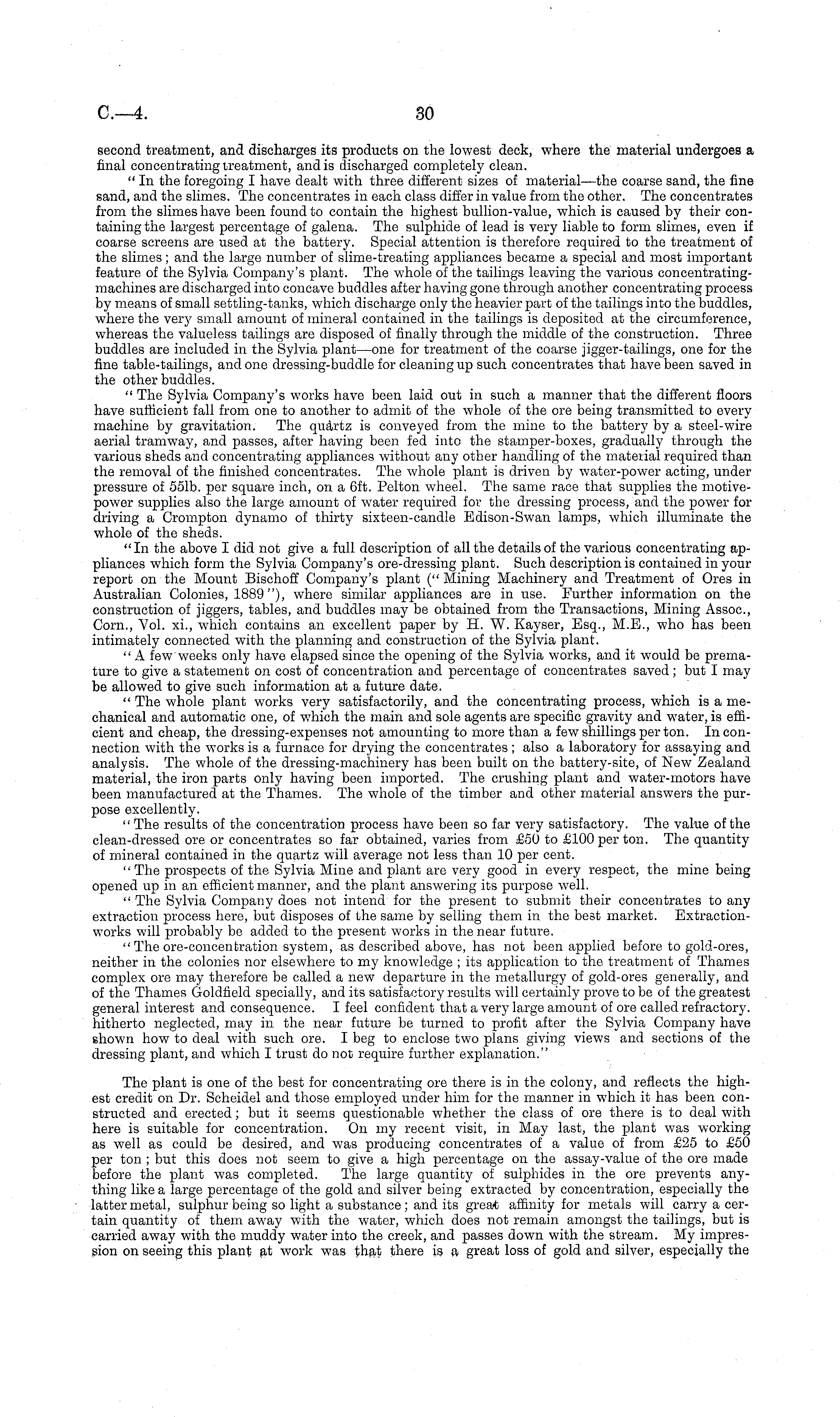 second treatment, and discharges its products on the lowest deck, where the material undergoes a final concentrating treatment, and is discharged completely clean. " In the foregoing I have dealt with three different sizes of material—the coarse sand, the fine sand, and the slimes. The concentrates in each class differ in value from the other. The concentrates from the slimes have been found to contain the highest bullion-value, which is caused by their containing the largest percentage of galena. The sulphide of lead is very liable to form slimes, even if coarse screens are used at the battery. Special attention is therefore required to the treatment of the slimes; and the large number of slime-treating appliances became a special and most important feature of the Sylvia Company's plant. The whole of the tailings leaving the various concentratingmachines are discharged into concave buddies after having gone through another concentrating process by means of small settling-tanks, which discharge only the heavier part of the tailings into the buddies, where the very small amount of mineral contained in the tailings is deposited at the circumference, whereas the valueless tailings are disposed of finally through the middle of the construction. Three buddies are included in the Sylvia plant—one for treatment of the coarse jigger-tailings, one for the fine table-tailings, and one dressing-buddle for cleaning up such concentrates that have been saved in the other buddies. " The Sylvia Company's works have been laid out in such a manner that the different floors have sufficient fall from one to another to admit of the whole of the ore being transmitted to every machine by gravitation. The quartz is conveyed from the mine to the battery by a steel-wire aerial tramway, and passes, after having been fed into the stamper-boxes, gradually through the various sheds and concentrating appliances without any other handling of the material required than the removal of the finished concentrates. The whole plant is driven by water-power acting, under pressure of 551b. per square inch, on a Oft. Pelton wheel. The same race that supplies the motivepower supplies also the large amount of water required for the dressing process, and the power for driving a Crompton dynamo of thirty sixteen-candle Edison-Swan lamps, which illuminate the whole of the sheds. "In the above I did not give a full description of all the details of the various concentrating appliances which form the Sylvia Company's ore-dressing plant. Such description is contained in your report on the Mount Bischoff Company's plant ("Mining Machinery and Treatment of Ores in Australian Colonies, 1889"), where similar appliances are in use. Further information on the construction of jiggers, tables, and buddies may be obtained from the Transactions, Mining Assoc, Corn., Vol. xi., which contains an excellent paper by H. W. Kayser, Esq., M.E., who has been intimately connected with the planning and construction of the Sylvia plant. " A few weeks only have elapsed since the opening of the Sylvia works, and it would be premature to give a statement on cost of concentration and percentage of concentrates saved; but I may be allowed to give such information at a future date. " The whole plant works very satisfactorily, and the concentrating process, which is a mechanical and automatic one, of which the main and sole agents are specific gravity and water, is efficient and cheap, the dressing-expenses not amounting to more than a few shillings per ton. In connection with the works is a furnace for drying the concentrates ; also a laboratory for assaying and analysis. The whole of the dressing-machinery has been built on the battery-site, of New Zealand material, the iron parts only having been imported. The crushing plant and water-motors have been manufactured at the Thames. The whole of the timber and other material answers the purpose excellently. " The results of the concentration process have been so far very satisfactory. The value of the clean-dressed ore or concentrates so far obtained, varies from £50 to £100 per ton. The quantity of mineral contained in the quartz will average not less than 10 per cent. "The prospects of the Sylvia Mine and plant are very good in every respect, the mine being opened up in an efficient manner, and the plant answering its purpose well. " The Sylvia Company does not intend for the present to submit their concentrates to any extraction process here, but disposes of the same by selling them in the best market. Extractionworks will probably be added to the present works in the near future. " The ore-concentration system, as described above, has not been applied before to gold-ores, neither in the colonies nor elsewhere to my knowledge ; its application to the treatment of Thames complex ore may therefore be called a new departure in the metallurgy of gold-ores generally, and of the Thames Goldfield specially, and its satisfactory results will certainly prove to be of the greatest general interest and consequence. I feel confident that a very large amount of ore called refractory, hitherto neglected, may in the near future be turned to profit after the Sylvia Company have shown how to deal with such ore. I beg to enclose two plans giving views and sections of the dressing plant, and which I trust do not require further explanation." The plant is one of the best for concentrating ore there is in the colony, and reflects the highest credit on Dr. Scheidel and those employed under him for the manner in which it has been constructed and erected; but it seems questionable whether the class of ore there is to deal with here is suitable for concentration. On my recent visit, in May last, the plant was working as well as could be desired, and was producing concentrates of a value of from £25 to £50 per ton ; but this does not seem to give a high percentage on the assay-value of the ore made before the plant was completed.