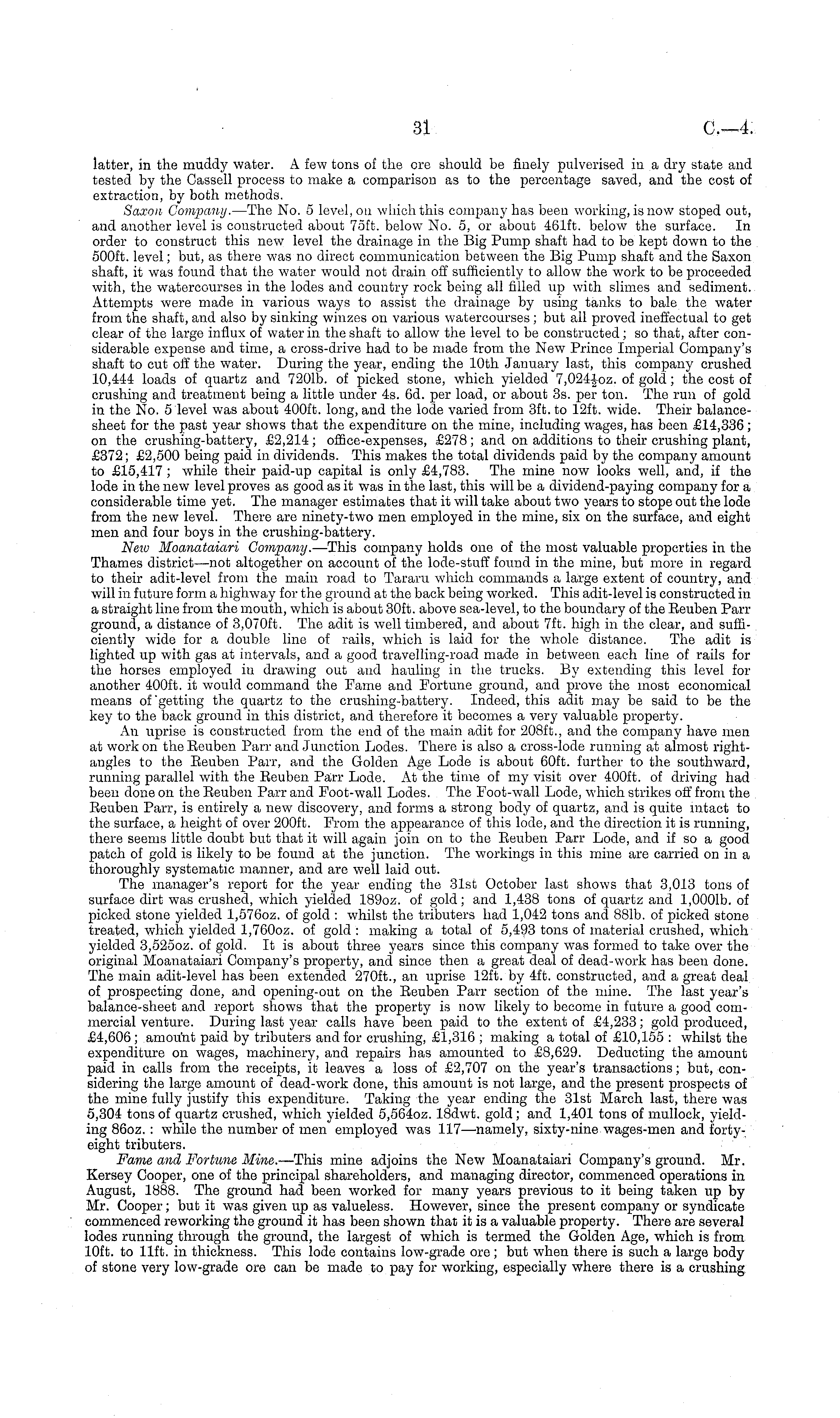 latter, in the muddy water. A few tons of the ore should be finely pulverised in a dry state and tested by the Cassell process to make a comparison as to the percentage saved, and the cost of extraction, by both methods. Saxon Company. —The No. 5 level, on which this company has been working, is now stoped out, and another level is constructed about 75ft. below No. 5, or about 461 ft. below the surface. In order to construct this new level the drainage in the Big Pump shaft had to be kept down to the 500 ft. level; but, as there was no direct communication between the Big Pump shaft and the Saxon shaft, it was found that the water would not drain off sufficiently to allow the work to be proceeded with, the watercourses in the lodes and country rock being all filled up with slimes and sediment. Attempts were made in various ways to assist the drainage by using tanks to bale the water from the shaft, and also by sinking winzes on various watercourses ; but all proved ineffectual to get clear of the large influx of water in the shaft to allow the level to be constructed; so that, after considerable expense and time, a cross-drive had to be made from the New Prince Imperial Company's shaft to cut off the water. During the year, ending the 10th January last, this company crushed 10,444 loads of quartz and 7201b. of picked stone, which yielded 7,024-Joz. of gold; the cost of crushing and treatment being a little under 4s. 6d. per load, or about 3s. per ton. The run of gold in the No. 5 level was about 400 ft. long, and the lode varied from 3ft. to 12ft. wide. Their balancesheet for the past year shows that the expenditure on the mine, including wages, has been £14,336 ; on the crushing-battery, £2,214 ; office-expenses, £278; and on additions to their crushing plant, £372; £2,500 being paid in dividends. This makes the total dividends paid by the company amount to £15,417 ; while their paid-up capital is only £4,783. The mine now looks well, and, if the lode in the new level proves as good as it was in the last, this will be a dividend-paying company for a considerable time yet. The manager estimates that it will take about two years to stope out the lode from the new level. There are ninety-two men employed in the mine, six on the surface, and eight men and four boys in the crushing-battery. New Moanataiari Company. —This company holds one of the most valuable properties in the Thames district—not altogether on account of the lode-stuff found in the mine, but more in regard to their adit-level from the main road to Tararu which commands a large extent of country, and will in future form a highway for the ground at the back being worked. This adit-level is constructed in a straight line from the mouth, which is about 30ft. above sea-level, to the boundary of the Reuben Parr ground, a distance of 3,070 ft. The adit is well timbered, and about 7ft. high in the clear, and sufficiently wide for a double line of rails, which is laid for the whole distance. The adit is lighted, up with gas at intervals, and a good travelling-road made in between each line of rails for the horses employed in drawing out and hauling in the trucks. By extending this level for another 400 ft. it would command the Fame and Fortune ground, and prove the most economical means of 'getting the quartz to the crushing-battery. Indeed, this adit may be said to be the key to the back ground in this district, and therefore it becomes a very valuable property. An uprise is constructed from the end of the main adit for 208 ft., and the company have men at work on the Reuben Parr and Junction Lodes. There is also a cross-lode running at almost rightangles to the Reuben Parr, and the Golden Age Lode is about 60ft. further to the southward, running parallel with the Reuben Parr Lode. At the time of my visit over 400 ft. of driving had been done on the Reuben Parr and Foot-wall Lodes. The Foot-wall Lode, which strikes off from the Reuben Parr, is entirely a new discovery, and forms a strong body of quartz, and is quite intact to the surface, a height of over 200 ft. From the appearance of this lode, and the direction it is running, there seems little doubt but that it will again join on to the Reuben Parr Lode, and if so a good patch of gold is likely to be found at the junction. The workings in this mine are carried on in a thoroughly systematic manner, and are well laid out. The manager's report for the year ending the 31st October last shows that 3,013 tons of surface dirt was crushed, which yielded 189oz. of gold; and 1,438 tons of quartz and I,ooolb. of picked stone yielded 1,5760z. of gold : whilst the tributers had 1,042 tons and 881b. of picked stone treated, which yielded 1,7600z. of gold: making a total of 5,493 tons of material crushed, which yielded 3,5250z. of gold. It is about three years since this company was formed to take over the original Moanataiari Company's property, and since then a great deal of dead-work has been done. The main adit-level has been extended 270 ft., an uprise 12ft. by 4ft. constructed, and a great deal of prospecting done, and opening-out on the Reuben Parr section of the mine. The last year's balance-sheet and report shows that the property is now likely to become in future a good commercial venture. During last year calls have been paid to the extent of £4,233; gold produced, £4,606; amount paid by tributers and for crushing, £1,316 ; making a total of £10,155 : whilst the expenditure on wages, machinery, and repairs has amounted to £8,629. Deducting the amount paid in calls from the receipts, it leaves a loss of £2,707 on the year's transactions; but, considering the large amount of dead-work done, this amount is not large, and the present prospects of the mine fully justify this expenditure. Taking the year ending the 31st March last, there was 5,304 tons of quartz crushed, which yielded 5,5640z. 18dwt. gold; and 1,401 tons of mullock, yielding 86oz. : while the number of 