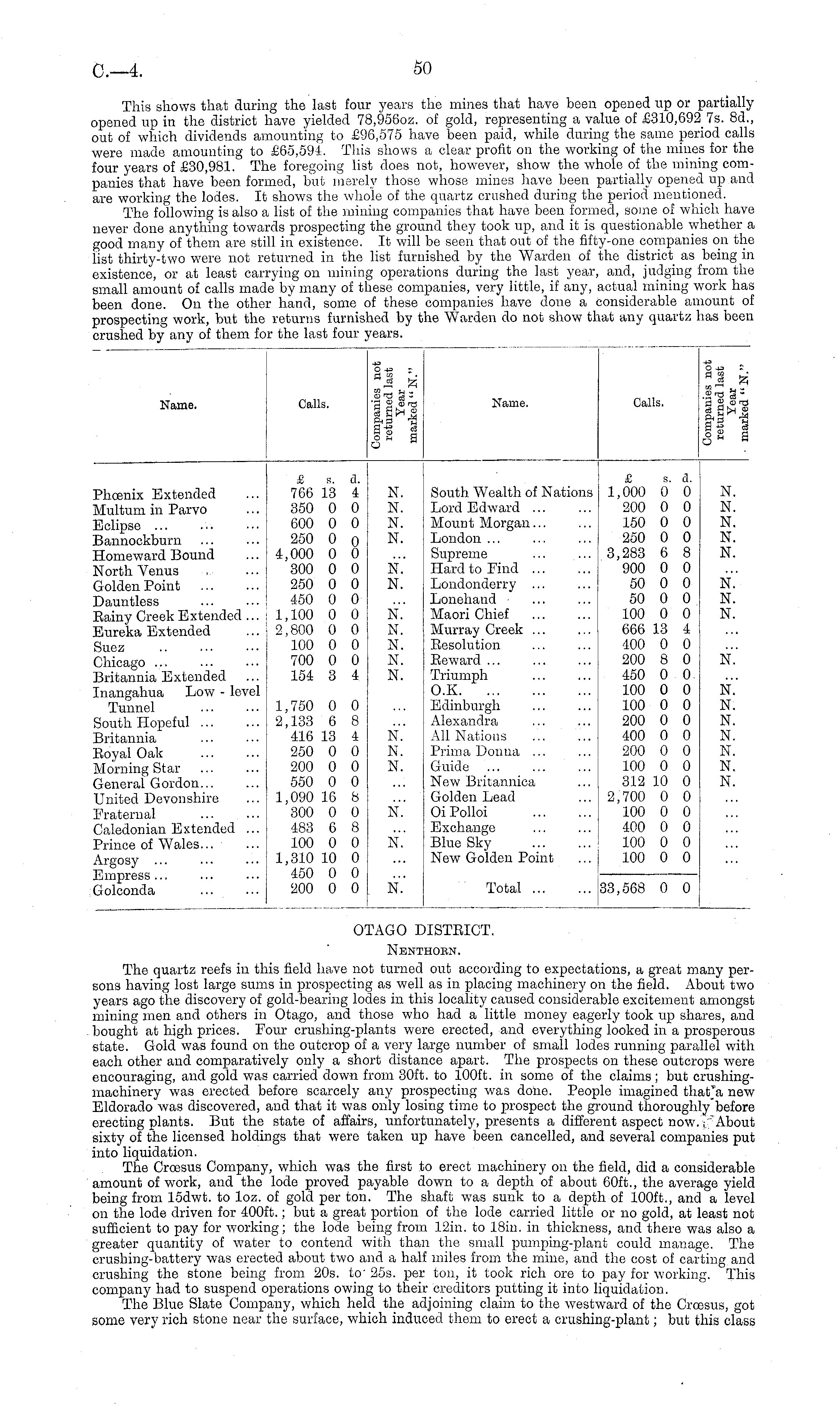 Name. Calls. rj in o " Name. Calls. .2 fl« : m Phoenix Extended Multum in Parvo Eclipse ... Bannockburn Homeward Bound North Venus Golden Point Dauntless Eainy Creek Extended ... Eureka Extended & s. 766 13 350 0 600 0 250 0 4,000 0 300 0 250 0 450 0 1,100 0 2,800 0 100 0 700 0 154 3 a. 4 0 0 0 0 0 0 0 0 0 0 0 4 N. N. N. N. N.' N. South Wealth of Nations Lord Edward ... Mount Morgan... London ... Supreme Hard to Find Londonderry Lonehand Maori Chief Murray Creek ... Resolution Beward ... Triumph O.K. Edinburgh Alexandra All Nations Priina Donna ... Guide New Britannica Golden Lead OiPolloi Exchange Blue Sky New Golden Point £ b. d. 1,000 0 0 200 0 0 150 0 0 250 0 0 3,283 6 8 900 0 0 50 0 0 50 0 0 100 0 0 666 13 4 400 0 0 200 8 0 450 0 0 100 0 0 100 0 0 200 0 0 400 0 0 200 0 0 100 0 0 312 10 0 2,700 0 0 100 0 0 400 0 0 100 0 0 100 0 0 N. N. N. N. N. N. N. N. Suez Chicago ... Britannia Extended Inangalma Low - level Tunnel South Hopeful Britannia Eoyal Oak Morning Star General Gordon... United Devonshire Fraternal Caledonian Extended ... Prince of Wales... N. N. N. N. N. N." 1,750 0 2,133 6 416 13 250 0 200 0 550 0 1,090 16 300 0 483 6 100 0 1,310 10 450 0 200 0 0 8 4 0 0 0 8 0 8 0 0 0 0 N. N. N. N. N. N. N. N. N. N. N.' N. Argosy ... Empress... Golconda nV Total 33,568 0 0