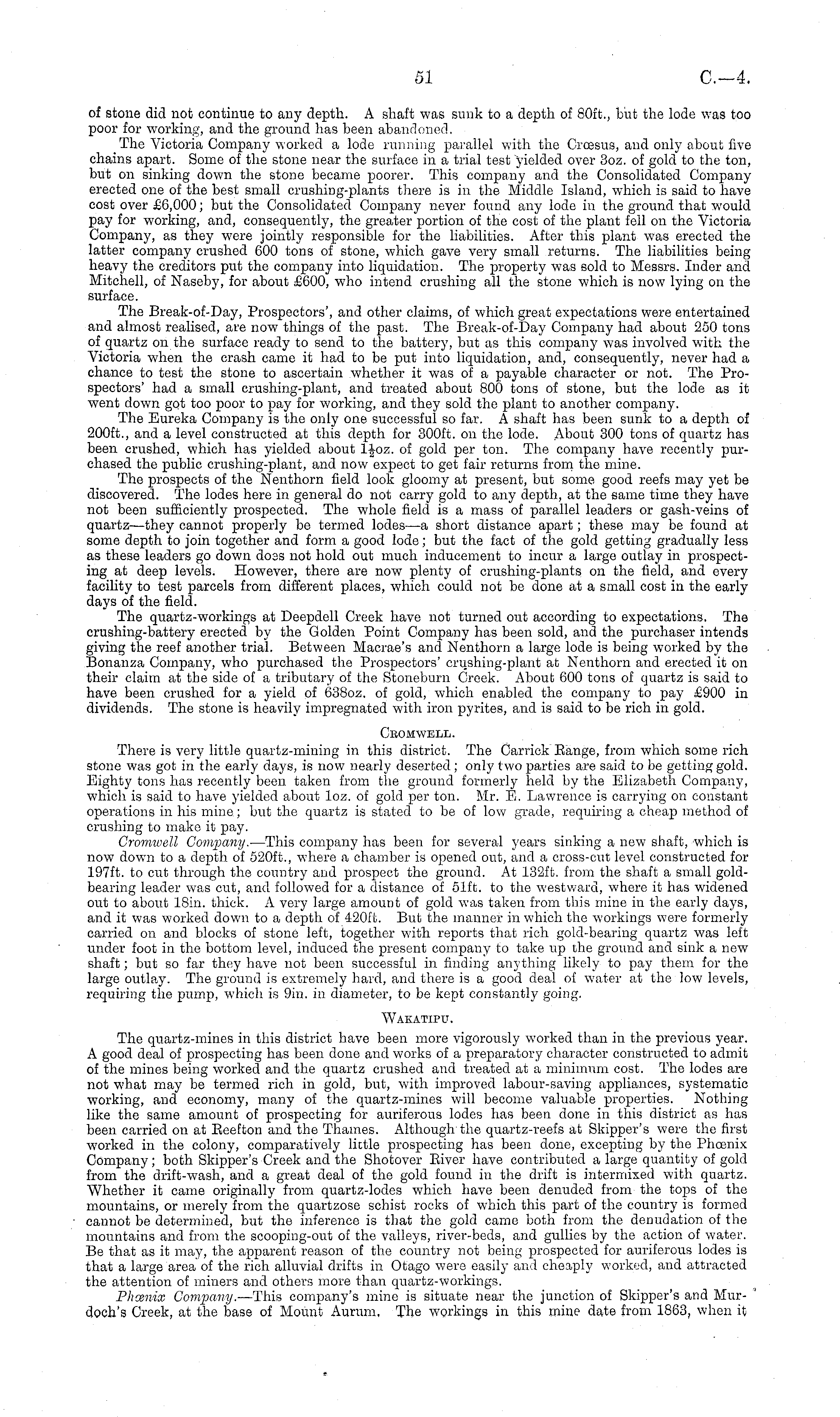 of stone did not continue to any depth. A shaft was sunk to a depth of 80ft., but the lode was too poor for working, and the ground has been abandoned. The Victoria Company worked a lode running parallel with the Croesus, and only about five chains apart. Some of the stone near the surface in a trial test yielded over 3oz. of gold to the ton, but on sinking down the stone became poorer. This company and the Consolidated Company erected one of the best small crushing-plants there is in the Middle Island, which is said to have cost over £6,000; but the Consolidated Company never found any lode in the ground that would pay for working, and, consequently, the greater portion of the cost of the plant fell on the Victoria Company, as they were jointly responsible for the liabilities. After this plant was erected the latter company crushed 600 tons of stone, which gave very small returns. The liabilities being heavy the creditors put the company into liquidation. The property was sold to Messrs. Inder and Mitchell, of Naseby, for about £600, who intend crushing all the stone which is now lying on the surface. The Break-of-Day, Prospectors', and other claims, of which great expectations were entertained and almost realised, are now things of the past. The Break-of-Day Company had about 250 tons of quartz on the surface ready to send to the battery, but as this company was involved with the Victoria when the crash came it had to be put into liquidation, and, consequently, never had a chance to test the stone to ascertain whether it was of a payable character or not. The Prospectors' had a small crushing-plant, and treated about 800 tons of stone, but the lode as it went down got too poor to pay for working, and they sold the plant to another company. The Eureka Company is the only one successful so far. A shaft has been sunk to a depth of 200 ft., and a level constructed at this depth for 300 ft. on the lode. About 300 tons of quartz has been crushed, which has yielded about lfoz. of gold per ton. The company have recently purchased the public crushing-plant, and now expect to get fair returns from the mine. The prospects of the Nenthorn field look gloomy at present, but some good reefs may yet be discovered. The lodes here in general do not carry gold to any depth, at the same time they have not been sufficiently prospected. The whole field is a mass of parallel leaders or gash-veins of quartz—they cannot properly be termed lodes —a short distance apart; these may be found at some depth to join together and form a good lode; but the fact of the gold getting gradually less as these leaders go down does not hold out much inducement to incur a large outlay in prospecting at deep levels. However, there are now plenty of crushing-plants on the field, and every facility to test parcels from different places, which could not be done at a small cost in the early days of the field. The quartz-workings at Deepdell Creek have not turned out according to expectations. The crushing-battery erected by the Golden Point Company has been sold, and the purchaser intends giving the reef another trial. Between Macrae's and Nenthorn a large lode is being worked by the Bonanza Company, who purchased the Prospectors' crushing-plant at Nenthorn and erected it on their claim at the side of a tributary of the Stoneburn Creek. About 600 tons of quartz is said to have been crushed for a yield of 6380z. of gold, which enabled the company to pay £900 in dividends. The stone is heavily impregnated with iron pyrites, and is said to be rich in gold. Ceomwell. There is very little quartz-mining in this district. The Carrick Eange, from which some rich stone was got in the early days, is now nearly deserted ; only two parties are said to be getting gold. Eighty tons has recently been taken from the ground formerly held by the Elizabeth Company, which is said to have yielded about loz. of gold per ton. Mr. E. Lawrence is carrying on constant operations in his mine; but the quartz is stated to be of low grade, requiring a cheap method of crushing to make it pay. Cromwell Company. —This company has been for several years sinking a new shaft, which is now down to a depth of 520 ft., where a chamber is opened out, and a cross-cut level constructed for 197 ft. to cut through the country and prospect the ground. At 132 ft. from the shaft a small goldbearing leader was cut, and followed for a distance of 51ft. to the westward, where it has widened out to about 18in, thick. A very large amount of gold was taken from this mine in the early days, and it was worked down to a depth of 420 ft. But the manner in which the workings were formerly carried on and blocks of stone left, together with reports that rich gold-bearing quartz was left under foot in the bottom level, induced the present company to take up the ground and sink a new shaft; but so far they have not been successful in finding anything likely to pay them for the large outlay. The ground is extremely hard, and there is a good deal of water at the low levels, requiring the pump, which is 9in. in diameter, to be kept constantly going. Wakatipu. The quartz-mines in this district have been more vigorously worked than in the previous year. A good deal of prospecting has been done and works of a preparatory character constructed to admit of the mines being worked and the quartz crushed and treated at a minimum cost. The lodes are not what may be termed rich in gold, but, with improved labour-saving appliances, systematic working, and economy, many of the quartz-mines will become valuable properties. Nothing like the same amount of prospecting for auriferous lodes has been done in this district as has been carried on at Eeefton and the Thames. Although the quartz-reefs at Skipper's were the first worked in the colony, comparatively little prospecting has been done, excepting by the Phoenix Company; both Skipper's Creek and the Shotover Eiver have contributed a large quantity o
