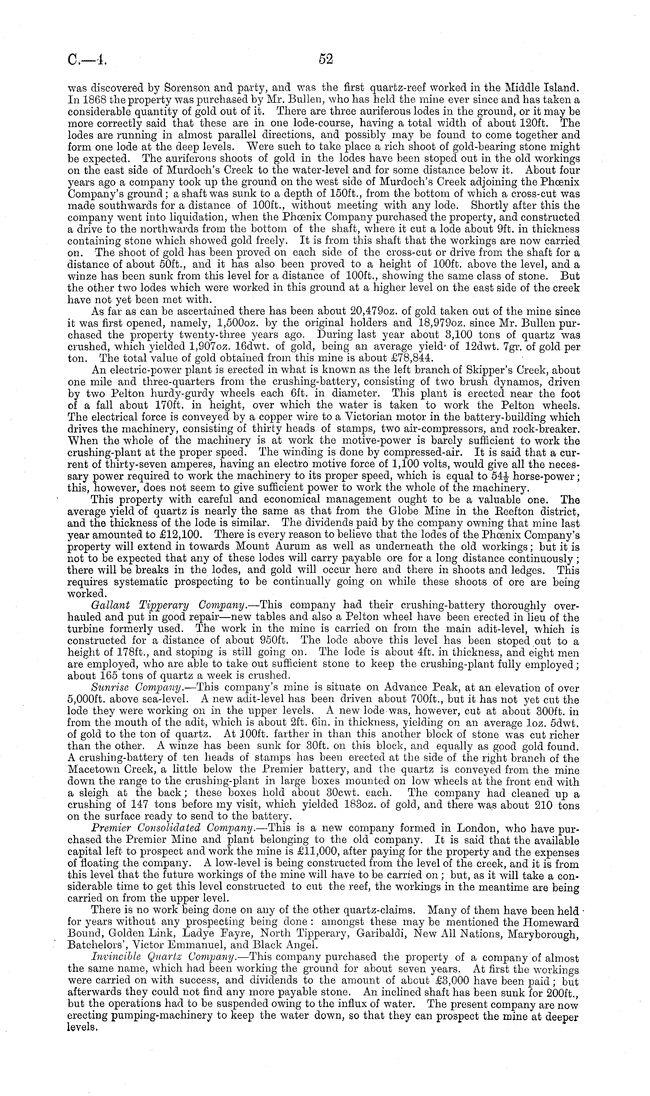 was discovered by Sorenson and party, and was the first quartz-reef worked in the Middle Island. In 1868 the property was purchased by Mr. Bullen, who has held the mine ever since and has taken a considerable quantity of gold out of it. There are three auriferous lodes in the ground, or it may be more correctly said that these are in one lode-course, having a total width of about 120 ft. The lodes are running in almost parallel directions, and possibly may be found to come together and form one lode at the deep levels. Were such to take place a rich shoot of gold-bearing stone might be expected. The auriferous shoots of gold in the lodes have been stoped out in the old workings on the east side of Murdoch's Creek to the water-level and for some distance below it. About four years ago a company took up the ground on the west side of Murdoch's Creek adjoining the Phoenix Company's ground; a shaft was sunk to a depth of 150 ft., from the bottom of which a cross-cut was made southwards for a distance of 100 ft., without meeting with any lode. Shortly after this the company went into liquidation, when the Phcenix Company purchased the property, and constructed a drive to the northwards from the bottom of the shaft, where it cut a lode about 9ft. in thickness containing stone which showed gold freely. It is from this shaft that the workings are now carried on. The shoot of gold has been proved on each side of the cross-cut or drive from the shaft for a distance of about 50ft., and it has also been proved to a height of 100 ft. above the level, and a winze has been sunk from this level for a distance of 100 ft., showing the same class of stone. But the other two lodes which were worked in this ground at a higher level on the east side of the creek have not yet been met with. As far as can be ascertained there has been about 20,4790z. of gold taken out of the mine since it was first opened, namely, 1,5000z. by the original holders and 18,9790z. since Mr. Bullen purchased the property twenty-three years ago. During last year about 3,100 tons of quartz was crushed, which yielded 1,9070z. 16dwt. of gold, being an average yield' of 12dwt. 7gr. of gold per ton. The total value of gold obtained from this mine is about £78,844. An electric-power plant is erected in what is known as the left branch of Skipper's Creek, about one mile and three-quarters from the crushing-battery, consisting of two brush dynamos, driven by two Pelton hurdy-gurdy wheels each 6ft. in diameter. This plant is erected near the foot of a fall about 170 ft. in height, over which the water is taken to work the Pelton wheels. The electrical force is conveyed by a copper wire to a Victorian motor in the battery-building which drives the machinery, consisting of thirty heads of stamps, two air-compressors, and rock-breaker. When the whole of the machinery is at work the motive-power is barely sufficient to work the crushing-plant at the proper speed. The winding is done by compressed-air. It is said that a current of thirty-seven amperes, having an electro motive force of 1,100 volts, would give all the necessary power required to work the machinery to its proper speed, which is equal to 54f horse-power; this, however, does not seem to give sufficient power to work the whole of the machinery. This property with careful and economical management ought to be a valuable one. The average yield of quartz is nearly the same as that from the Globe Mine in the Eeefton district, and the thickness of the lode is similar. The dividends paid by the company owning that mine last year amounted to £12,100. There is every reason to believe that the lodes of the Phcenix Company's property will extend in towards Mount Aurum as well as underneath the old workings; but it is not to be expected that any of these lodes will carry payable ore for a long distance continuously ; there will be breaks in the lodes, and gold will occur here and there in shoots and ledges. This requires systematic prospecting to be continually going on while these shoots of ore are being w r orked. Gallant Tipperary Company. —This company had their crushing-battery thoroughly overhauled and put in good repair—new tables and also a Pelton wheel have been erected in lieu of the turbine formerly used. The work in the mine is carried on from the main adit-level, which is constructed for a distance of about 950 ft. The lode above this level has been stoped out to a height of 178 ft., and stoping is still going on. The lode is about 4ft. in thickness, and eight men are employed, who are able to take out sufficient stone to keep the crushing-plant fully employed; about 165 tons of quartz a w r eck is crushed. Sunrise Company. —This company's mine is situate on Advance Peak, at an elevation of over 5,000 ft. above sea-level. A new adit-level has been driven about 700 ft., but it has not yet cut the lode they were working on in the upper levels. A new lode was, however, cut at about 300 ft. in from the mouth of the adit, which is about 2ft. 6in. in thickness, yielding on an average loz. sdwt. of gold to the ton of quartz. At 100 ft. farther in than this another block of stone was cut richer than the other. A winze has been sunk for 30ft. on this block, and equally as good gold found. A crushing-battery of ten heads of stamps has been erected at the side of the right branch of the Macetown Creek, a little below the Premier battery, and the quartz is conveyed from the mine down the range to the crushing-plant in large boxes mounted on low wheels at the front end with a sleigh at the back; these boxes hold about 30cwt. each. The company had cleaned up a crushing of 147 tons before my visit, which yielded 183oz. of gold, and there was about 210 tons on the surface ready to send to the battery. Premier Consolidated Company. —This is a new company formed in London, who have purchased the Premier Mine and plant belonging to the old company. It is said that the available capital left t