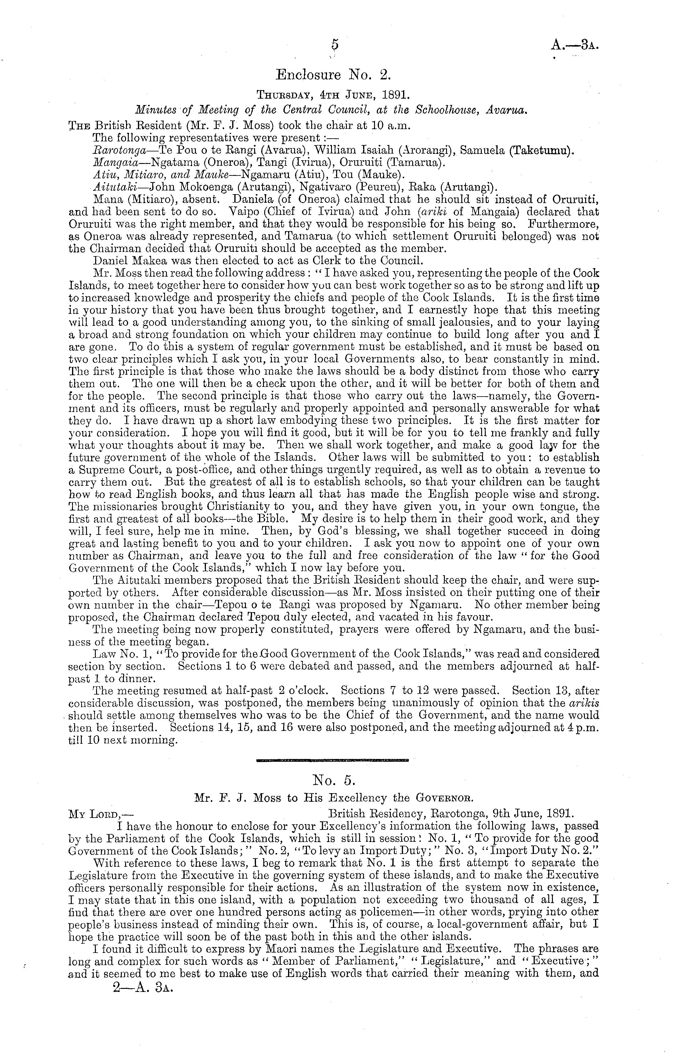 No. 5. Mr. F. J. Moss to His Excellency the Govebnoe. My Loud, — British Eesidency, Earotonga, 9th June, 1891. I have the honour to enclose for your Excellency's information the following laws, passed by the Parliament of the Cook Islands, which is still in session: No. 1, " To provide for the good Government of the Cook Islands;" No. 2, "To levy an Import Duty;" No. 3, "Import Duty No. 2." "With reference to these laws, I beg to remark that No. 1 is the first attempt to separate the Legislature from the Executive in the governing system of these islands, and to make the Executive officers personally responsible for their actions. As an illustration of the system now in existence, I may state that in this one island, with a population not exceeding two thousand of all ages, I find that there are over one hundred persons acting as policemen —in other words, prying into other people's business instead of minding their own. This is, of course, a local-government affair, but I hope the practice will soon be of the past both in this and the other islands. I found it difficult to express by Maori names the Legislature and Executive. The phrases are long and complex for such words as " Member of Parliament," " Legislature," and "Executive; " and it seemed to me best to make use of English words that carried their meaning with them, and