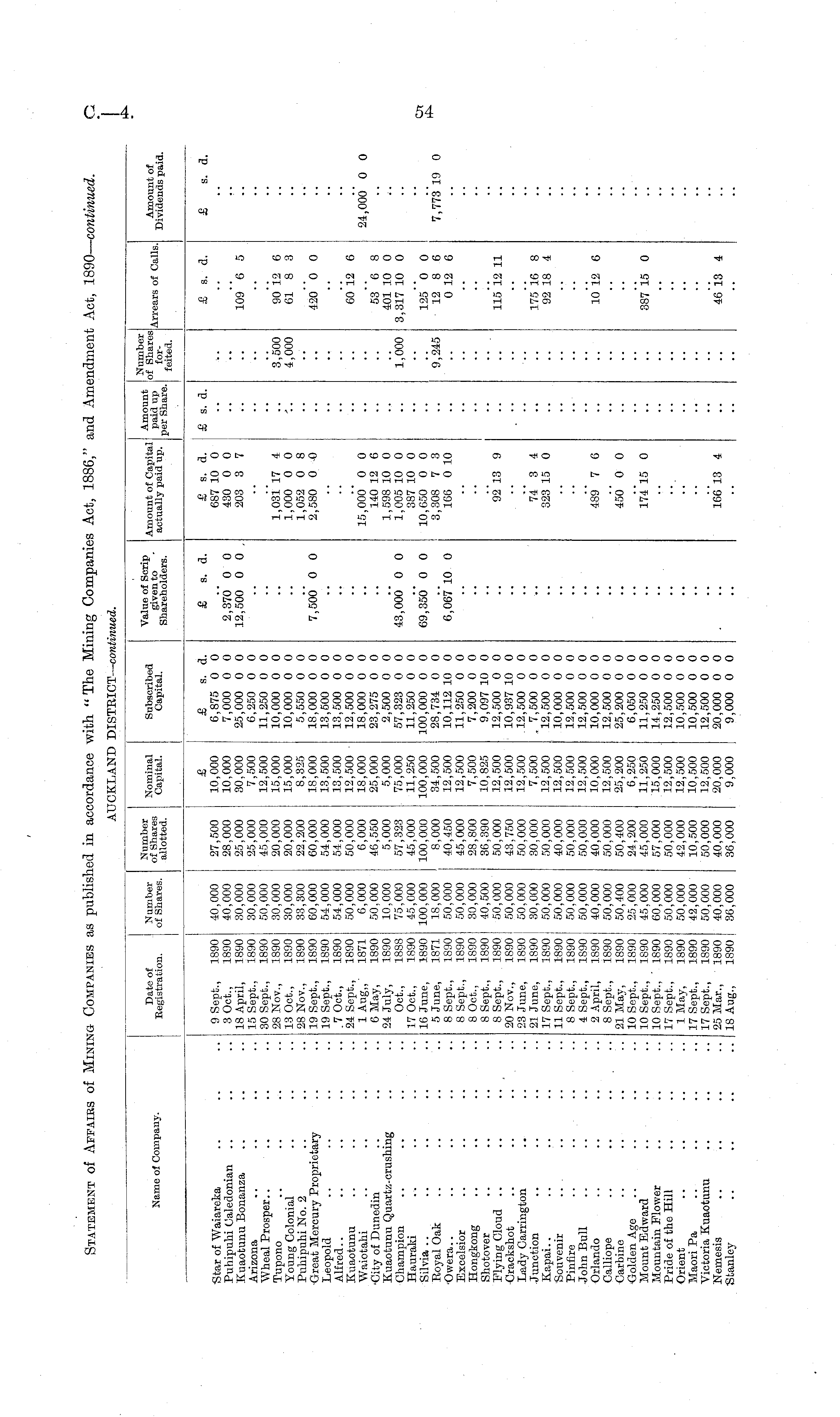 Name of Company. Date of Registration. Number of Shares. Number of Shares allotted. Nominal Capital. Subscribed Capital. Value of Scrip given to Shareholders. Amount of Capital actually paid up. Amount paid up per Share. ! Number ;of Shares forfeited. jrears of Calls. Amount of Dividends paid. Star of Waiareka Puhipuhi Caledonian Kuaotunu Bonanza Arizona Wheal Prosper.. Tupono Young Colonial Puhipuhi No. 2 Great Mercury Proprietary Leopold Alfred.. Kuaotunu Waiotahi •City of Dunedin Kuaotunu Quartz-crushing Champion Hauraki Silvia Royal Oak Owera.. Excelsior Hongkong Shotover Flying Cloud .. Crackshot Lady Carrington Junction Kapai Souvenir ... Pinfire John Bull Orlando Calliope Carbine ■Golden Age Mount Edward Mountain Flower Pride of the Hill Orient Maori Pa Victoria Kuaotunu Nemesis Stanley 9 Sept., 1890 3 Oct., 1890 18 April, 1890 15 Sept., 1890 30 Sept., 1890 28 Nov., 1890 13 Oct., 1890 28 Nov., 1890 19 Sept., 1890 19 Sept., 1890 7 Oct., 1890 24 Sept., 1890 1 Ang,,' 1871 6 May, 1890 24 July, 1890 Oct., 1888 17 Oct., 1890 16 June, 1890 5 June, 1871 8 Sept., 1890 8 Sept., 1890 8 Oct., 1890 8 Sept., 1890 8 Sept., 1890 20 Nov., 1890 23 June, 1890 21 June, 1890 17 Sept., 1890 11 Sept., 1890 8 Sept., 1890 4 Sept., 1890 2 April, 1890 8 Sept., 1890 21 May, 1890 10 Sept., 1890 10 Sept., 1890 10 Sept., ' 1890 17 Sept., 1890 1 May, 1890 17 Sept., 1890 17 Sept., 1890 25 Mar., 1890 18 Aug., 1890 40,000 40,000 30,000 30,000 50,000 30,000 30,000 33,300 60,000 54,000 54,000 50,000 6,000 50,000 10,000 75,000 45,000 100,000 18,000 50,000 50,000 30,000 40,500 50,000 50,000 50,000 30,000 50,000 50,000 50,000 50,000 40,000 50,000 50,400 25,000 45,000 60,000 50,000 50,000 42,000 50,000 40,000 36,000 27,500 28,000 25,000 25,000 45,000 20,000 20,000 22,200 60,000 54,000 54,000 50,000 6,000 46,550 5,000 57,323 45,000 100,000 8,000 40,450 45,000 28,800 36,390 50,000 43,750 50.000 30,000 50,000 40,000 50,000 50,000 40,000 50,000 50,400 24,200 45,000 57,000 50,000 42,000 10,500 50,000 40,000 36,000 10,000 10,000 30,000 7,500 12,500 15,000 15,000 8,325 18,000 13,500 13,500 12,500 ■ 18,000 25,000 5,000 75,000 11,250 100,000 34,500 12,500 12,500 7,500 10,825 12,500 12,500 12,500 7,500 12,500 12,500 12,500 12,500 10,000 12,500 25,200 6,250 11,250 15,000 12,500 12,500 10,500 12,500 20,000 9,000 £ s. d. 6,875 0 0 7,000 0 0 25,000 0 0 6,250 0 0 11,250 0 0 10,000 0 0 10,000 0 0 5,550 0 0 18,000 0 0 13,500 0 0 13,500 0 0 12,500 0 0 18,000 0 0 23,275 0 0 2,500 0 0 57,323 0 0 11,250 0 0 100,000 0 0 28,734 0 0 10,112 10 0 11,250 0 0 7,200 0 0 9,097 10 0 12,500 0 0 10,937 10 0 .12,500 0 0 7,500 0 0 12,500 0 0 10,000 0 0 12,500 0 0 12,500 0 0 10,000 0 0 12,500 0 0 25,200 0 0 6,050 0 0 11,250 0 0 14,250 0 0 12,500 0 0 10,500 0 0 10,500 0 0 12,500 0 0 20,000 0 0 9,000 0 0 & s. d. 2,370 0 0 12,500 0 0 7,500' 0 0 43,Oo6" 0 0 69,356' 0 0 6,06710 0 & s. a. 687 10 0 430 0 0 203 3 7 1,031 17 4 1,000 0 0 1,052 0 8 2,580 0 -0 15,000 0 0 140 12 6 1,598 10 0 1,005 10 0 387 10 0 10,650 0 0 3,308 7 3 166 0 10 £ s. d. 3,500 4,000 i,'6oo 9J 245 £ s. a. iO9"e 5 90"l2 6 61 8 3 420 0 0 6o'l2 6 53 6 8 401 10 0 3,317 10 0 125 0 0 12 8 6 0 12 6 & s. d. 24,000 0 0 7,773'l9 0 92 13 9 11512 11 74* 3 4 323 15 0 175 16 8 92 18 4 489' 7 6 1012 6 456' 0 0 174 15 0 387 15 0 " __ 166 13 4 4613 4