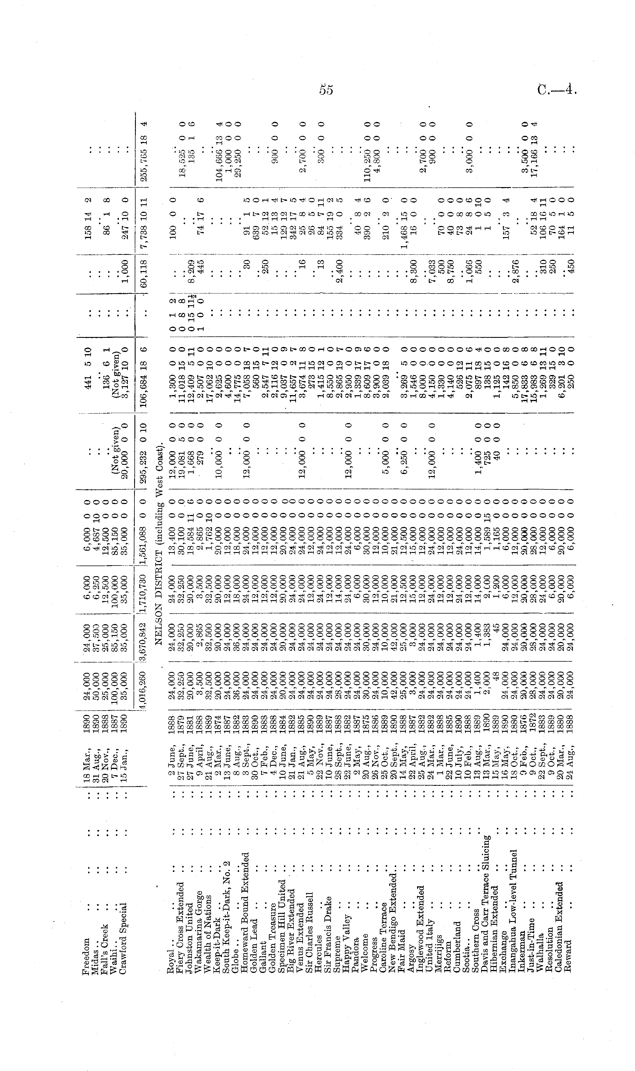 Freedom Midas Fall's Creek .. Waihi.. Crawford Special 18 Mar., 1S90 31 Aug., 1890 20 Nov., 1888 7 Dec, 1887 15 Jan., 1890 24,000 24,000 50,000 37,500 25,000 25.000 100,000 85i150 35,000 35,000 6,000 6,250 12,500 100,000 35,000 6,000 0 0 4,687 10 0 12,500 0 0 85,150 0 0 35,000 0 0 (Not given) 20,000 0 0 441 5 10 136 6 1 (Not given) 3,127 10 0 •• 158 14 2 86 1 8 1,000 247 10 0 ,016,260 |; 3,670,842 1,710,730 i 1,561,088 0 0 295,232 0 10 106,684 18 6 I I 60,118 I 7,738 10 11 I 255,765 18 4 Eoyal Fiery Cross Extended Johnston United Wakamarina Gorge Wealth of Nations Keep-it-Dark South Keep-it-Dark, No. 2 Globe Homeward Bound Extended Golden Lead Gallant Golden Treasure Specimen Hill United Big River Extended Venus Extended Sir Charles Russell Hercules Sir Francis Drake Supreme Happy Valley Pandora Welcome Progress Caroline Terrace New Bendigo Extended.. Fair Maid Argosy Inglewood Extended United Italy Merrijigs Reform Cumberland Scotia.. Southern Cross Davis and Carr Terrace Sluicing Hibernian Extended Exchange Inangahua Low-level Tunnel Inkerman Just-in-Time Walhalla Resolution Caledonian Extended Reward 2 June, 18S8 27 Sept., 1879 27 June, 1881 9 April, 18S8 21 Aug., 1889 2 Mar., 1874 13 June, 1887 8 Aug., 1882 3 Sept., 1883 30 Oct., 1890 7 Feb., 1888 4 Deo., 1888 10 June, 1884 21 Jan., 1882 21 Aug., 1885 5 May, 1890 22 Nov., 1889 10 June, 1887 28 Sept., 1888 22 June, 1882 2 May, 1887 20 Aug., 1875 26 Nov., 1886 25 Oct., 1889 20 Sept., 1890 14 May, 1888 22 April, 1887 25 Aug., 1882 24 Mar., 1882 1 Mar., 1888 22 June, 1885 10 July, 1890 10 Feb., 1888 13 Aug., 1889 13 Mar., 1890 15 May, 1S89 16 May, 1890 18 Oct., 1880 9 Feb., 1876 9 Oct., 1872 22 Sept., 1883 9 Oct., 1889 20 Mar., 1880 24 Aug., 1888 24,000 ! 32,250 20,000 3,500 32,500 20,000 24,000 36,000 24,000 24,000 24,000 24,000 20,000 ; 24,000 J 24,000 ! 24,000 24,000 24,000 28,000 24,000 24,000 30,000 24,000 10,000 42,000 25,000 3,000 24,000 24,000 24,000 24,000 i 24,000 24,000 1,400 2,000 48 24,000 24,000 20;000 J 28,000 24,000 24,000 20,000 24,000 NELSi ! 24,000 32,250 20,000 2,865 32,500 20,000 24,000 36,000 24,000 24,000 24,000 24,000 20,000 24,000 24,000 24,000 24,000 24,000 24,000 24,000 24,000 30,000 24,000 10,000 42,000 25,000 3,000 24,000 24,000 I 24,000 I 24,000 24,000 24,000 1.400 1,383 45 24,000 24,000 I 20,000 28,000 24,000 24,000 20,000 24,000 )N distr: 24,000 32,250 20,000 3,500 32,500 20,000 12,000 18,000 24,000 12,000 12,000 12,000 20,000 24,000 24,000 12,000 24,000 12,000 14,000 24,000 6,000 30,000 12,000 10,000 21,000 12,500 15,000 12,000 24,000 12,000 12,000 24,000 12,000 14,000 2, COO 1,200 6,000 12,000 20,000 28,000 24,000 6,000 20,000 6,000 [CT (including 13,400 0 0 30,100 0 0 18,584 11 6 2,865 0 0 1,762 10 0 20,000 0 0 12,000 0 0 18,000 0 0 24,000 0 0 12,000 0 0 12,000 0 0 12,000 0 0 20,000 0 0 24,000 0 0 24,000 0 0 12,000 0 0 24,000 0 0 12,000 0 0 12,000 0 0 24,000 0 0 6,000 0 0 30.000 0 0 12.000 0 0 10,000 0 0 21,000 0 0 12,500 0 0 15,000 0 0 12,000 0 0 24,000 0 0 12,000 0 0 12,000 0 0 24,000 0 0 12,000 0 0 14,000 0 0 1,589 15 0 1,165 0 0 6,000 0 0 12,000 0 0 20,000 0 0 2S.O0O 0 0 12,000 0 0 6,000 0 0 20,000 0 0 6,000 0 0 est Coast). 12,000 0 0 19,081 5 0 1,668 0 0 279 0 0 10,000 0 0 12,000 0 0 ■• i 12,000 0 0 .. I 12,000 0 0 1,300 0 0 11,018 15 0 12,409 5 11 2,507 0 0 17,062 10 0 2,025 0 0 4,600 0 0 14,775 0 0 7,058 18 7 560 15 0 2,547 7 11 2,116 12 0 • 9,037 0 9 11,657 2 7 3,674 11 8 273 15 0 1,415 12 1 8,550 0 0 2,865 19 7 2,950 0 0 1,339 17 9 8,609 17 6 3,900 0 0 2,039 18 0 0 12 0 8 8 0 15 11J] 10 0 •■ .. •• .. .. I •• i .. j 8*209 I 445 30 250 -16 J "is! 2*400 :: ! 100 0 0 j 74 17 6 91 1 5 639 7 0 52 12 1 15 13 4 129 12 7 342 17 5 25 8 4 26 5 0 84 7 11 155 19 2 334 0 5 40 8 4 390 2 6 18,525 0 0 135 1 6 104,666 13 4 1,000 0 0 29,250 0 0 900 0 0 2,700 0 0 300 0 0 110,251)' 0 0 4,800 0 0 5,000 0 0 210 2 0 G,25<)' 0 0 3,269 5 0 1,546 0 0 8,000 0 0 4,150 0 0 1,330 0 0 4,140 0 0 526 12 0 2,075 11 6 897 18 4 138 15 0 1,125 0 0 142 16 8 5,850 0 0 17,833 6 8 15,983 6 8 1,269 13 11 329 15 0 6,201 3 10 250 0 0 8*300 ! 1,468 15 0 16 0 0 12,000 0 0 7,033 ! 500 8,750 1,066 550 70 0 0 40 0 0 73 8 0 24 8 6 1 0 10 15 0 2,700 0 0 900 0 0 1,400 0 0 725 0 0 40 0 0 3,000 0 0 - * * 2,876 ' *310 250 - 450 ! 157**3 4 52 18 4 106 16 11 70 5 0 164 1 0 11 5 0 I 3,500* 0 0 17,160 13 4 ••