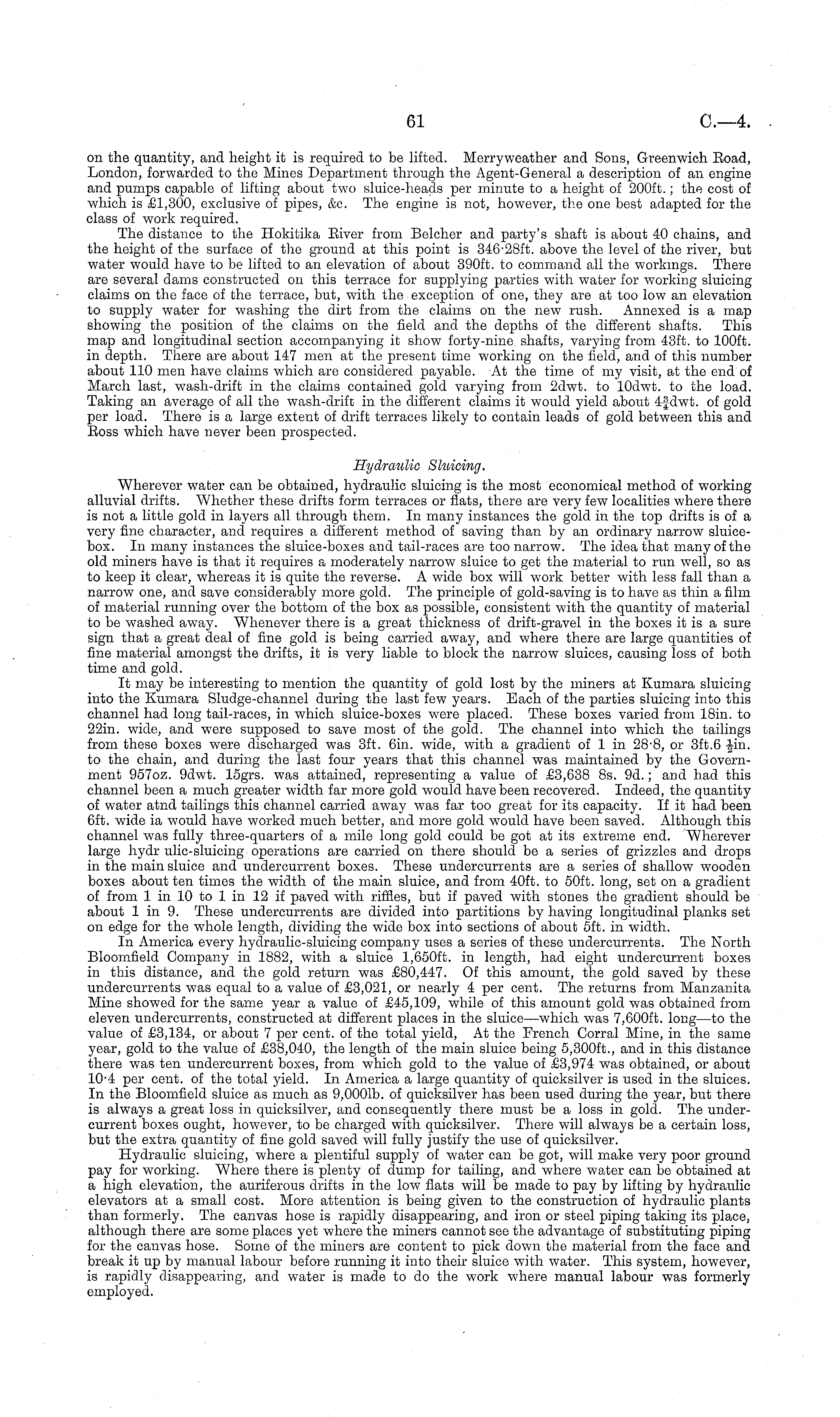 on the quantity, and height it is required to be lifted. Merryweather and Sons, Greenwich Boad, London, forwarded to the Mines Department through the Agent-General a description of an engine and pumps capable of lifting about two sluice-heads per minute to a height of 200 ft.; the cost of which is £1,300, exclusive of pipes, &c. The engine is not, however, the one best adapted for the class of work required. The distance to the Hokitika Biver from Belcher and party's shaft is about 40 chains, and the height of the surface of the ground at this point is 346-28 ft. above the level of the river, but water would have to be lifted to an elevation of about 390 ft. to command all the workings. There are several dams constructed on this terrace for supplying parties with water for working sluicing claims on the face of the terrace, but, with the exception of one, they are at too low an elevation to supply water for washing the dirt from the claims on the new rush. Annexed is a map showing the position of the claims on the field and the depths of the different shafts. This map and longitudinal section accompanying it show forty-nine shafts, varying from 43ft. to 100 ft. in depth. There are about 147 men at the present time working on the field, and of this number about 110 men have claims which are considered payable. At the time of my visit, at the end of March last, wash-drift in the claims contained gold varying from 2dwt. to lOdwt. to the load. Taking an average of all the wash-drift in the different claims it would yield about 4-fdwt. of gold per load. There is a large extent of drift terraces likely to contain leads of gold between this and Boss which have never been prospected. Hydraulic Sluicing. Wherever water can be obtained, hydraulic sluicing is the most economical method of working alluvial drifts. Whether these drifts form terraces or flats, there are very few localities where there is not a little gold in layers all through them. In many instances the gold in the top drifts is of a very fine character, and requires a different method of saving than by an ordinary narrow sluicebox. In many instances the sluice-boxes and tail-races are too narrow. The idea that many of the old miners have is that it requires a moderately narrow sluice to get the material to run well, so as to keep it clear, whereas it is quite the reverse. A wide box will work better with less fall than a narrow one, and save considerably more gold. The principle of gold-saving is to have as thin a film of material running over the bottom of the box as possible, consistent with the quantity of material to be washed away. Whenever there is a great thickness of drift-gravel in the boxes it is a sure sign that a great deal of fine gold is being carried away, and where there are large quantities of fine material amongst the drifts, it is very liable to block the narrow sluices, causing loss of both time and gold. It may be interesting to mention the quantity of gold lost by the miners at Kumara sluicing into the Kumara Sludge-channel during the last few years. Each of the parties sluicing into this channel had long tail-races, in which sluice-boxes were placed. These boxes varied from 18in. to 22in. wide, and were supposed to save most of the gold. The channel into which the tailings from these boxes were discharged was 3ft. 6in. wide, with a gradient of 1 in 28-8, or 3ft.6 Jin. to the chain, and during the last four years that this channel was maintained by the Government 9570z. 9dwt. 15grs. was attained, representing a value of £3,638 Bs. 9d.; and had this channel been a much greater width far more gold would have been recovered. Indeed, the quantity of water atnd tailings this channel carried away was far too great for its capacity. If it had been 6ft. wide ia would have worked much better, and more gold would have been saved. Although this channel was fully three-quarters of a mile long gold could be got at its extreme end. Wherever large hydr ulic-sluicing operations are carried on there should be a series of grizzles and drops in the main sluice and undercurrent boxes. These undercurrents are a series of shallow wooden boxes about ten times the width of the main sluice, and from 40ft. to 50ft. long, set on a gradient of from 1 in 10 to 1 in 12 if paved with riffles, but if paved with stones the gradient should be about 1 in 9. These undercurrents are divided into partitions by having longitudinal planks set on edge for the whole length, dividing the wide box into sections of about sft. in width. In America every hydraulic-sluicing company uses a series of these undercurrents. The North Bloomfield Company in 1882, with a sluice 1,650 ft. in length, had eight undercurrent boxes in this distance, and the gold return was £80,447. Of this amount, the gold saved by these undercurrents was equal to a value of £3,021, or nearly 4 per cent. The returns from Manzanita Mine showed for the same year a value of £45,109, while of this amount gold was obtained from eleven undercurrents, constructed at different places in the sluice—which was 7,600 ft. long—to the value of £3,134, or about 7 per cent, of the total yield, At the French Corral Mine, in the same year, gold to the value of £38,040, the length of the main sluice being 5,300 ft., and in this distance there was ten undercurrent boxes, from which gold to the value of £3,974 was obtained, or about 10-4 per cent, of the total yield. In America a large quantity of quicksilver is used in the sluices. In the Bloomfield sluice as much as 9,0001b. of quicksilver has been used during the year, but there is always a great loss in quicksilver, and consequently there must be a loss in gold. The undercurrent boxes ought, however, to be charged with quicksilver. There will always be a certain loss, but the extra quantity of fine gold saved will fully justify the use of quicksilver. Hydraulic sluicing, where a plentiful supply of water can be got, will make very poor ground