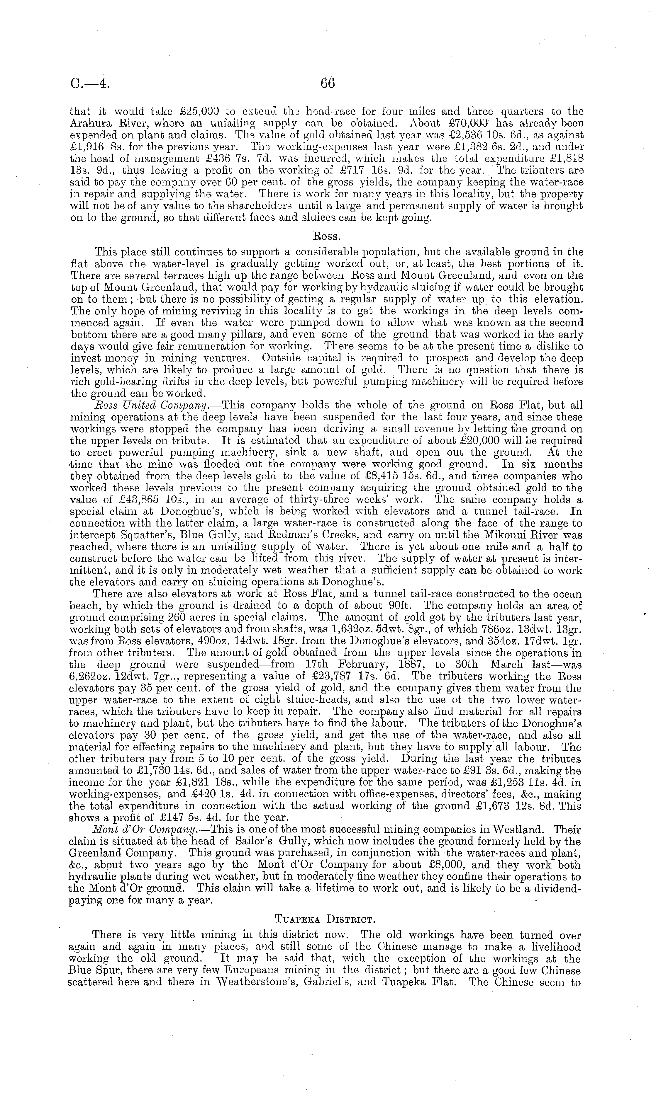 that it would take £25,000 to extend the head-race for four miles and three quarters to the Arahura Biver, where an unfailing supply can be obtained. About £70,000 has already been expended on plant and claims. The value of gold obtained last year was £2,536 10s. 6d., as against £1,916 Bs. for the previous year. The working-expenses last year were £1,382 6s. 2d., and under the head of management £436 7s. 7d. was incurred, which makes the total expenditure £1,818 13s. 9d., thus leaving a profit on the working of £717 16s. 9d. for the year. The tributers are said to pay the company over 60 per cent, of the gross yields, the company keeping the water-race in repair and supplying the water. There is work for many years in this locality, but the property will not be of any value to the shareholders until a large and permanent supply of water is brought on to the ground, so that different faces and sluices can be kept going. Boss. This place still continues to support a considerable population, but the available ground in the flat above the w r ater-level is gradually getting worked out, or, at least, the best portions of it. There are several terraces high up the range between Boss and Mount Greenland, and even on the top of Mount Greenland, that would pay for working by hydraulic sluicing if water could be brought on to them; but there is no possibility of getting a regular supply of water up to this elevation. The only hope of mining reviving in this locality is to get the workings in the deep levels commenced again. If even the water were pumped down to allow what was known as the second bottom there are a good many pillars, and even some of the ground that was worked in the early days would give fair remuneration for working. There seems to be at the present time a dislike to invest money in mining ventures. Outside capital is required to prospect and develop the deep levels, which are likely to produce a large amount of gold. There is no question that there is rich gold-bearing drifts in the deep levels, but powerful pumping machinery will be required before the ground can be worked. Boss United Company. —This company holds the whole of the ground on Boss Flat, but all mining operations at the deep levels have been suspended for the last four years, and since these workings were stopped the company has been deriving a small revenue by letting the ground on the upper levels on tribute. It is estimated that an expenditure of about £20,000 will be required to erect powerful pumping machinery, sink a new shaft, and open out the ground. At the •time that the mine was flooded out the company were working good ground. In six months they obtained from the deep levels gold to the value of £8,415 15s. 6d., and three companies who worked these levels previous to the present company acquiring the ground obtained gold to the value of £43,865 10s., in an average of thirty-three weeks' work. The same company holds a special claim at Donoghue's, which is being worked with elevators and a tunnel tail-race. In connection with the latter claim, a large water-race is constructed along the face of the range to intercept Squatter's, Blue Gully, and Bedman's Creeks, and carry on until the Mikonui Biver was reached, where there is an unfailing supply of water. There is yet about one mile and a half to construct before the water can be lifted from this river. The supply of water at present is intermittent, and it is only in moderately wet weather that a sufficient supply can be obtained to work the elevators and carry on sluicing operations at Donoghue's. There are also elevators at work at Boss Flat, and a tunnel tail-race constructed to the ocean beach, by which the ground is drained to a depth of about 90ft. The company holds an area of ground comprising 260 acres in special claims. The amount of gold got by the tributers last year, working both sets of elevators and from shafts, was 1,6320z. sdwt. Bgr., of which 7860z. 13dwt. 13gr. was from Boss elevators, 4900z. 14dwt. 18gr. from the Donoghue's elevators, and 3540z. 17dwt. lgr. from other tributers. The amount of gold obtained from the upper levels since the operations in the deep ground were suspended —from 17th February, 1887, to 30th March last—was 6,2620z. 12dwt. 7gr.., representing a value of £23,787 17s. 6d. The tributers working the Boss elevators pay 35 per cent, of the gross yield of gold, and the company gives them water from the upper water-race to the extent of eight sluice-heads, and also the use of the two lower waterraces, which the tributers have to keep in repair. The company also find material for all repairs to machinery and plant, but the tributers have to find the labour. The tributers of the Donoghue's elevators pay 30 per cent, of the gross yield, and get the use of the water-race, and also all material for effecting repairs to the machinery and plant, but they have to supply all labour. The other tributers pay from sto 10 per cent, of the gross yield. During the last year the tributes amounted to £1,730 14s. 6d., and sales of water from the upper water-race to £91 3s. 6d., making the income for the year £1,821 18s., while the expenditure for the same period, was £1,253 lis. 4d. in working-expenses, and £420 Is. 4d. in connection with office-expenses, directors' fees, &c, making the total expenditure in connection with the actual working of the ground £1,673 12s. Bd. This shows a profit of £147 ss. 4d. for the year. Mont dOr Company. —This is one of the most successful mining companies inWestland. Their claim is situated at the head of Sailor's Gully, which now includes the ground formerly held by the Greenland Company. This ground was purchased, in conjunction with the water-races and plant, &c, about two years ago by the Mont dOr Company for about £8,000, and they work both hydraulic plants during wet weather, but in moderately fine weather they confine their operations to the Mont dOr ground. This clai