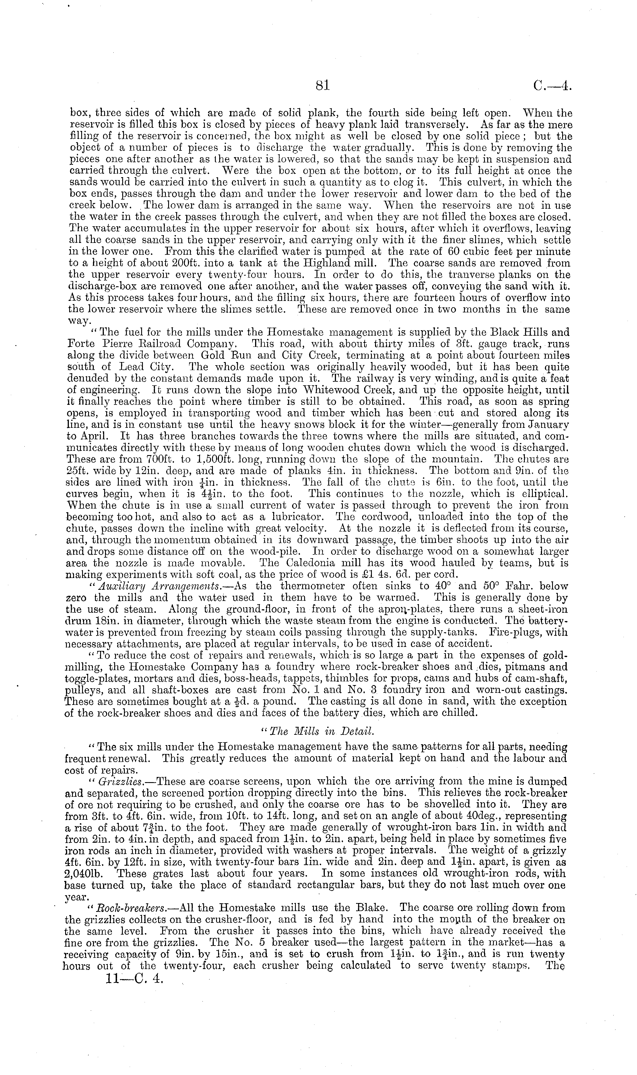 box, three sides of which are made of solid plank, the fourth side being left open. When the reservoir is filled this box is closed by pieces of heavy plank laid transversely. As far as the mere filling of the reservoir is concerned, the box might as well be closed by one solid piece ; but the object of a number of pieces is to discharge the water gradually. This is done by removing the pieces one after another as the water is lowered, so that the sands may be kept in suspension and carried through the culvert. Were the box open at the bottom, or to its full height at once the sands would be carried into the culvert in such a quantity as to clog it. This culvert, in which the box ends, passes through the dam and under the lower reservoir and lower dam to the bed of the creek below. . The lower dam is arranged in the same way. When the reservoirs are not in use the water in the creek passes through the culvert, and when they are not filled the boxes are closed. The water accumulates in the upper reservoir for about six hours, after which it overflows, leaving all the coarse sands in the upper reservoir, and carrying only with it the finer slimes, which settle in the lower one. From this the clarified water is pumped at the rate of 60 cubic feet per minute to a height of about 200 ft. into a tank at the Highland mill. The coarse sands are removed from the upper reservoir every twenty-four hours. In order to do this, the tranverse planks on the discharge-box are removed one after another, and the water passes off, conveying the sand with it. As this process takes four hours, and the filling six hours, there are fourteen hours of overflow into the lower reservoir where the slimes settle. These are removed once in two months in the same way. " The fuel for the mills under the Homestake management is supplied by the Black Hills and Forte Pierre Eailroad Company. This road, with about thirty miles of 3ft, gauge track, runs along the divide between Gold Bun and City Creek, terminating at a point about fourteen miles south of Lead City. The whole section was originally heavily wooded, but it has been quite denuded by the constant demands made upon it. The railway is very winding, and is quite a feat of engineering. It runs down the slope into Whitewood Creek, and up the opposite height, until it finally reaches the point where timber is still to be obtained. This road, as soon as spring opens, is employed in transporting wood and timber which has been cut and stored along its line, and is in constant use until the heavy snows block it for the winter—generally from January to April. It has three branches towards the three towns where the mills are situated, and communicates directly with these by means of long wooden chutes down which the wood is discharged. These are from 700 ft. to 1,500 ft. long, running down the slope of the mountain. The chutes are 25ft. wide by 12in. deep, and are made of planks 4in. in thickness. The bottom and 9in. of the sides are lined with iron |-in. in thickness. The fall of the chute is 6in. to the foot, until the curves begin, when it is 4-Jin. to the foot. This continues to the nozzle, which is elliptical. When the chute is in use a small current of water is passed through to prevent the iron from becoming too hot, and also to act as a lubricator. The cordwood, unloaded into the top of the chute, passes down the incline with great velocity. At the nozzle it is deflected from its course, and, through the momentum obtained in its downward passage, the timber shoots up into the air and drops some distance off on the wood-pile. In order to discharge wood on a somewhat larger area the nozzle is made movable. The Caledonia mill has its wood hauled by teams, but is making experiments with soft coal, as the price of wood is £1 4s. 6d. per cord. " Auxiliary Arrangements. —As the thermometer often sinks to 40° and 50° Fahr. below zero the mills and the water used in them have to be warmed. This is generally done by the use of steam. Along the ground-floor, in front of the aproii-plates, there runs a sheet-iron drum 18in. in diameter, through which the waste steam from the engine is conducted. The batterywater is prevented from freezing by steam coils passing through the supply-tanks. Fire-plugs, with necessary attachments, are placed at regular intervals, to be used in case of accident. "To reduce the cost of repairs and renewals, which is so large a part in the expenses of goldmilling, the Homestake Company has a foundry where rock-breaker shoes and dies, pitmans and toggle-plates, mortars and dies, boss-heads, tappets, thimbles for props, cams and hubs of cam-shaft, pulleys, and all shaft-boxes are cast from No. 1 and No. 3 foundry iron and worn-out castings. These are sometimes bought at a -|-d. a pound. The casting is all done in sand, with the exception of the rock-breaker shoes and dies and faces of the battery dies, which are chilled. " The Mills in Detail. " The six mills under the Homestake management have the same: patterns for all parts, needing frequent renewal. This greatly reduces the amount of material kept on hand and the labour and cost of repairs. " Grizzlies. —These are coarse screens, upon which the ore arriving from the mine is dumped and separated, the screened portion dropping directly into the bins. This relieves the rock-breaker of ore not requiring to be crushed, and only the coarse ore has to be shovelled into it. They are from 3ft. to 4ft. 6in. wide, from 10ft. to 14ft. long, and set on an angle of about 40deg., representing a rise of about 7fin. to the foot. They are made generally of wrought-iron bars lin. in width and from 2in. to lin. in depth, and spaced from lfin. to 2in. apart, being held in place by sometimes five iron rods an inch in diameter, provided with washers at proper intervals. The weight of a grizzly 4ft. 6in. by 12ft. in size, with twenty-four bars lin. wide and 2in. deep and lcjin. apart, is given as 2,0401b. These grat