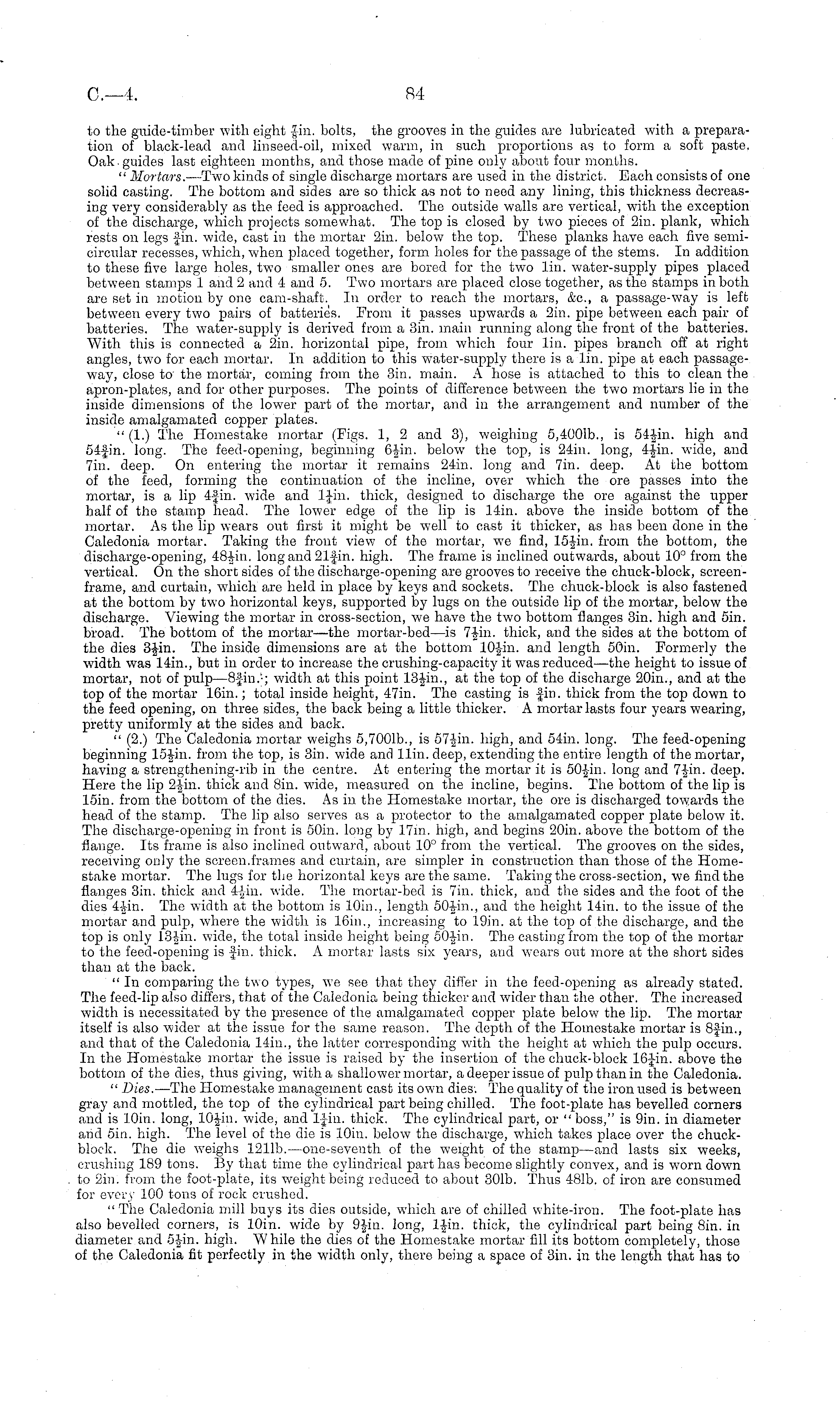 to the guide-timber with eight fin. bolts, the grooves in the guides care lubricated with a preparation of black-lead and linseed-oil, mixed warm, in such proportions as to form a soft paste. Oak guides last eighteen months, and those made of pine only about four months. " Mortars. —Two kinds of single discharge mortars are used in the district. Each consists of one solid casting. The bottom and sides are so thick as not to need any lining, this thickness decreasing very considerably as the feed is approached. The outside walls are vertical, with the exception of the discharge, which projects somewhat. The top is closed by two pieces of 2in. plank, which rests on legs fin. wide, cast in the mortar 2in. below the top. These planks have each five semicircular recesses, which, when placed together, form holes for the passage of the stems. In addition to these five large holes, two smaller ones are bored for the two lin. water-supply pipes placed between stamps 1 and 2 and 1 and 5. Two mortars are placed close together, as the stamps in both are set in motion by one cam-shaft. In order to reach the mortars, &c, a passage-way is left between every two pairs of batteries. From it passes upwards a 2in. pipe between each pair of batteries. The water-supply is derived from a 3in. main running along the front of the batteries. With this is connected a 2in. horizontal pipe, from which four lin. pipes branch off at right angles, two for each mortar. In addition to this water-supply there is a lin. pipe at each, passageway, close to' the mortar, coming from the 3in. main. A hose is attached to this to clean the apron-plates, and for other purposes. The points of difference between the two mortars lie in the inside dimensions of the lower part of the mortar, and in the arrangement and number of the inside amalgamated copper plates. " (1.) The Homestake mortar (Figs. 1, 2 and 3), weighing 5,4001b., is 54-|in. high and 54fin. long. The feed-opening, beginning 6Jin. below the top, is 24in. long, 4|in. wide, and 7in. deep. On entering the mortar it remains 24in. long and 7in. deep. At the bottom of the feed, forming the continuation of the incline, over which the ore passes into the mortar, is a lip 4fin. wide and ljin. thick, designed to discharge the ore against the upper half of the stamp head. The lower edge of the lip is llin. above the inside bottom of the mortar. As the lip wears out first it might be well to cast it thicker, as has been done in the Caledonia mortar. Taking the front view of the mortar, we find, 15-Jin. from the bottom, the discharge-opening, 48|in. long and 21f in. high. The frame is inclined outwards, about 10° from the vertical. On the short sides of the discharge-opening are grooves to receive the chuck-block, screenframe, and curtain, which are held in place by keys and sockets. The chuck-block is also fastened at the bottom by two horizontal keys, supported by lugs on the outside lip of the mortar, below the discharge. Viewing the mortar in cross-section, we have the two bottom flanges 3in. high and sin. broad. The bottom of the mortar—the mortar-bed —is 7-Jin. thick, and the sides at the bottom of the dies 3Jin. The inside dimensions are at the bottom 10-|-in. and length 50in. Formerly the width was 14in., but in order to increase the crushing-capacity it was reduced—the height to issue of mortar, not of pulp —Bfin.-; width at this point 13-|in., at the top of the discharge 20in., and at the top of the mortar 16in.; total inside height, 47in. The casting is fin. thick from the top down to the feed opening, on three sides, the back being a little thicker. A mortar lasts four years wearing, pretty uniformly at the sides and back. " (2.) The Caledonia mortar weighs 5,7001b., is 57-|in. high, and 54in. long. The feed-opening beginning 15fin. from the top, is 3in. wide and llin. deep, extending the entire length of the mortar, having a strengthening-rib in the centre. At entering the mortar it is 50-|in. long and 7fin. deep. Here the lip 2-|in. thick and Bin. wide, measured on the incline, begins. The bottom of the lip is 15in. from the bottom of the dies. As in the Homestake mortar, the ore is discharged towards the head of the stamp. The lip also serves as a protector to the amalgamated copper plate below it. The discharge-opening in front is 50in. long by 17m. high, and begins 20in. above the bottom of the flange. Its frame is also inclined outward, about 10° from the vertical. The grooves on the sides, receiving only the screen.frames and curtain, are simpler in construction than those of the Homestake mortar. The lugs for the horizontal keys are the same. Taking the cross-section, we find the flanges 3in. thick and 4-J-in. wide. The mortar-bed is 7in. thick, and the sides and the foot of the dies The width at the bottom is lOin., length 50iin., and the height llin. to the issue of the mortar and pulp, where the width is 16in., increasing to 19in. at the top of the discharge, and the top is only 13|-in. wide, the total inside height being 50cjin. The casting from the top of the mortar to the feed-opening is fin. thick. A mortar lasts six years, and wears out more at the short sides than at the back. " In comparing the two types, we see that they differ in the feed-opening as already stated. The feed-lip also differs, that of the Caledonia being thicker and wider than the other. The increased width is necessitated by the presence of the amalgamated copper plate below the lip. The mortar itself is also wider at the issue for the same reason. The depth of the Homestake mortar is Bfin., and that of the Caledonia 14in., the latter corresponding with the height at which the pulp occurs. In the Homestake mortar the issue is raised by the insertion of the chuck-block 16|-in. above the bottom of the dies, thus giving, with a shallower mortar, a deeper issue of pulp than in the Caledonia. " Dies. —The Homestake management cast its own dies. The quality of the iron used is