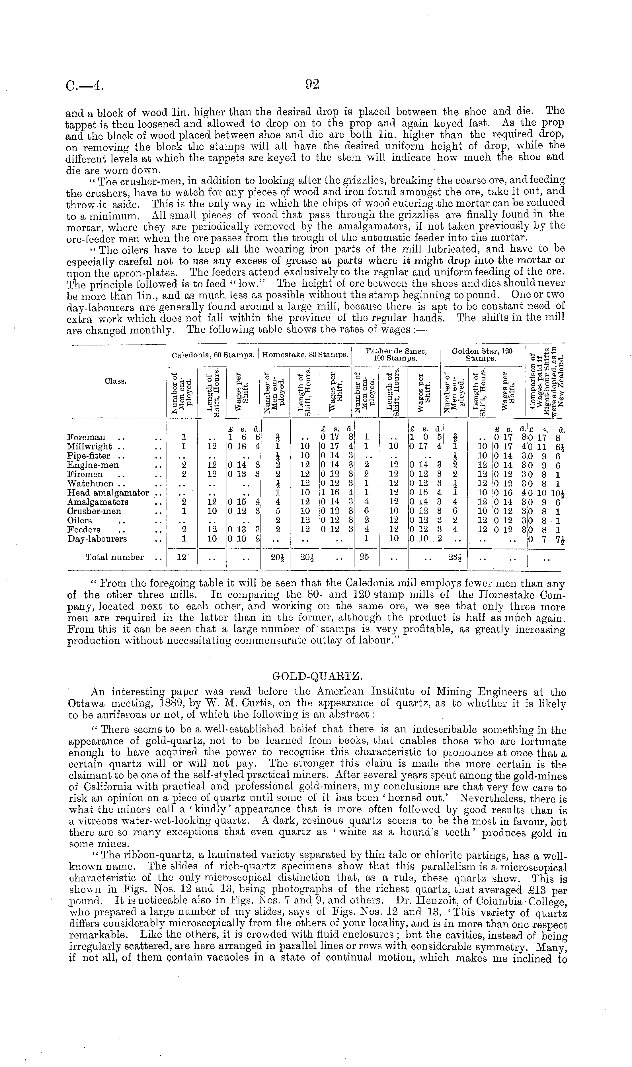 " From the foregoing table it will be seen that the Caledonia mill employs fewer men than any of the other three mills. In comparing the 80- and 120-stamp mills of the Homestake Company, located next to each other, and working on the same ore, we see that only three more men are required in the latter than in the former, although the product is half as much again. From this it can be seen that a large number of stamps is very profitable, as greatly increasingproduction without necessitating commensurate outlay of labour." GOLD-QUAETZ. An interesting paper was read before the American Institute of Mining Engineers at the Ottawa meeting, 1889, by W. M. Curtis, on the appearance of quartz, as to whether it is likely to be auriferous or not, of which the following is an abstract: — " There seems to be a well-established belief that there is an indescribable something in the appearance of gold-quartz, not to be learned from books, that enables those who are fortunate enough to have acquired the power to recognise this characteristic to pronounce at once that a certain quartz will or will not pay. The stronger this claim is made the more certain is the claimant to be one of the self-styled practical miners. After several years spent among the gold-mines of California with practical and professional gold-miners, my conclusions are that very few care to risk an opinion on a piece of quartz until some of it has been ' horned out.' Nevertheless, there is what the miners call a ' kindly' appearance that is more often followed by good results than is a vitreous water-wet-looking quartz. A dark, resinous quartz seems to be the most in favour, but there are so many exceptions that even quartz as 'white as a hound's teeth' produces gold in some mines. " The ribbon-quartz, a laminated variety separated by thin talc or chlorite partings, has a wellknown name. The slides of rich-quartz specimens show that this parallelism is a microscopical characteristic of the only microscopical distinction that, as a rule, these quartz show. This is shown in Figs. Nos. 12 and 13, being photographs of the richest quartz, that averaged £13 per pound. It is noticeable also in Figs. Nos. 7 and 9, and others. Dr. Henzolt, of Columbia College, who prepared a large number of my slides, says of Figs. Nos. 12 and 13, ' This variety of quartz differs considerably microscopically from the others of your locality, and is in more than one respect remarkable. Like the others, it is crowded with fluid enclosures ; but the cavities, instead of being irregularly scattered, are here arranged in parallel lines or rows with considerable symmetry. Many, if not all, of them contain vacuoles in a state of continual motion, which makes me inclined to