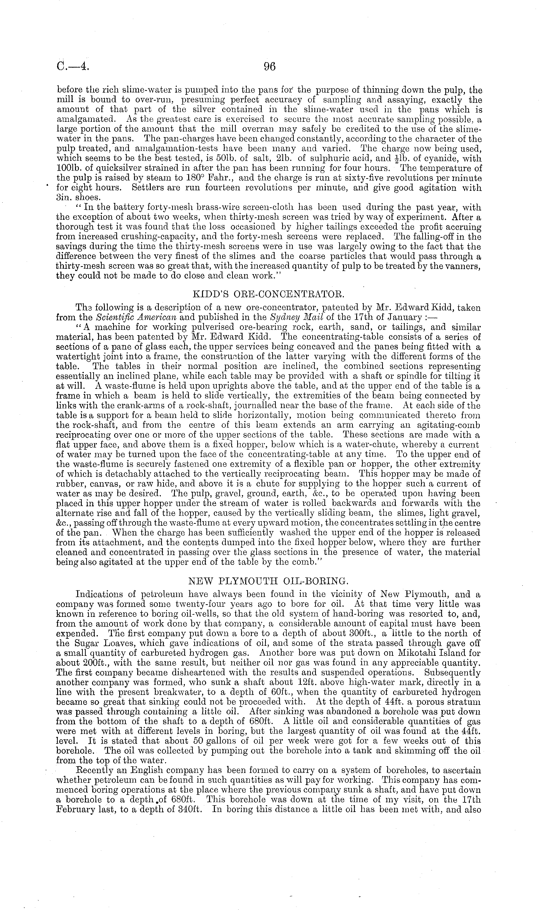 before the rich slime-water is pumped into the pans for the purpose of thinning down the pulp, the mill is bound to over-run, presuming perfect accuracy of sampling and assaying, exactly the amount of that part of the silver contained in the slime-water used in the pans which is amalgamated. As the greatest care is exercised to secure the most accurate sampling possible, a large portion of the amount that the mill overran may safely be credited to the use of the slimewater in the pans. The pan-charges have been changed constantly, according to the character of the pulp treated, and amalgamation-tests have been many and varied. The charge now 7 being used, which seems to be the best tested, is 501b. of salt, 21b. of sulphuric acid, and Jib. of cyanide, with 1001b. of quicksilver strained in after the pan has been running for four hours. The temperature of the pulp is raised by steam to 180° Pahr., and the charge is run at sixty-five revolutions per minute for eight hours. Settlers are run fourteen revolutions per minute, and give good agitation with 3in. shoes. " In the battery forty-mesh brass-wire screen-cloth has been used during the past year, with the exception of about two weeks, when thirty-mesh screen was tried byway of experiment. After a thorough test it was found that the loss occasioned by higher tailings exceeded the profit accruing from increased crushing-capacity, and the forty-mesh screens were replaced. The falling-off in the savings during the time the thirty-mesh screens were in use was largely owing to the fact that the difference betw y een the very finest of the slimes and the coarse particles that would pass through a thirty-mesh screen was so great that, with the increased quantity of pulp to be treated by the vanners, they could not be made to do close and clean work." KIDD'S ORE-CONCENTRATOR. The following is a description of a new ore-concentrator, patented by Mr. Edward Kidd, taken from the Scientific American and published in the Sydney Mail of the 17th of January :— "A machine for working pulverised ore-bearing rock, earth, sand, or tailings, and similar material, has been patented by Mr. Edward Kidd. The concentrating-table consists of a series of sections of a pane of glass each, the upper services being concaved and the panes being fitted with a watertight joint into a frame, the construction of the latter varying with the different forms of the table. The tables in their normal position are inclined, the combined sections representing essentially an inclined plane, while each table may be provided with a shaft or spindle for tilting it at will. A waste-flume is held upon uprights above the table, and at the upper end of the table is a frame in which a beam is held to slide vertically, the extremities of the beam being connected by links with the crank-arms of a rock-shaft, journahed near the base of the frame. At each side of the table is a support for a beam held to slide horizontally, motion being communicated thereto from the rock-shaft, and from the centre of this beam extends an arm carrying an agitating-coinb reciprocating over one or more of the upper sections of the table. These sections are made with a flat upper face, and above them is a fixed hopper, below which is a water-chute, whereby a current of water may be turned upon the face of the concentrating-table at any time. To the upper end of the waste-flume is securely fastened one extremity of a flexible pan or hopper, the other extremity of which is detachably attached to the vertically reciprocating beam. This hopper may be made of rubber, canvas, or raw hide, and above it is a chute for supplying to the hopper such a current of water as may be desired. The pulp, gravel, ground, earth, &c, to be operated upon having been placed in this upper hopper under the stream of water is rolled backwards and forw-ards with the alternate rise and fall of the hopper, caused by the vertically sliding beam, the slimes, light gravel, &c, passing off through the waste-flume at every upward motion, the concentrates settling in the centre of the pan. When the charge has been sufficiently washed the upper end of the hopper is released from its attachment, and the contents dumped into the fixed hopper below, where they are further cleaned and concentrated in passing over the glass sections in the presence of water, the material being also agitated at the upper end of the table by the comb." NEW PLYMOUTH OIL-BORING. Indications of petroleum have always been found in the vicinity of New Plymouth, and a company was formed, some twenty-four years ago to bore for oil. At that time very little was known in reference to boring oil-wells, so that the old system of hand-boring was resorted to, and, from the amount of work done by that company, a considerable amount of capital must have been expended. The first company put down a bore to a depth of about 300 ft., a little to the north of the Sugar Loaves, which gave indications of oil, and some of the strata passed through gave off a small quantity of carbureted hydrogen gas. Another bore was put down on Mikotahi Island for about 200 ft., with the same result, but neither oil nor gas was found in any appreciable quantity. The first company became disheartened with the results and suspended operations. Subsequently another company was formed, who sunk a shaft about 12ft. above high-water mark, directly in a line with the present breakwater, to a depth of 60ft., when the quantity of carbureted hydrogen became so great that sinking could not be proceeded with. At the depth of 44ft. a porous stratum was passed through containing a little oil. After sinking was abandoned a borehole was put down from the bottom of the shaft to a depth of 680 ft. A little oil and considerable quantities of gas were met with at different levels in boring, but the largest quantity of oil was found at the 44ft. level. It is stated that about 50 gallons of oil per week were got for a few weeks o
