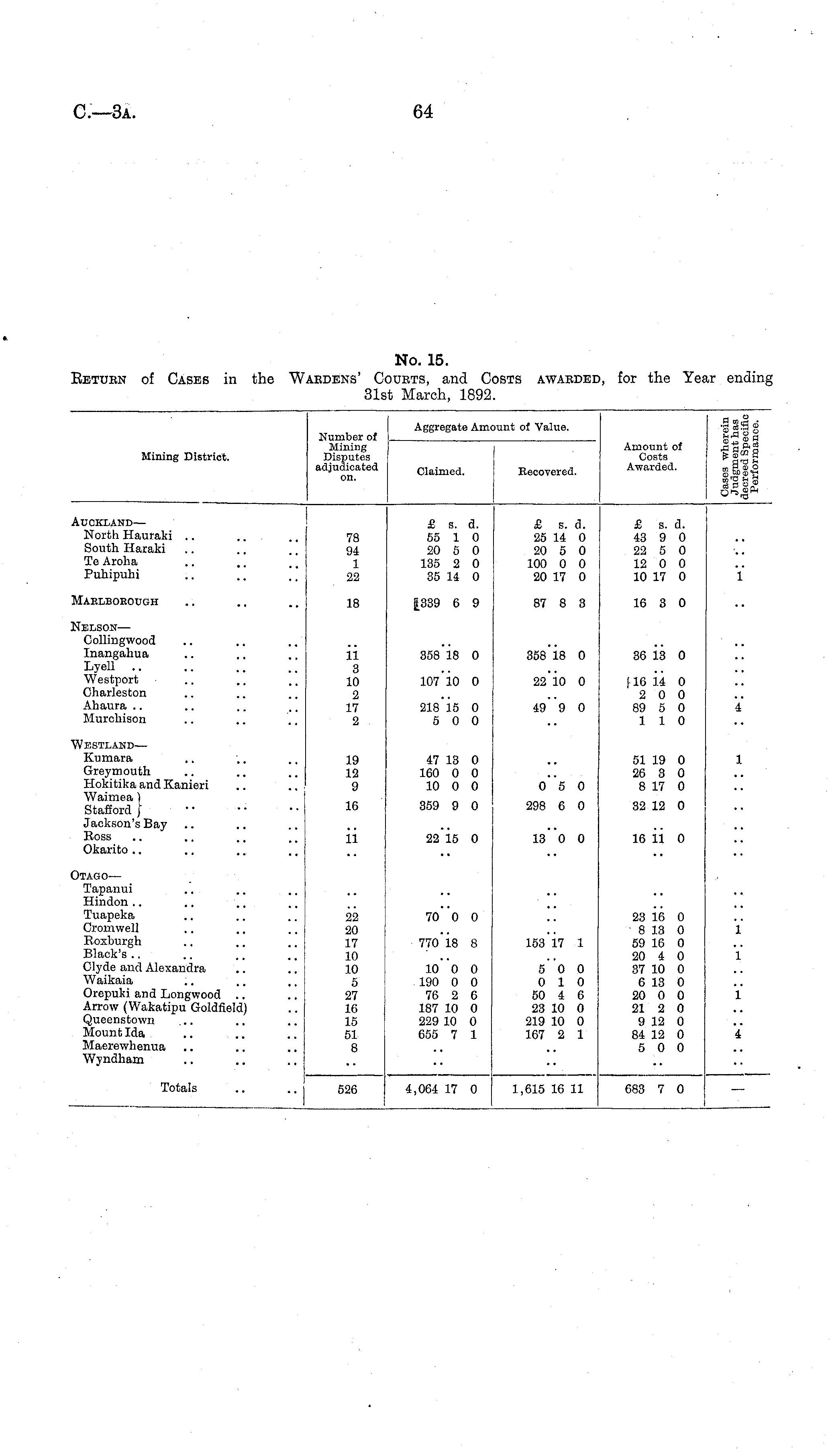 No. 15. Return of Cases in the Wardens' Courts, and Costs awarded, for the Year ending 31st March, 1892.