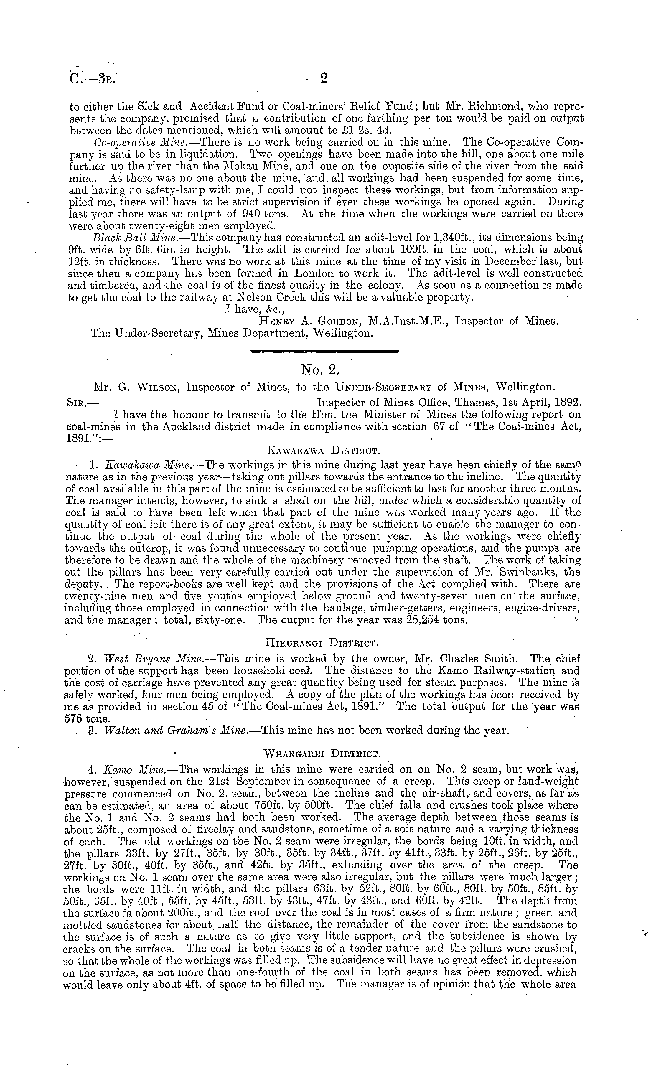to either the Sick and Accident Fund or Coal-miners' Relief Fund; but Mr. Richmond, who represents the company, promised that a contribution of one farthing per ton would be paid on output between the dates mentioned, which will amount to £1 2s. 4d. Co-operative Mine. —There is no work being carried on in this mine. The Co-operative Company is said to be in liquidation. Two openings have been made into the hill, one about one mile further up the river than the Mokau Mine, and one on the opposite side of the river from the said mine. As there was no one about the mine, and all workings had been suspended for some time, and having no safety-lamp with me, I could not inspect these workings, but from information supplied me, there will have to be strict supervision if ever these workings be opened again. During last year there was an output of 940 tons. At the time when the workings were carried on there were about twenty-eight men employed. Black Ball Mine. —This company has constructed an adit-level for 1,340 ft., its dimensions being 9ft. wide by 6ft. 6in. in height. The adit is carried for about 100 ft. in the coal, which is about 12ft. in thickness. There was no work at this mine at the time of my visit in December last, but since then a company has been formed in London to work it. The adit-level is well constructed and timbered, and the coal is of the finest quality in the colony. As soon as a connection is made to get the coal to the railway at Nelson Creek this will be a valuable property. I have, &c, Hbnby A. Goedon, M. A.Inst. M.E., Inspector of Mines. The Under-Secretary, Mines Department, Wellington.