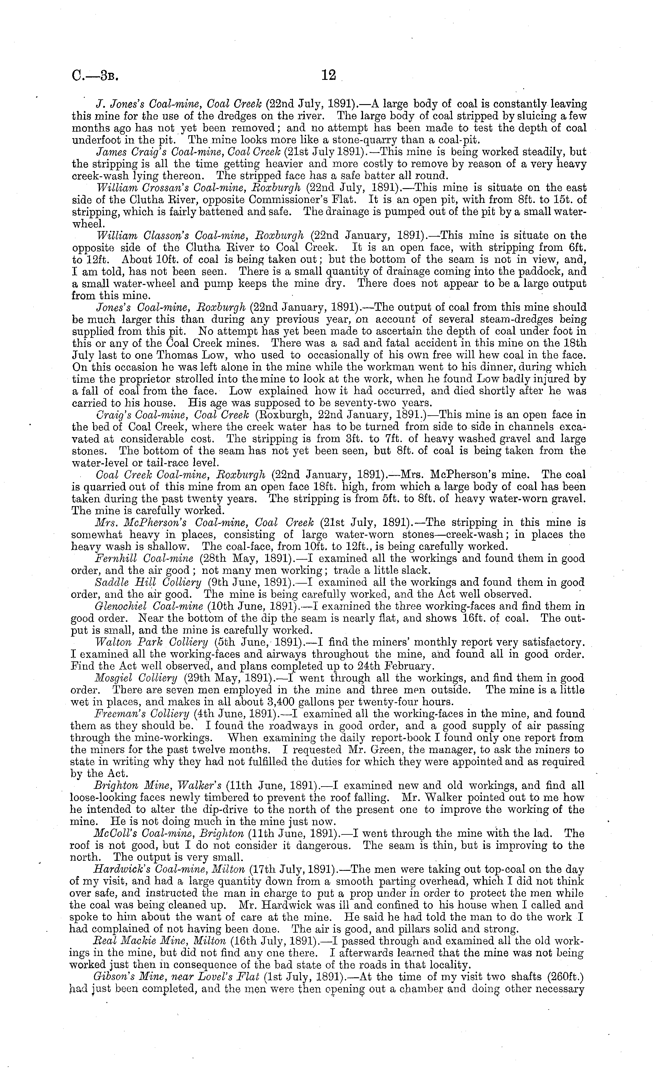J. Jones's Coal-mine, Goal Creek (22nd July, 1891). —A large body of coal is constantly leaving this mine for the use of the dredges on the river. The large body of coal stripped by sluicing a few months ago has not yet been removed; and no attempt has been made to test the depth of coal underfoot in the pit. The mine looks more like a stone-quarry than a coal-pit. James Craig's Coal-mine, Coal Creek (21st July 1891). —This mine is being worked steadily, but the stripping is all the time getting heavier and more costly to remove by reason of a very heavy creek-wash lying thereon. The stripped face has a safe batter all round. William Crossan's Goal-mine, Roxburgh (22nd July, 1891). —This mine is situate on the east side of the Clutha Eiver, opposite Commissioner's Mat. It is an open pit, with from Bft. to 15t. of stripping, which is fairly battened and safe. The drainage is pumped out of the pit by a small waterwheel. William Classon's Coal-mine, Boxburgh (22nd January, 1891). —This mine is situate on the opposite side of the Clutha Eiver to Coal Creek. It is an open face, with stripping from 6ft. to 12ft. About 10ft. of coal is being taken out; but the bottom of the seam is not in view, and, lam told, has not been seen. There is a small quantity of drainage coming into the paddock, and a small water-wheel and pump keeps the mine dry. There does not appear to be a large output from this mine. Jones's Goal-mine, Boxburgh (22nd January, 1891). —The output of coal from this mine should be much larger this than during any previous year, on account of several steam-dredges being supplied from this pit. No attempt has yet been made to ascertain the depth of coal under foot in this or any of the Coal Creek mines. There was a sad and fatal accident in this mine on the 18th July last to one Thomas Low, who used to occasionally of his own free will hew coal in the face. On this occasion he was left alone in the mine while the workman went to his dinner, during which time the proprietor strolled into the mine to look at the work, when he found Low badly injured by a fall of coal from the face. Low explained how it had occurred, and died shortly after he was carried to his house. His age was supposed to be seventy-two years. Craig's Coal-mine, Goal Creek (Eoxburgh, 22nd January, 1891.) —This mine is an open face in the bed of Coal Creek, where the creek water has to be turned from side to side in channels excavated at considerable cost. The stripping is from 3ft. to 7ft. of heavy washed gravel and large stones. The bottom of the seam has not yet been seen, but Bft. of coal is being taken from the water-level or tail-race level. Coal Creek Coal-mine, Boxburgh (22nd January, 1891). —Mrs. McPherson's mine. The coal is quarried out of this mine from an open face 18ft. high, from which a large body of coal has been taken during the past twenty years. The stripping is from sft. to Bft. of heavy water-worn gravel. The mine is carefully worked. Mrs. McPherson's Coal-mine, Goal Greek (21st July, 1891). —The stripping in this mine is somewhat heavy in places, consisting of large water-worn stones —creek-wash; in places the heavy wash is shallow. The coal-face, from 10ft. to 12ft., is being carefully worked. Fernhill Goal-mine (28th May, 1891). —I examined all the workings and found them in good order, and the air good ; not many men working; trade a little slack. Saddle Hill Colliery (9th June, 1891). —I examined all the workings and found them in good order, and the air good. The mine is being carefully worked, and the Act well observed. Glenochiel Goal-mine (10th June, 1891). —I examined the three working-faces and find them in good order. Near the bottom of the dip the seam is nearly flat, and shows 16ft. of coal. The output is small, and the mine is carefully worked. Walton Park Colliery (sth June, 1891). —I find the miners' monthly report very satisfactory. I examined all the working-faces and airways throughout the mine, and found all in good order. Find the Act well observed, and plans completed up to 24th February. Mosgiel Colliery (29th May, 1891). —I went through all the workings, and find them in good order. There are seven men employed, in the mine and three men outside. The mine is a little wet in places, and makes in all about 3,400 gallons per twenty-four hours. Freeman's Colliery (4th June, 1891). —I examined all the working-faces in the mine, and found them as they should be. I found the roadways in good order, and a good supply of air passing through the mine-workings. When examining the daily report-book I found only one report from the miners for the past twelve months. I requested Mr. Green, the manager, to ask the miners to state in writing why they had not fulfilled the duties for which they were appointed and as required by the Act. Brighton Mine, Walker's (11th June, 1891). —I examined new and old workings, and find all loose-looking faces newly timbered to prevent the roof falling. Mr. Walker pointed out to me how he intended to alter the dip-drive to the north of the present one to improve the working of the mine. He is not doing much in the mine just now. McGoll's Coal-mine, Brighton (11th June, 1891). —I went through the mine with the lad. The roof is not good, but Ido not consider it dangerous. The seam is thin, but is improving to the north. The output is very small. Hardivick's Coal-mine, Milton (17th July, 1891). —The men were taking out top-coal on the day of my visit, and had a large quantity down from a smooth parting overhead, which I did not think over safe, and instructed the man in charge to put a prop under in order to protect the men while the coal was being cleaned up. Mr. Hardwick was ill and confined to his house when I called and spoke to him about the want of care at the mine. He said he had told the man to do the work I had complained of not having been done. The air is good, and pillars solid and strong. Beal Mackie Mine, Mil