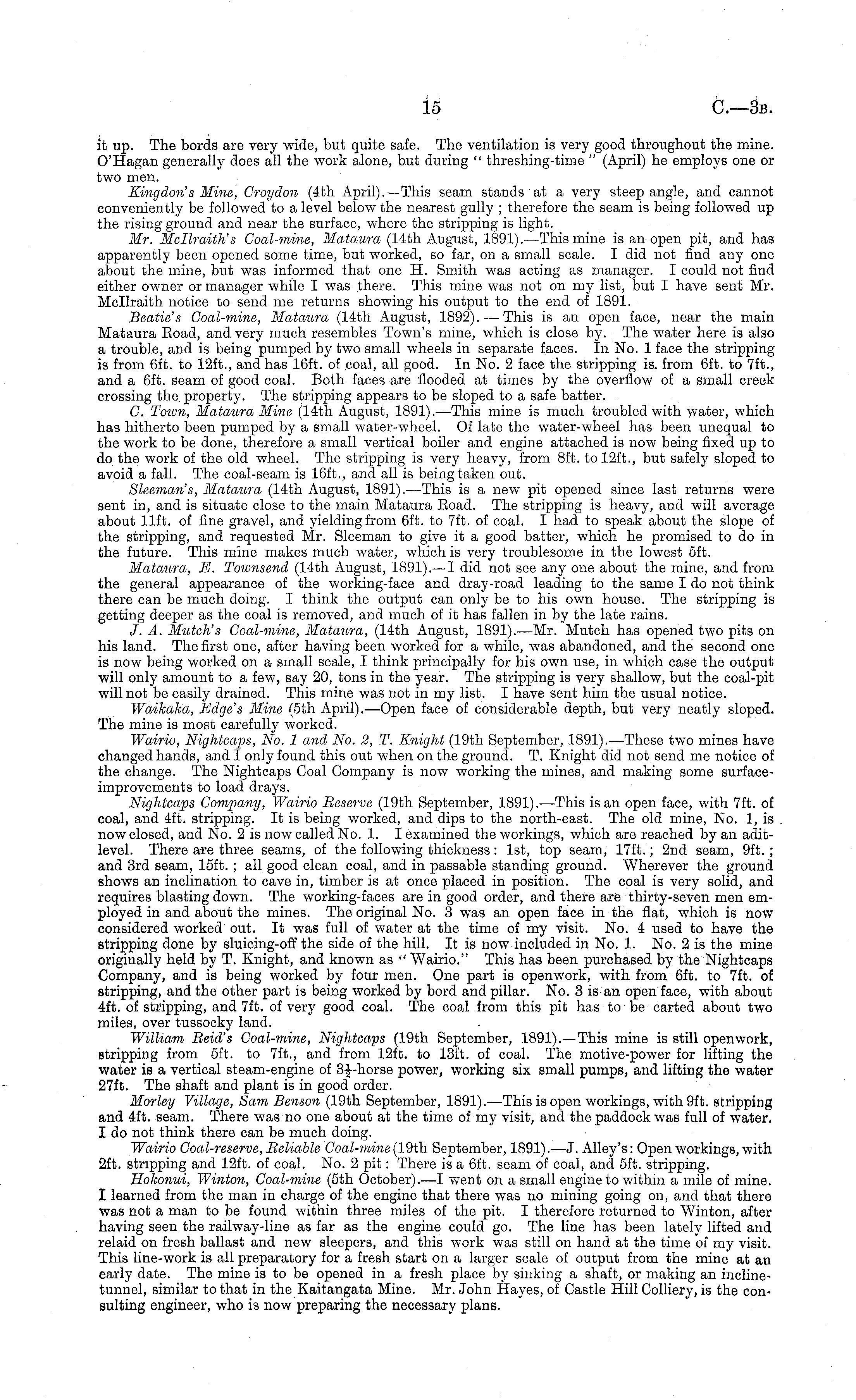 it up. The bords are very wide, but quite safe. The ventilation is very good throughout the mine. O'Hagan generally does all the work alone, but during " threshing-time " (April) he employs one or two men. Kingdon's Mine, Groydon (4th April). — This seam stands at a very steep angle, and cannot conveniently be followed to a level below the nearest gully ; therefore the seam is being followed up the rising ground and near the surface, where the stripping is light. Mr. Mcllraith's Goal-mine, Mataura (14th August, 1891). —This mine is an open pit, and has apparently been opened some time, but worked, so far, on a small scale. I did not find any one about the mine, but was informed that one H. Smith was acting as manager. I could not find either owner or manager while I was there. This mine was not on my list, but I have sent Mr. Mcllraith notice to send me returns showing his output to the end of 1891. Beatie's Goal-mine, Mataura (14th August, 1892). —This is an open face, near the main Mataura Boad, and very much resembles Town's mine, which is close by. The water here is also a trouble, and is being pumped by two small wheels in separate faces. In No. 1 face the stripping is from 6ft. to 12ft., and has 16ft. of coal, all good. In No. 2 face the stripping is. from 6ft. to 7ft., and a 6ft. seam of good coal. Both faces are flooded at times by the overflow of a small creek crossing the property. The stripping appears to be sloped to a safe batter. G. Toion, Mataura Mine (14th August, 1891). —This mine is much troubled with water, which has hitherto been pumped by a small water-wheel. Of late the water-wheel has been unequal to the work to be done, therefore a small vertical boiler and engine attached is now being fixed up to do the work of the old wheel. The stripping is very heavy, from Bft. to 12ft., but safely sloped to avoid a fall. The coal-seam is 16ft., and. all is being taken out. Sleeman's, Mataiora (14th August, 1891). —This is a new pit opened since last returns were sent in, and is situate close to the main Mataura Eoad. The stripping is heavy, and will average about lift, of fine gravel, and yielding from 6ft. to 7ft. of coal. I had to speak about the slope of the stripping, and requested Mr. Sleeman to give it a good batter, which he promised to do in the future. This mine makes much water, which is very troublesome in the lowest sft. Mataura, E. Townsend (14th August, 1891). — 1 did not see any one about the mine, and from the general appearance of the working-face and dray-road leading to the same I do not think there can be much doing. I think the output can only be to his own house. The stripping is getting deeper as the coal is removed, and much of it has fallen in by the late rains. /. A. Mutch's Goal-mine, Mataura, (14th August, 1891). —Mr. Mutch has opened two pits on his land. The first one, after having been worked for a while, was abandoned, and the second one is now being worked on a small scale, I think principally for his own use, in which case the output will only amount to a few, say 20, tons in the year. The stripping is very shallow, but the coal-pit will not be easily drained. This mine was not in my list. I have sent him the usual notice. Waikaka, Edge's Mine (sth April).—Open face of considerable depth, but very neatly sloped. The mine is most carefully worked. Wairio, Nightcaps, No. 1 and No. 2, T. Knight (19th September, 1891). —These two mines have changed hands, and I only found this out when on the ground. T. Knight did not send me notice of the change. The Nightcaps Coal Company is now working the mines, and making some surfaceimprovements to load drays. Nightcaps Company, Wairio Beserve (19th September, 1891). —This is an open face, with 7ft. of coal, and 4ft. stripping. It is being worked, and dips to the north-east. The old mine, No. 1, is now closed, and No. 2is now called No. 1. I examined the workings, which are reached by an aditlevel. There are three seams, of the following thickness: Ist, top seam, 17ft.; 2nd seam, 9ft.; and 3rd seam, 15ft. ; all good clean coal, and in passable standing ground. Wherever the ground shows an inclination to cave in, timber is at once placed in position. The coal is very solid, and requires blasting down. The working-faces are in good order, and there are thirty-seven men employed in and about the mines. The original No. 3 was an open face in the flat, which is now considered worked out. It was full of water at the time of my visit. No. 4 used to have the stripping done by sluicing-off the side of the hill. It is now included in No. 1. No. 2is the mine originally held by T. Knight, and known as " Wairio." This has been purchased by the Nightcaps Company, and is being worked by four men. One part is openwork, with from 6ft. to 7ft. of stripping, and the other part is being worked by bord and pillar. No. 3is an open face, with about 4ft. of stripping, and 7ft. of very good coal. The coal from this pit has to be carted, about two miles, over tussocky land. William Beid's Goal-mine, Nightcaps (19th September, 1891). —This mine is still openwork, stripping from sft. to 7ft., and from 12ft. to 13ft. of coal. The motive-power for lifting the water is a vertical steam-engine of 3-|--horse power, working six small pumps, and lifting the water 27ft. The shaft and plant is in good order. Morley Village, Sam Benson (19th September, 1891). —This is open workings, with 9ft. stripping and 4ft. seam. There was no one about at the time of my visit, and the paddock was full of water. I do not think there can be much doing. Wairio Goal-reserve, Beliable Goal-mine (19th September, 1891). — J. Alley's: Open workings, with 2ft. stripping and 12ft. of coal. No. 2 pit: There is a 6ft. seam of coal, and sft. stripping. Hokonui, Winton, Goal-mine (sth October). —I went on a small engine to within a mile of mine. I learned from the man in charge of the engine that there was no mining going on, and that there wa
