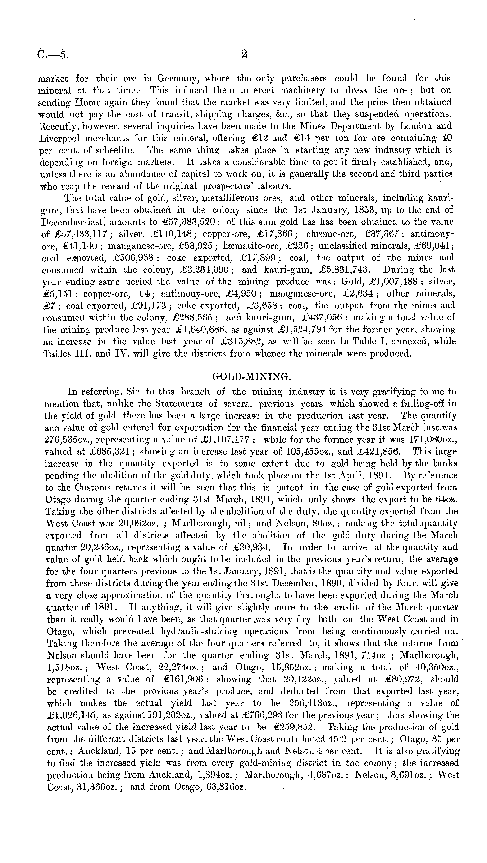 market for their ore in Germany, where the only purchasers could be found for this mineral at that time. This induced them to erect machinery to dress the ore ; but on sending Home again they found that the market was very limited, and the price then obtained would not pay the cost of transit, shipping charges, &c, so that they suspended operations. Recently, however, several inquiries have been made to the Mines Department by London and Liverpool merchants for this mineral, offering £12 and £14 per ton for ore containing 40 per cent. oE scheelite. The same thing takes place in starting any new industry which is depending on foreign markets. It takes a considerable time to get it firmly established, and, unless there is an abundance of capital to work on, it is generally the second and third parties who reap the reward of the original prospectors' labours. The total value of gold, silver, metalliferous ores, and other minerals, including kaurigum, that have been obtained in the colony since the Ist January, 1853, up to the end of December last, amounts to £57,383,520 : of this sum gold has has been obtained to the value of £47,433,117; silver, £140,148; copper-ore, £17,866; chrome-ore, £37,367; antimonyore, £41,140 ; manganese-ore, £53,925 ; hsematite-ore, £226; unclassified minerals, £69,041; coal exported, £506,958; coke exported, £17,899; coal, the output of the mines and consumed within the colony, £3,234,090; and kauri-gum, £5,831,743. During the last year ending same period the value of the mining produce was : Gold, £1,007,488 ; silver, £5,151; copper-ore, £4; antimony-ore, £4,950; manganese-ore, £2,634; other minerals, £7; coal exported, £91,173 ; coke exported, £3,658; coal, the output from the mines and consumed within the colony, £288,565 ; and kauri-gum, £437,056 : making a total value of the mining produce last year £1,840,686, as against £1,524,794 for the former year, showing an increase in the value last year of £315,882, as will be seen in Table I. annexed, while Tables 111. and IV. will give the districts from whence the minerals were produced. GOLD-MINING. In referring, Sir, to this branch of the mining industry it is very gratifying to me to mention that, unlike the Statements of several previous years which showed a falling-off in the yield of gold, there has been a large increase in the production last year. The quantity and value of gold entered for exportation for the financial year ending the 31st March last was 276,5350z., representing a value of £1,107,177 ; while for the former year it was 171,0800z., valued at £685,321; showing an increase last year of 105,4550z., and £421,856. This large increase in the quantity exported is to some extent due to gold being held by the banks pending the abolition of the gold duty, which took place on the Ist Api'il, 1891. By reference to the Customs returns it will be seen that this is patent in the case of gold exported from Otago during the quarter ending 31st March, 1891, which only shows the export to be 640z. Taking the other districts affected by the abolition of the duty, the quantity exported from the West Coast was 20,0920z. ; Marlborough, nil; and Nelson, 80oz. : making the total quantity exported from all districts affected by the abolition of the gold duty during the March quarter 20,2360z., representing a value of £80,931. In order to arrive at the quantity and value of gold held back which ought to be included in the previous year's return, the average for the four quarters previous to the Ist January, 1891, that is the quantity and value exported from these districts during the year ending the 31st December, 1890, divided by four, will give a very close approximation of the quantity that ought to have been exported during the March quarter of 1891. If anything, it will give slightly more to the credit of the March quarter than it really would have been, as that quarter .was very dry both on the West Coast and in Otago, which prevented hydraulic-sluicing operations from being continuously carried on. Taking therefore the average of the four quarters referred to, it shows that the returns from Nelson should have been for the quarter ending 31st March, 1891, 7140z. ; Marlborough, 1,5180z. ; West Coast, 22,2740z.; and Otago, 15,8520z. : making a total of 40,3500z., representing a value of £161,906 : showing that 20,1220z., valued at £80,972, should be credited to the previous year's produce, and deducted from that exported last year, which makes the actual yield last year to be 256,4130z., representing a value of £1,026,145, as against 191,2020z., valued at £766,293 for the previous year ; thus showing the actual value of the increased yield last year to be £259,852. Taking the production of gold from the different districts last year, the West Coast contributed 45"2 per cent.; Otago, 35 per cent.; Auckland, 15 per cent.; and Marlborough and Nelson 4 per cent. It is also gratifying to find the increased yield was from every gold-mining district in the colony; the increased production being from Auckland, 1,8940z.; Marlborough, 4,6870z.; Nelson, 3,6910z. ; West Coast, 31,3660z.; and from Otago, 63,8160z.