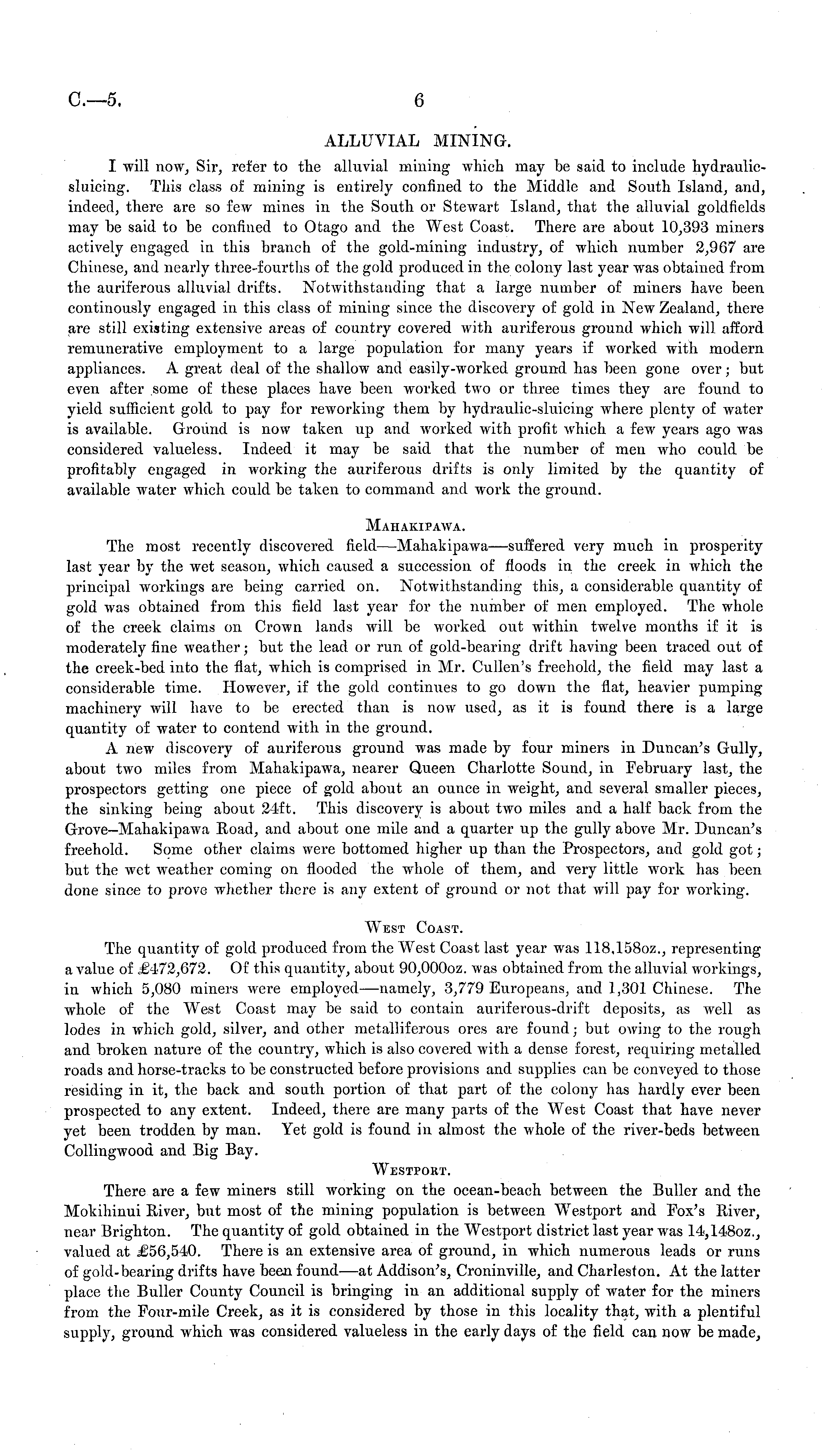 ALLUVIAL MINING. I will now, Sir, refer to the alluvial mining which may be said to include hydraulicsluicing. This class of mining is entirely confined to the Middle and South Island, and, indeed, there are so few mines in the South or Stewart Island, that the alluvial goldfields may be said to be confined to Otago and the West Coast. There are about 10,393 miners actively engaged in this branch of the gold-mining industry, of which number 2,967 are Chinese, and nearly three-fourths of the gold produced in the colony last year was obtained from the auriferous alluvial drifts. Notwithstanding that a large number of miners have been continousiy engaged in this class of mining since the discovery of gold in New Zealand, there are still existing extensive areas of country covered with auriferous ground which will afford remunerative employment to a large population for many years if worked with modern appliances. A great deal of the shallow and easily-worked ground has been gone over; but even after some of these places have been worked two or three times they are found to yield sufficient gold to pay for reworking them by hydraulic-sluicing where plenty of water is available. Ground is now taken up and worked with profit which a few years ago was considered valueless. Indeed it may be said that the number of men who could be profitably engaged in working the auriferous drifts is only limited by the quantity of available water which could be taken to command and work the ground. Mahakipawa. The most recently discovered field —Mahakipawa—suffered very much in prosperity last year by the wet season, which caused a succession of floods in the creek in which the principal workings are being carried on. Notwithstanding this, a considerable quantity of gold was obtained from this field last year for the number of men employed. The whole of the creek claims on Crown lands will be worked out within twelve months if it is moderately fine weather; but the lead or run of gold-bearing drift having been traced out of the creek-bed into the flat, which is comprised in Mr. Cullen's freehold, the field may last a considerable time. However, if the gold continues to go down the flat, heavier pumping machinery will have to be erected than is now used, as it is found there is a large quantity of water to contend with in the ground. A new discovery of auriferous ground was made by four miners in Duncan's Gully, about two miles from Mahakipawa, nearer Queen Charlotte Sound, in February last, the prospectors getting one piece of gold about an ounce in weight, and several smaller pieces, the sinking being about 24ft. This discovery is about two miles and a half back from the Grove—Mahakipawa Road, and about one mile and a quarter up the gully above Mr. Duncan's freehold. Some other claims were bottomed higher up than the Prospectors, and gold got; but the wet weather coming on flooded the whole of them, and very little work has been done since to prove whether there is any extent of ground or not that will pay for working. West Coast. The quantity of gold produced from the West Coast last year was 118,1580z., representing a value of £472,672. Of this quantity, about 90,0000z. was obtained from the alluvial workings, in which 5,080 miners were employed —namely, 3,779 Europeans, and 1,301 Chinese. The whole of the West Coast may be said to contain auriferous-drift deposits, as well as lodes in which gold, silver, and other metalliferous ores are found; but owing to the rough and broken nature of the country, which is also covered with a dense forest, requiring metalled roads and horse-tracks to be constructed before provisions and supplies can be conveyed to those residing in it, the back and south portion of that part of the colony has hardly ever been prospected to any extent. Indeed, there are many parts of the West Coast that have never yet been trodden by man. Yet gold is found in almost the whole of the river-beds between Collingwood and Big Bay. Westport. There are a few miners still working on the ocean-beach between the Buller and the Mokihinui River, but most of the mining population is between Westport and Fox's River, near Brighton. The quantity of gold obtained in the Westport district last year was 14,1480z., valued at £56,540. There is an extensive area of ground, in which numerous leads or runs of gold-bearing drifts have been found—at Addison's, Croninville, and Charleston. At the latter place the Buller County Council is bringing in an additional supply of water for the miners from the Four-mile Creek, as it is considered by those in this locality that, with a plentiful supply, ground which was considered valueless in the early days of the field can now be made,