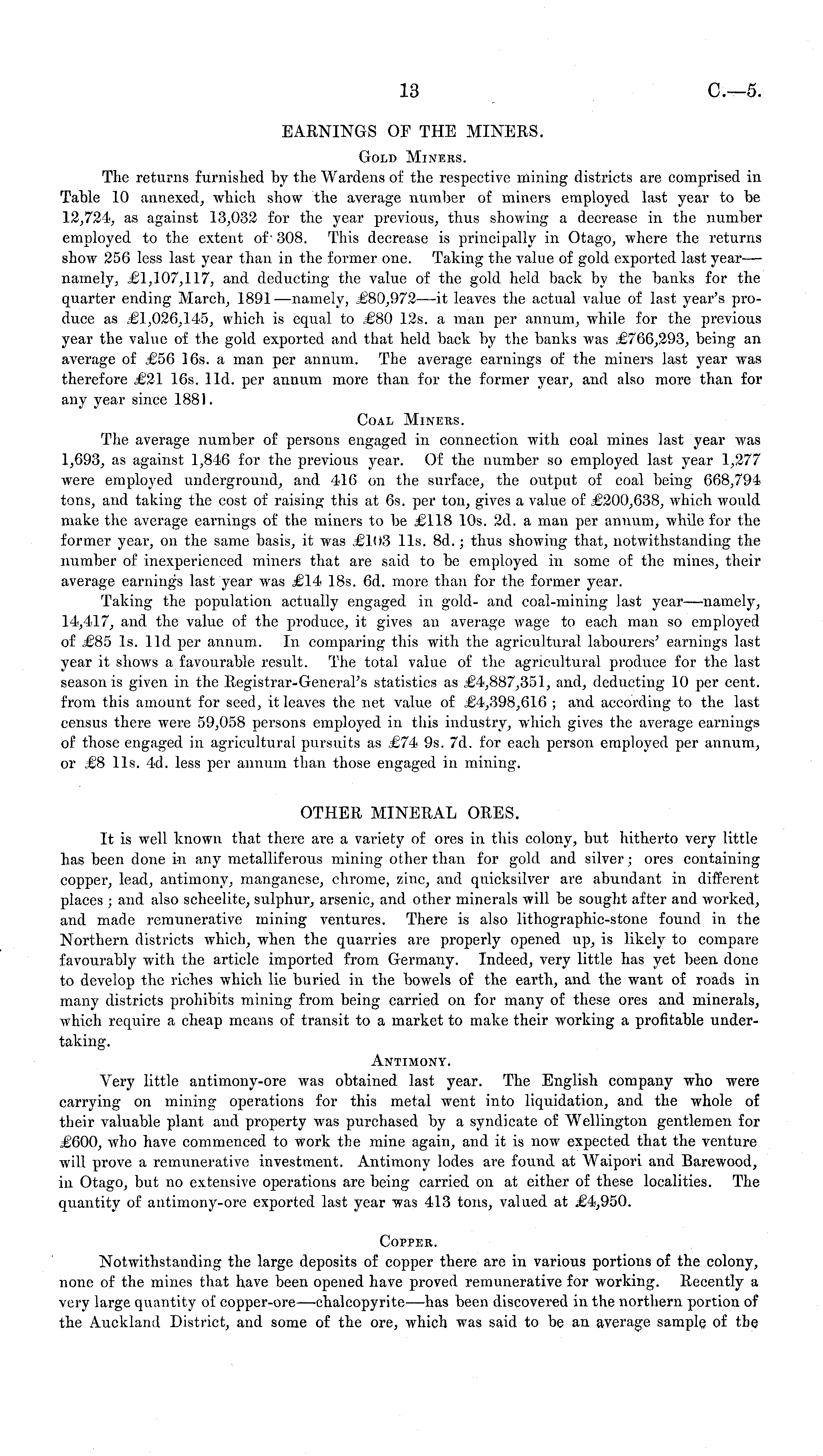 EARNINGS OF THE MINERS. Gold Miners. The returns furnished by the Wardens of the respective mining districts are comprised in Table 10 annexed, which show the average number of miners employed last year to be 12,724, as against 13,032 for the year previous, thus showing a decrease in the number employed to the extent of' 308. This decrease is principally in Otago, where the returns show 256 less last year than in the former one. Taking the value of gold exported last year — namely, £1,107,117, and deducting the value of the gold held back by the banks for the quarter ending March, 1891 —namely, £80,972 —it leaves the actual value of last year's produce as £1,026,145, which is equal to £80 12s. a man per annum, while for the previous year the value of the gold exported and that held back by the banks was £766,293, being an average of £56 16s. a man per annum. The average earnings of the miners last year was therefore £21 16s. lid. per annum more than for the former year, and also more than for any year since 1881. Coal Miners. The average number of persons engaged in connection with coal mines last year was 1,693, as against 1,846 for the previous year. Of the number so employed last year 1,277 were employed underground, and 416 on the surface, the output of coal being 668,794 tons, and taking the cost of raising this at 6s. per ton, gives a value of £200,638, which would make the average earnings of the miners to be £118 10s. 2d. a man per annum, while for the former year, on the same basis, it was £1(13 lis. Bd.; thus showing that, notwithstanding the number of inexperienced miners that are said to be employed in some of the mines, their average earnings last year was £14 18s. 6d. more than for the former year. Taking the population actually engaged in gold- and coal-mining last year —namely, 14,417, and the value of the produce, it gives an average wage to each man so employed of £85 Is. lid per annum. In comparing this with the agricultural labourers' earnings last year it shows a favourable result. The total value of the agricultural produce for the last season is given in the Registrar-General's statistics as £4,887,351, and, deducting 10 per cent, from this amount for seed, it leaves the net value of £4,398,616 ; and according to the last census there were 59,058 persons employed in this industry, which gives the average earnings of those engaged in agricultural pursuits as £74 9s. 7d. for each person employed per annum, or £8 lis. 4d. less per annum than those engaged in mining. OTHER MINERAL ORES. It is well known that there are a variety of ores in this colony, but hitherto very little has been done in any metalliferous mining other than for gold and silver; ores containing copper, lead, antimony, manganese, chrome, zinc, and quicksilver are abundant in different places ; and also scheelite, sulphur, arsenic, and other minerals will be sought after and worked, and made remunerative mining ventures. There is also lithographic-stone found in the Northern districts which, when the quarries are properly opened up, is likely to compare favourably with the article imported from Germany. Indeed, very little has yet been done to develop the riches which lie buried in the bowels of the earth, and the want of roads in many districts prohibits mining from being carried on for many of these ores and minerals, which require a cheap means of transit to a market to make their working a profitable undertaking. Antimony. Very little antimony-ore was obtained last year. The English company who were carrying on mining operations for this metal went into liquidation, and the whole of their valuable plant and property was purchased by a syndicate of Wellington gentlemen for £600, who have commenced to work the mine again, and it is now expected that the venture will prove a remunerative investment. Antimony lodes are found at Waipori and Barewood, in Otago, but no extensive operations are being carried on at either of these localities. The quantity of antimony-ore exported last year was 413 tons, valued at £4,950. Copper. Notwithstanding the large deposits of copper there are in various portions of the colony, none of the mines that have been opened have proved remunerative for working. Recently a very large quantity of copper-ore—chalcopyrite—has been discovered in the northern portion of the Auckland District, and some of the ore, which was said to be an average sample of the