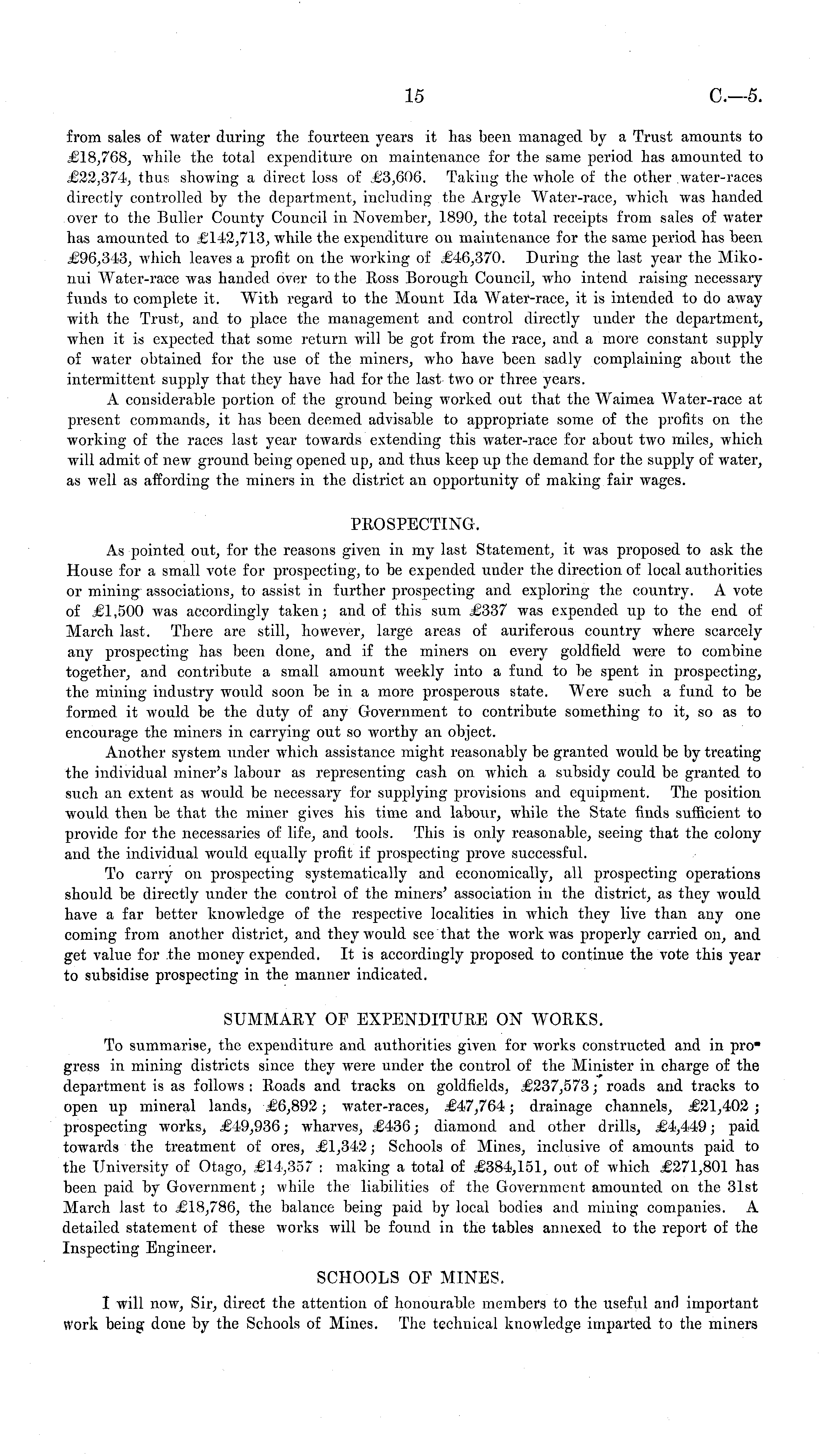 from sales of water during the fourteen years it has been managed by a Trust amounts to £18,768, while the total expenditure on maintenance for the same period has amounted to £22,374, thus showing a direct loss of £3,606. Taking the whole of the other water-races directly controlled by the department, including the Argyle Water-race, which was handed over to the Buller County Council in November, 1890, the total receipts from sales of water has amounted to £142,713, while the expenditure on maintenance for the same period has been £96,343, which leaves a profit on the working of £46,370. During the last year the Mikonui Water-race was handed over to the Ross Borough Council, who intend raising necessary funds to complete it. With regard to the Mount Ida Water-race, it is intended to do away with the Trust, and to place the management and control directly under the department, when it is expected that some return will be got from the race, and a more constant supply of water obtained for the use of the miners, who have been sadly complaining about the intermittent supply that they have had for the last two or three years. A considerable portion of the ground being worked out that the Waimea Water-race at present commands, it has been deemed advisable to appropriate some of the profits on the working of the races last year towards extending this water-race for about two miles, which will admit of new ground being opened up, and thus keep up the demand for the supply of water, as well as affording the miners in the district an opportunity of making fair wages. PROSPECTING. As pointed out, for the reasons given in my last Statement, it was proposed to ask the House for a small vote for prospecting, to be expended under the direction of local authorities or mining associations, to assist in further prospecting and exploring the country. A vote of £1,500 was accordingly taken; and of this sum £337 was expended up to the end of March last. There are still, however, large areas of auriferous country where scarcely any prospecting has been done, and if the miners on every goldfield were to combine together, and contribute a small amount weekly into a fund to be spent in prospecting, the mining industry would soon be in a more prosperous state. Were such a fund to be formed it would be the duty of any Government to contribute something to it, so as to encourage the miners in carrying out so worthy an object. Another system under which assistance might reasonably be granted would be by treating the individual miner's labour as representing cash on Avhich a subsidy could be granted to such an extent as would be necessary for supplying provisions and equipment. The position would then be that the miner gives his time and labour, while the State finds sufficient to provide for the necessaries of life, and tools. This is only reasonable, seeing that the colony and the individual would equally profit if prospecting prove successful. To carry on prospecting systematically and economically, all prospecting operations should be directly under the control of the miners' association in the district, as they would have a far better knowledge of the respective localities in which they live than any one coming from another district, and they would see that the work was properly carried on, and get value for the money expended. It is accordingly proposed to continue the vote this year to subsidise prospecting in the manner indicated. SUMMARY OF EXPENDITURE ON WORKS. To summarise, the expenditure and authorities given for works constructed and in pro" gress in mining districts since they were under the control of the Minister in charge of the department is as follows : Roads and tracks on goldfields, £237,573; roads and tracks to open up mineral lands, £6,892; water-races, £47,764; drainage channels, £21,402 ; prospecting works, £49,936; wharves, £436; diamond and other drills, £4,449; paid towards the treatment of ores, £1,342; Schools of Mines, inclusive of amounts paid to the University of Otago, £14,357 : making a total of £384,151, out of which £271,801 has been paid by Government; while the liabilities of the Government amounted on the 31st March last to £18,786, the balance being paid by local bodies and milling companies. A detailed statement of these works will be found in the tables annexed to the report of the Inspecting Engineer. SCHOOLS OF MINES. I will now, Sir, direct the attention of honourable members to the useful and important work being done by the Schools of Mines. The technical knowledge imparted to the miners