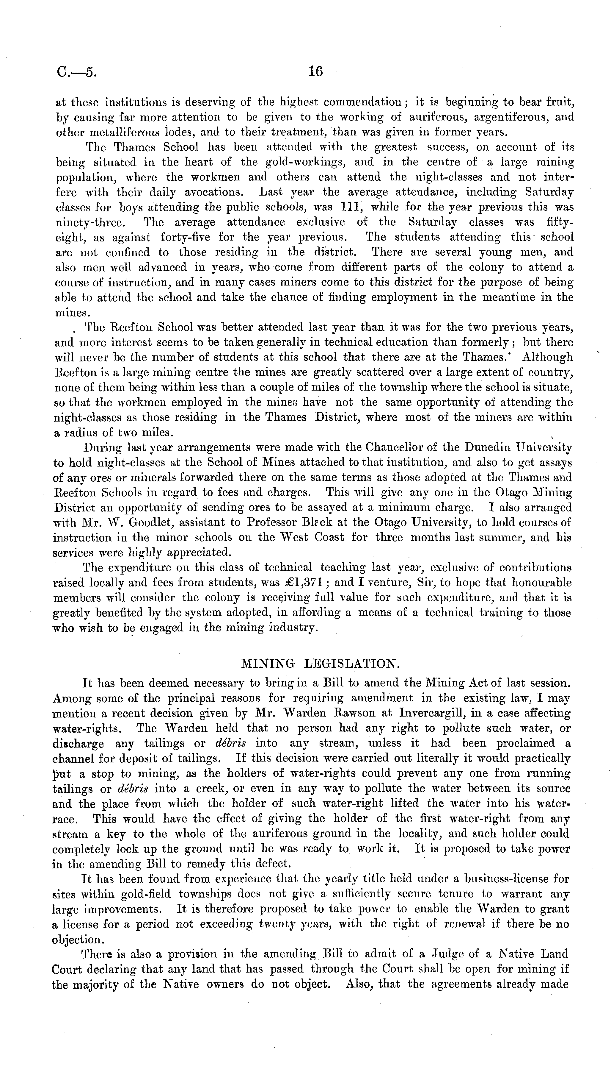 at these institutions is deserving of the highest commendation; it is beginning to bear fruit, by causing far more attention to be given to the working of auriferous, argentiferous, and other metalliferous lodes, and to their treatment, than was given in former years. The Thames School has been, attended with the greatest success, on account of its being situated in the heart of the gold-workings, and in the centre of a large mining population, where the workmen and others can attend the night-classes and not interfere with their daily avocations. Last year the average attendance, including Saturday classes for boys attending the public schools, was 111, while for the year previous this was ninety-three. The average attendance exclusive of the Saturday classes was fiftyeight, as against forty-five for the year previous. The students attending this- school are not confined to those residing in the district. There are several young men, and also men well advanced in years, who come from different parts of the colony to attend a course of instruction, and in many cases miners come to this district for the purpose of being able to attend the school and take the chance of finding employment in the meantime in the mines. The Reefton School was better attended last year than it was for the two previous years, and more interest seems to be taken generally in technical education than formerly; but there will never be the number of students at this school that there are at the Thames.' Although Reefton is a large mining centre the mines are greatly scattered over a large extent of country, none of them being within less than a couple of miles of the township where the school is situate, so that the workmen employed in the mines have not the same opportunity of attending the night-classes as those residing in the Thames District, where most of the miners are within a radius of two miles. During last year arrangements were made with the Chancellor of the Dunedin University to hold night-classes at the School of Mines attached to that institution, and also to get assays of any ores or minerals forwarded there on the same terms as those adopted at the Thames and Reefton Schools in regard to fees and charges. This will give any one in the Otago Mining District an opportunity of sending ores to be assayed at a minimum charge. I also arranged with Mr. W. Goodlet, assistant to Professor Bhck at the Otago University, to hold courses of instruction in the minor schools on the West Coast for three months last summer, and his services were highly appreciated. The expenditure on this class of technical teaching last year, exclusive of contributions raised locally and fees from students, was £1,371; and I venture, Sir, to hope that honourable members will consider the colony is receiving full value for such expenditure, and that it is greatly benefited by the system adopted, in affording a means of a technical training to those who wish to be engaged in the mining industry. MINING LEGISLATION. It has been deemed necessary to bring in a Bill to amend the Mining Act of last session. Among some of the principal reasons for requiring amendment in the existing law, I may mention a recent decision given by Mr. Warden Rawson at Invercargill, in a case affecting water-rights. The Warden held that no person had any right to pollute such water, or discharge any tailings or debris into any stream, unless it had been proclaimed a channel for deposit of tailings. If this decision were carried out literally it would practically put a stop to mining, as the holders of water-rights could prevent any one from running tailings or debris into a creek, or even in any way to pollute the water between its source and the place from which the holder of such water-right lifted the water into his waterrace. This would have the effect of giving the holder of the first water-right from any stream a key to the whole of the auriferous ground in the locality, and such holder could completely lock up the ground until he was ready to work it. It is proposed to take power in the amending Bill to remedy this defect. It has been found from experience that the yearly title held under a business-license for sites within gold-field townships does not give a sufficiently secure tenure to w r arrant any large improvements. It is therefore proposed to take power to enable the Warden to grant a license for a period not exceeding twenty years, with the right of renewal if there be no objection. There is also a provision in the amending Bill to admit of a Judge of a Native Land Court declaring that any land that has passed through the Court shall be open for mining if the majority of the Native owners do not object. Also, that the agreements already made