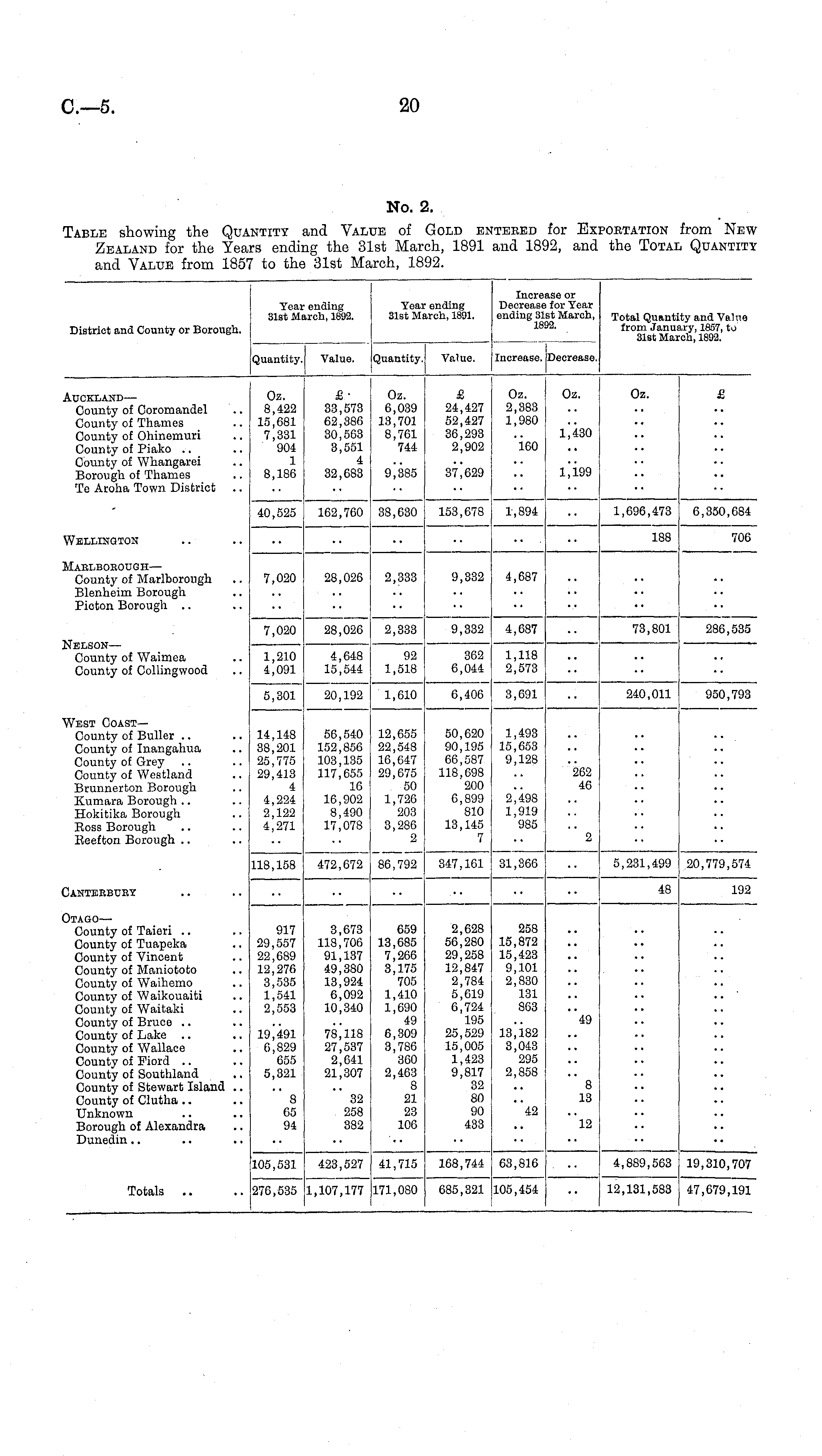 No. 2. Table showing the Quantity and Value of Gold entered for Exportation from New Zealand for the Years ending the 31st March, 1891 and 1892, and the Total Quantity and Value from 1857 to the 31st March, 1892.