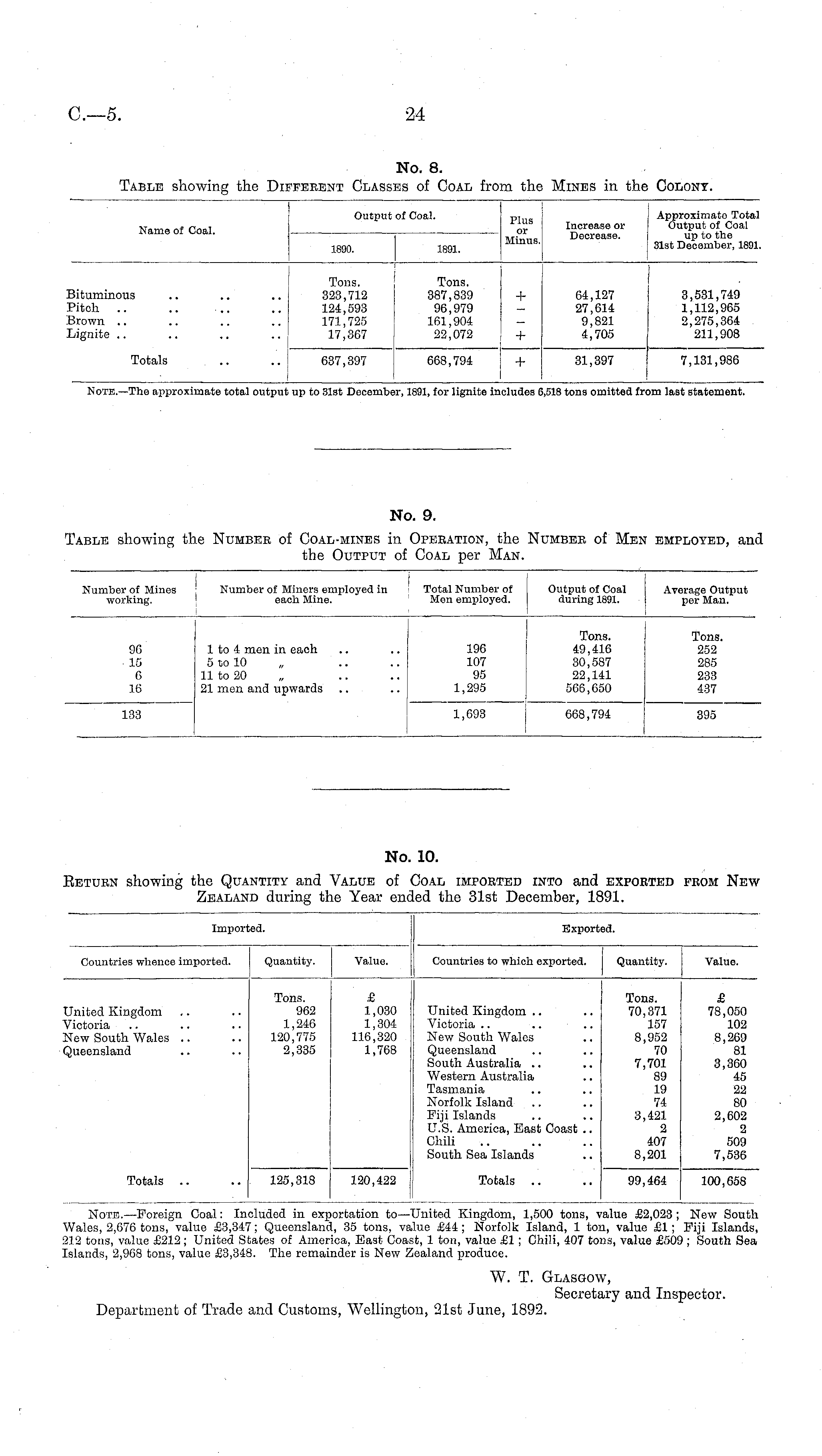 Note. —Foreign Coal: Included in exportation to—United Kingdom, 1,500 tons, value £2,023 ; New South Wales, 2,676 tons, value £3,347; Queensland, 35 tons, value £44 ; Norfolk Island, 1 ton, value £1; Fiji Islands, 212 tons, value £212 ; United States of America, East Coast, 1 ton, value £1; Chili, 407 tons, value £509 ; South Sea Islands, 2,968 tons, value £3,348. The remainder is New Zealand produce. W. T. Glasgow, Secretary and Inspector. Department of Trade and Customs, Wellington, 21st June, 1892.