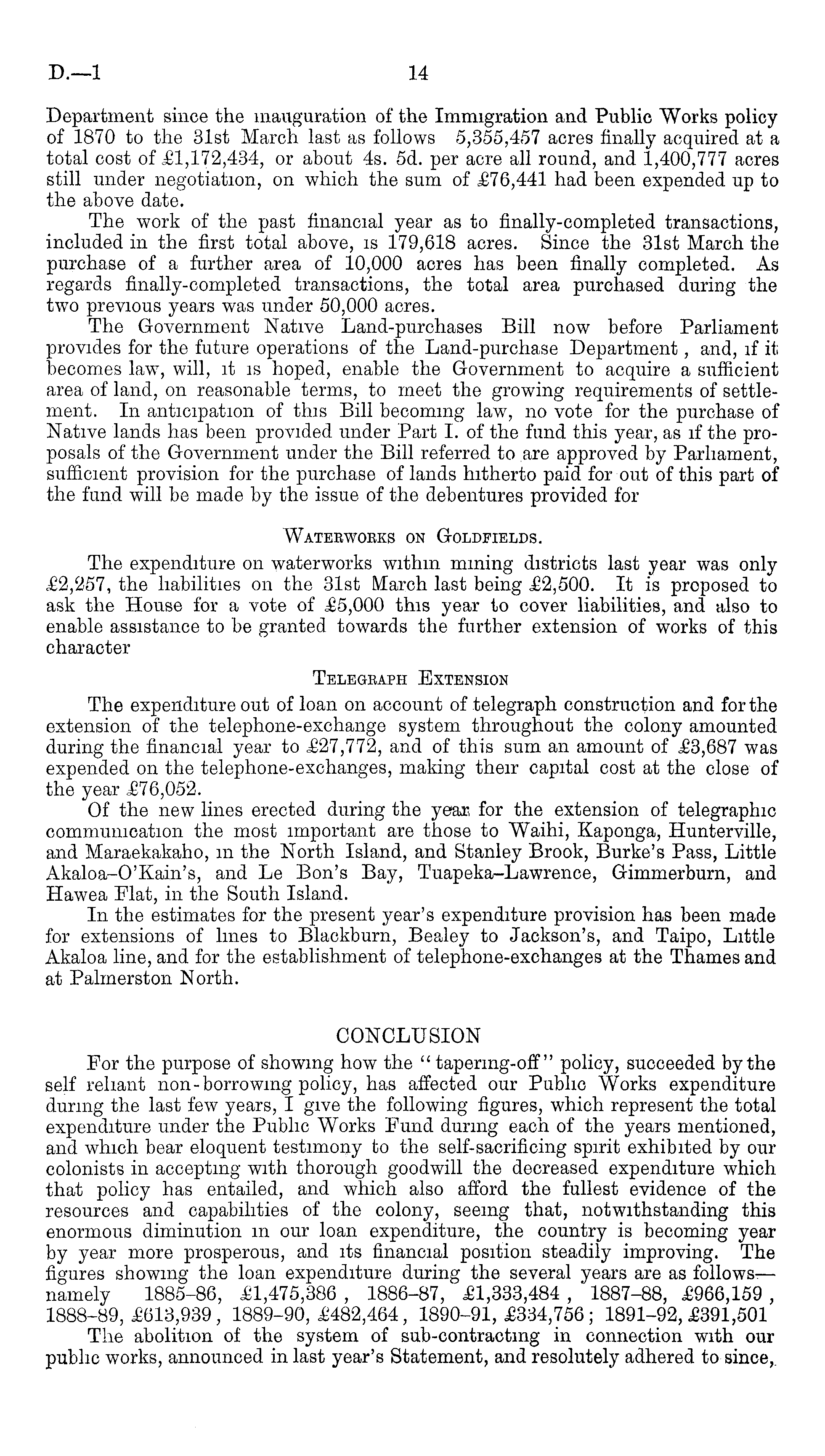 Department since the inauguration of the Immigration and Public Works policy of 1870 to the 31st March last as follows 5,355,457 acres finally acquired at a total cost of £1,172,434, or about 4s. sd. per acre all round, and 1,400,777 acres still under negotiation, on which the sum of £76,441 had been expended up to the above date. The work of the past financial year as to finally-completed transactions, included in the first total above, is 179,618 acres. Since the 31st March the purchase of a further area of 10,000 acres has been finally completed. As regards finally-completed transactions, the total area purchased during the two previous years was under 50,000 acres. The Government Native Land-purchases Bill now before Parliament provides for the future operations of the Land-purchase Department, and, if it becomes law, will, it is hoped, enable the Government to acquire a sufficient area of land, on reasonable terms, to meet the growing requirements of settlement. In anticipation of this Bill becoming law, no vote for the purchase of Native lands has been provided under Part I. of the fund this year, as if the proposals of the Government under the Bill referred to are approved by Parliament, sufficient provision for the purchase of lands hitherto paid for out of this part of the fund will be made by the issue of the debentures provided for Waterworks on Goldfields. The expenditure on waterworks within mining districts last year was only £2,257, the liabilities on the 31st March last being £2,500. It is proposed to ask the House for a vote of £5,000 this year to cover liabilities, and also to enable assistance to be granted towards the further extension of works of this character Telegraph Extension The expenditure out of loan on account of telegraph construction and for the extension of the telephone-exchange system throughout the colony amounted during the financial year to £27,772, and of this sum an amount of £3,687 was expended on the telephone-exchanges, making their capital cost at the close of the year £76,052. Of the new lines erected during the year for the extension of telegraphic communication the most important are those to Waihi, Kaponga, Hunterville, and Maraekakaho, m the North Island, and Stanley Brook, Burkes Pass, Little Akaloa-O'Kain's, and Le Bon's Bay, Tuapeka-Lawrence, Gimmerburn, and Hawea Flat, in the South Island. In the estimates for the present year's expenditure provision has been made for extensions of lines to Blackburn, Bealey to Jackson's, and Taipo, Little Akaloa line, and for the establishment of telephone-exchanges at the Thames and at Palmerston North. CONCLUSION For the purpose of showing how the " tapermg-off " policy, succeeded by the self reliant non-borrowing policy, has affected our Public Works expenditure during the last few years, I give the following figures, which represent the total expenditure under the Public Works Fund during each of the years mentioned, and which bear eloquent testimony to the self-sacrificing spirit exhibited by our colonists in accepting with thorough goodwill the decreased expenditure which that policy has entailed, and which also afford the fullest evidence of the resources and capabilities of the colony, seeing that, notwithstanding this enormous diminution m our loan expenditure, the country is becoming year by year more prosperous, and its financial position steadily improving. The figures showing the loan expenditure during the several years are as follows— namely 1885-86, £1,475,386 , 1886-87, £1,333,484 , 1887-88, £966,159 , 1888-89, £613,939, 1889-90, £482,464, 1890-91, £334,756; 1891-92, £391,501 The abolition of the system of sub-contracting in connection with our public works, announced in last year's Statement, and resolutely adhered to since,
