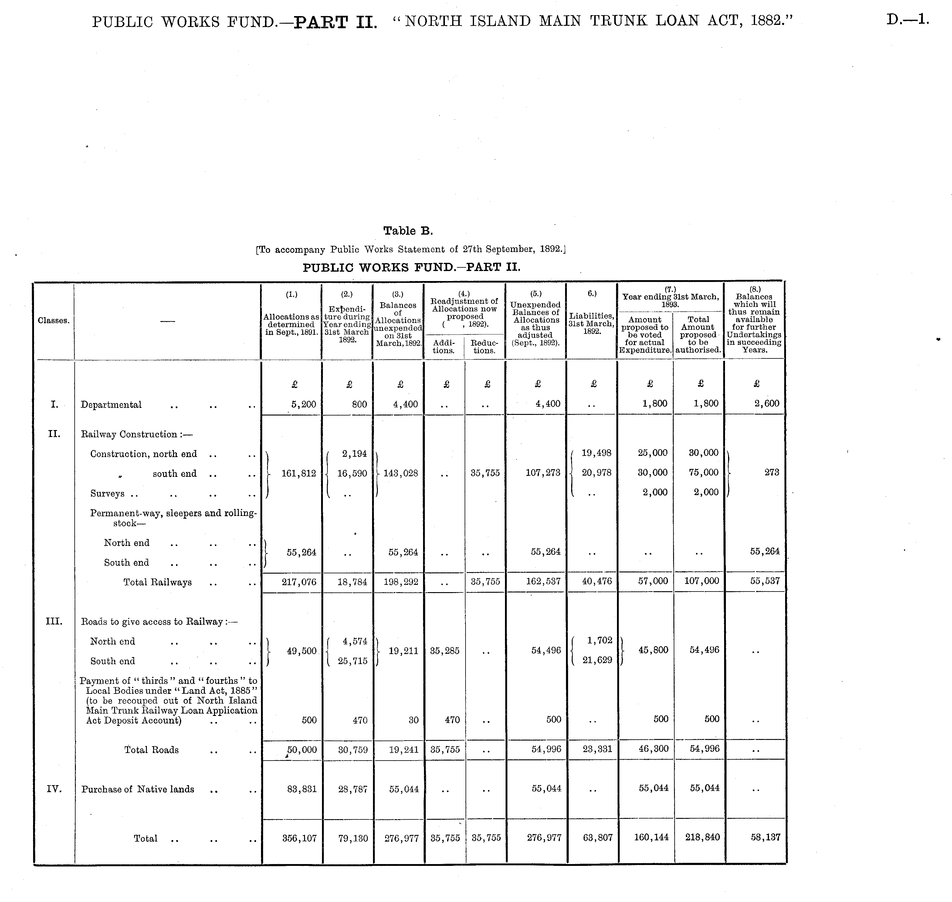 Table B. [To accompany Public Works Statement of 27th September, 1892.] PUBLIC WORKS FUND-PART II.