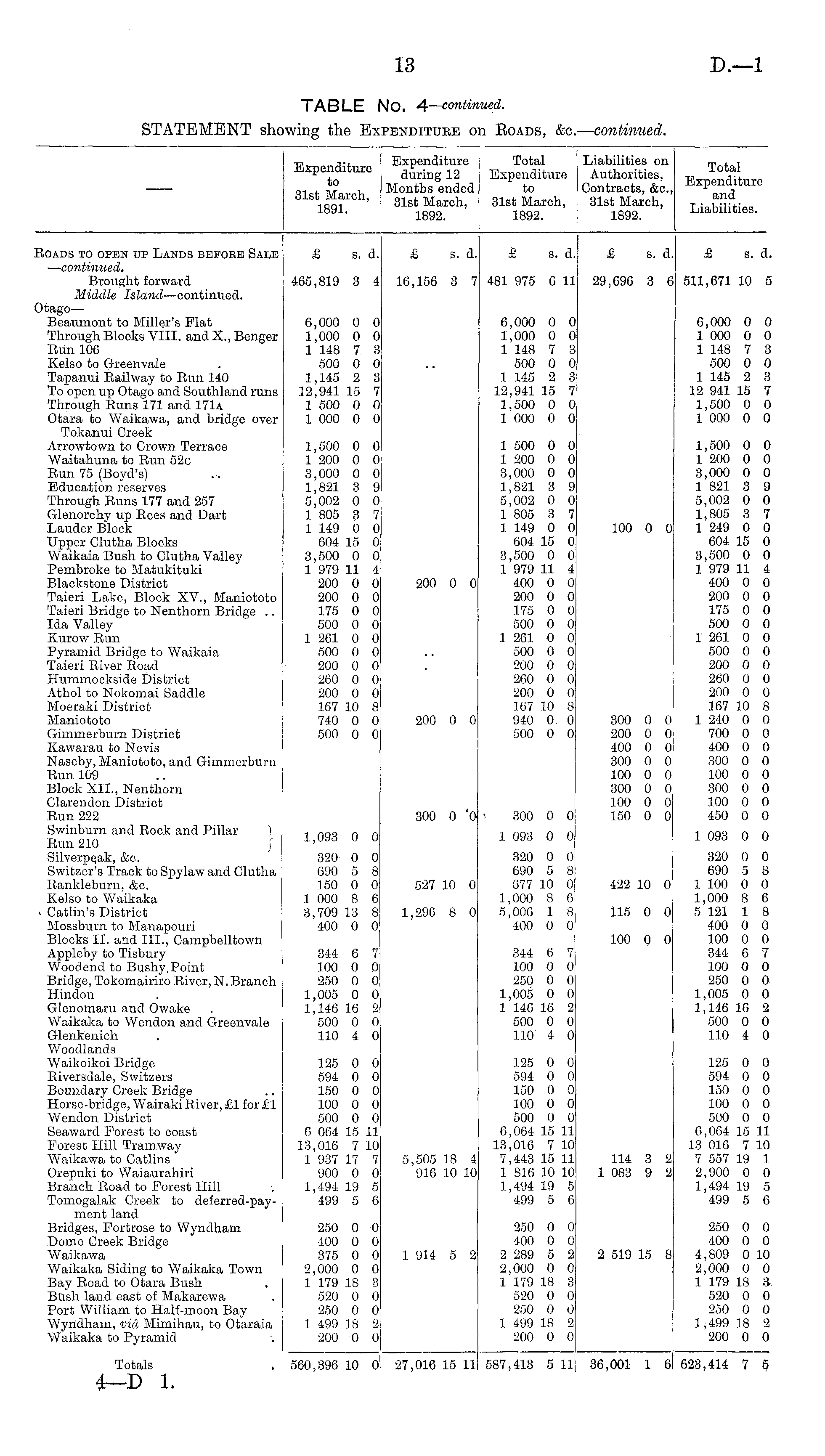 Expenditure to 31st March, 1891. Expenditure during 12 Months ended 31st March, 1892. Total Expenditure to 31st March, 1892. Liabilities on Authorities, Contracts, &c, 31st March, 1892. Total Expenditure and Liabilities. Roads to open up Lands bhfobb Sale — continued. Brought forward Middle Island —continued. £ s. d. 465,819 3 4 £ s. d. 16,156 3 7 £ s. d. 481 975 6 11 £ s. d. 29,696 3 6 £ s. d. 511,671 10 5 Dtago— Beaumont to Miller's Flat Through Blocks VIII. and X., Benger Run 106 Kelso to Greonvale Tapanui Railway to Eun 140 To open up Otago and Southland runs Through Buns 171 and 171a Otara to Waikawa, and bridge over Tokanui Greek Arrowtown to Crown Terrace Waitahuna to Run 52c Run 75 (Boyd's) Education reserves Through Runs 177 and 257 Glenorchy up Rees and Dart Lauder Block Upper Clutha Blocks Waikaia Bush to Clutha Valley Pembroke to Matukituki Blackstone District Taieri Lake, Block XV., JManiototo Taieri Bridge to Nenthorn Bridge .. Ida Valley Kurow Run Pyramid Bridge to Waikaia Taieri River Road Hummocksido District Athol to Nokomai Saddle Moeraki District Maniototo Gimmerburn District Kawarau to Nevis Naseby, Maniototo, and Gimmerburn Run 109 Block XII., Nenthorn Clarendon District Run 222 Swinburn and Rock and Pillar \ Run 210 j" Silverpqak, &c. Switzer's Track to Spylaw and Clutha Rankleburn, &c. Kelso to Waikaka i Catlin's District Mossburn to Manapouri Blocks II. and III., Campbelltown Appleby to Tisbury Woodend to Bushy Point Bridge, Tokomairiro River,N. Branch Hindon Glenomaru and Owake Waikaka to Wendon and Greenvale Glenkenich Woodlands Waikoikoi Bridge Riversdale, Switzers Boundary Creek Bridge Horse-bridge, Wairaki Kiver, £1 for £1 Wendon District Seaward Forest to coast Forest Hill Tramway Waikawa to Catlins Orepuki to Waiauiahiri Branch Road to Forest Hill Tomogalak Creek to deferred-pay-ment land Bridges, Fortrose to Wyndham Dome Creek Bridge Waikawa Waikaka Siding to Waikaka Town Bay Road to Otara Bush Busli land east of Makarewa Port William to Half-moon Bay Wyndham, via Mimihau, to Otaraia Waikaka to Pyramid 6,000 0 0 1,000 0 0 1 148 7 3 500 0 0 1,145 2 3 12,941 15 7 1 500 0 0 1 000 0 0 1,500 0 0 1 200 0 0 3,000 0 0 1,821 3 9 5,002 0 0 1 805 3 7 1 149 0 0 604 15 0 3,500 0 0 1 979 11 4 200 0 0 200 0 0 175 0 0 500 0 0 1 261 0 0 500 0 0 200 0 0 260 0 o! 200 0 0: 167 10 8 740 0 0 500 0 o! 200 0 0 200 0 0 300 0 '0 6,000 0 0 1,000 0 0 1 148 7 3 500 0 0 1 145 2 3 12,941 15 7 1,500 0 0 1 000 0 0 1 500 0 0 1 200 0 0 3,000 0 0 1,821 3 9 5,002 0 0 1 805 3 7 1 149 0 0 604 15 0 3,500 0 0 1 979 11 4 400 0 0 200 0 0 175 0 0 500 0 0 1 201 0 0 500 0 0 200 0 0 260 0 0 200 0 0 167 10 8 940 0 0 500 0 0 300 0 0 1 093 0 0 100 0 0j 300 0 0 200 0 0 400 0 0 300 0 0 100 0 0 300 0 0 100 0 0 150 0 0 6,000 0 0 1 000 0 0 1 148 7 3 500 0 0 1 145 2 3 12 941 15 7 1,500 0 0 1 000 0 0 1,500 0 0 1 200 0 0 3,000 0 0 1 821 3 9 5,002 0 0 1,805 3 7 1 249 0 0 604 15 0 3,500 0 0 1 979 11 4 400 0 0 200 0 0 175 0 0 500 0 0 1 261 0 0 500 0 0 200 0 0 260 0 0 200 0 0 167 10 8 1 240 0 0 700 0 0 400 0 0 300 0 0 100 0 0 300 0 0 100 0 0 450 0 0 1 093 0 0 1,093 0 0 320 0 0 C90 5 8 150 0 0 1 000 8 6 3,709 13 8 400 0 0 1 527 10 0 320 0 0 690 5 8 077 10 0 1,000 8 0 5,006 1 8, 400 0 0 : 422 10 0 I 320 0 0 690 5 8 1 100 0 0 1,000 8 6 5 121 1 8 400 0 0 100 0 0 344 6 7 100 0 0 250 0 0 1,005 0 0 1,146 16 2 500 0 0 110 4 0 1,296 8 0 115 0 0 ! 100 0 0 344 6 7 100 0 0 250 0 0 1,005 0 0 1,146 1C 2 500 0 0 110 4 0 344 6 7 100 0 0 250 0 0 1,005 0 0 1 146 16 2 500 0 0 110 4 0 125 0 0 594 0 0 150 0 0 100 0 0 500 0 0 6 064 15 11 13,010 7 10 1 937 17 7 900 0 0 1,494 19 5 499 5 6 125 0 0 594 0 0 150 0 0 100 0 0 500 0 0 6,004 15 11 13,016 7 10 7,443 15 11 1 816 10 10 1,494 19 5 499 5 0 125 0 0 594 0 0 150 0 0 100 0 0 500 0 0 6,064 15 11 13 010 7 10 7 557 19 ] 2,900 0 0 1,494 19 5 499 5 6 5,505 18 4 916 10 10 114 3 2 1 083 9 2 250 0 0 400 0 0 375 0 0 2,000 0 0 1 179 18 3 520 0 0 250 0 0 1 499 18 2 200 0 0 1 914 5 2 250 0 0 400 0 0 2 289 5 2 2,000 0 0 1 179 18 3 520 0 0 250 0 0 1 499 18 2 200 0 0 2 519 15 8 250 0 0 400 0 0 4,S09 0 10 2,000 0 0 1 179 18 3 520 0 0 250 0 0 1,499 18 2 200 0 0 Totals 560,396 10 01 27,016 15 11 587,413 5 11 36,001 1 6 623,414 7 5