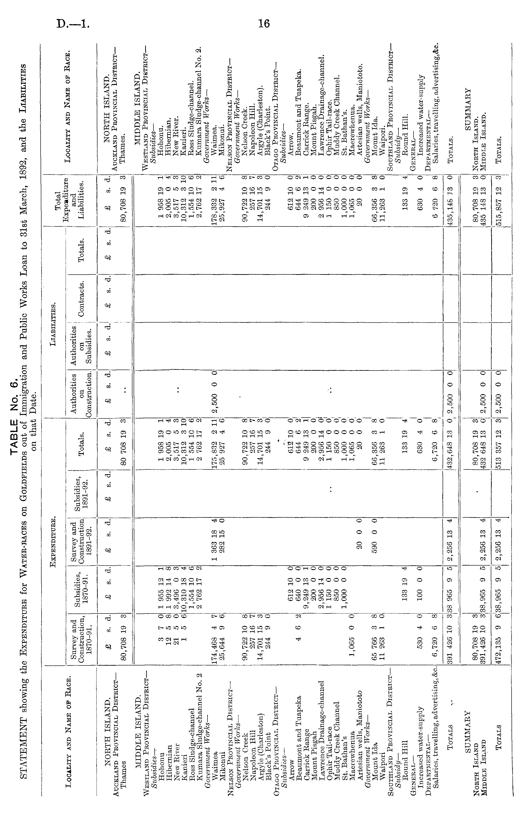 TABLE No. 6. STATEMENT showing the Expenditure for Water-races on Goldfields out of Immigration and Public Works Loan to 31st March, 1892, and the Liabilities on that Date.
