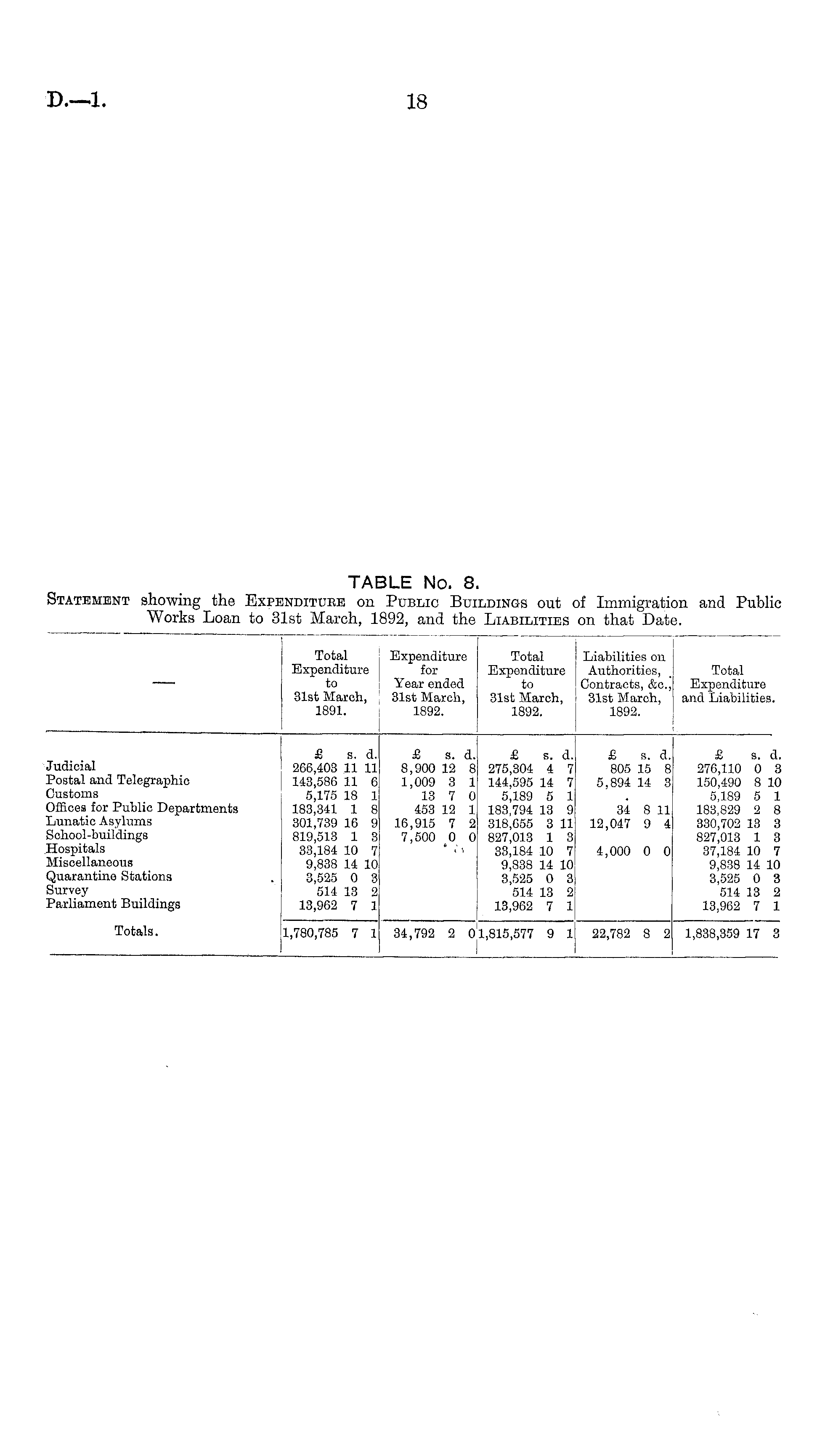 TABLE No. 8. Statement showing the Expenditure on Public Buildings out of Immigration and Public Works Loan to 31st March, 1892, and the Liabilities on that Date.