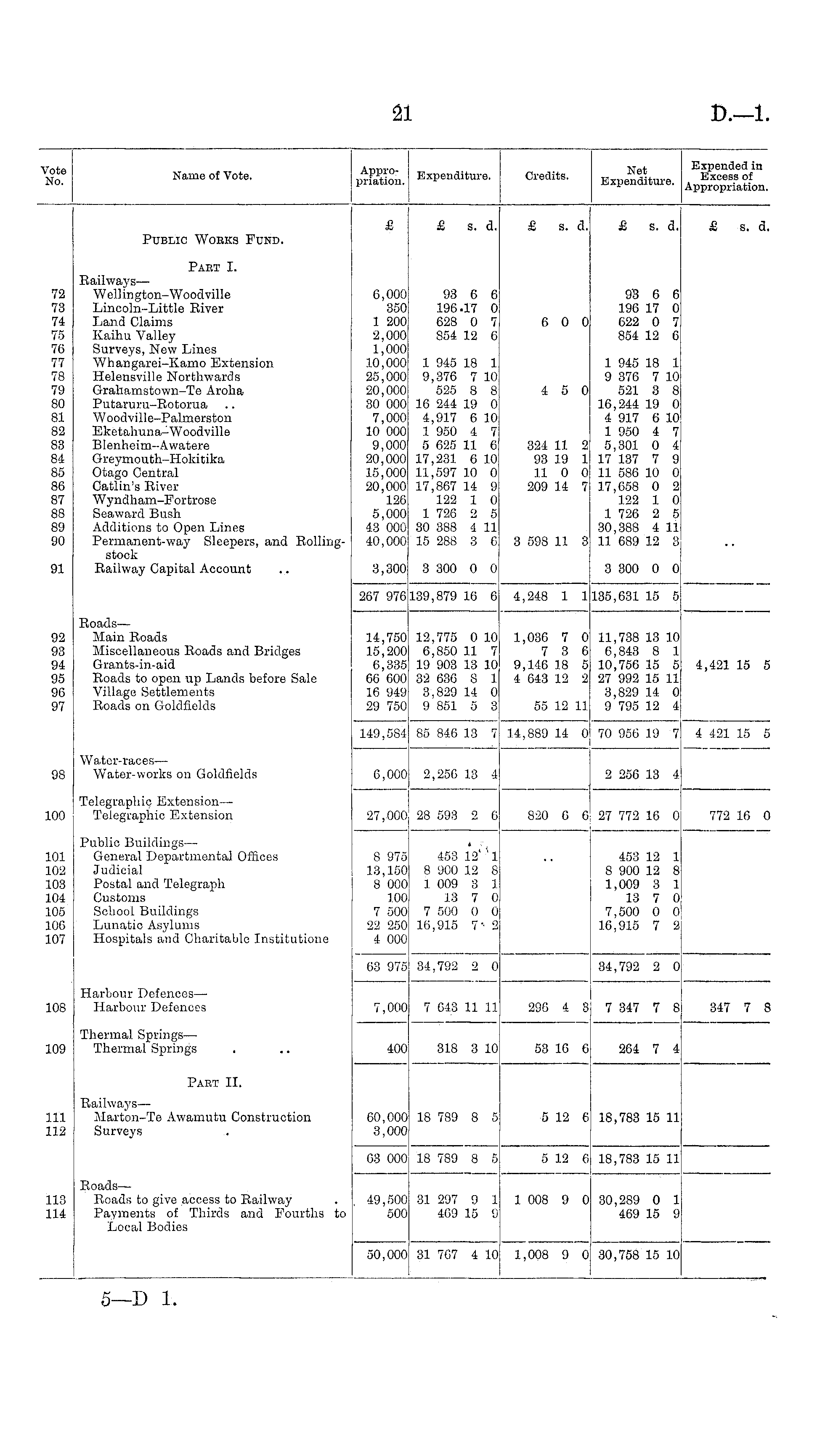 Vote No. Name of Vote. Appropriation. Expenditure. Credits. Net Expended in Expenditure. £ s. d. & s. a. £ s. a. £ s. a. Public Woeks Fund. Pabt I. 93 6 6 196.17 0 628 0 7 S54 12 6 93 6 6 196 17 0 622 0 7 854 12 6 72 73 74 75 76 77 78 79 SO 81 82 83 84 85 86 87 88 89 90 Railways— Wellington-Woodville Lincoln-Little River Land Claims Kaihu Valley Surveys, New Lines Whangarei-Kamo Extension Helensville Northwards Grahamstown-Te Aroha Putaruru-Rotorua Woodville-Palmerston Eketahuna-Woodville Blenheim-Awatere Greymouth-Hokitika Otago Central Catlin's River Wyndham-Fortrose Seaward Bush Additions to Open Lines Permanent-way Sleepers, and Rollingstock Railway Capital Account 6,000 350 1 200 2,000 1,000 10,000 25,000 20,000 30 000 7,000 10 000 9,000 20,000 15,000 20,000 126 5,000 43 000 40,000 1 945 18 1 9,376 7 10 525 8 8 16 244 19 0 4,917 6 10 1 950 4 7 5 625 11 6 17,231 6 10 11,597 10 0 17,867 14 9 122 1 0 1 726 2 5 30 388 4 11 15 288 3 6 6 0 0 4 5 0 324 11 2 93 19 1 11 0 0 209 14 7 1 945 18 1 9 376 7 10 521 3 8 16,244 19 0 4 917 6 10 1 950 4 7 5,301 0 4 17 137 7 9 11 586 10 0 17,658 0 2 122 1 0 1 726 2 5 30,388 4 11 11 689 12 3 3 598 11 3 91 3,300 3 300 0 0 3 300 0 O^ 267 976 139,879 16 6 4,248 1 1 135,631 15 5 92 93 94 95 96 97 Roads— Main Roads Miscellaneous Roads and Bridges Grants-in-aid Roads to open up Lands before Sale Village Settlements Roads on Goldfields 14,750 15,200 6,335 66 600 16 949 29 750 12,775 0 10 6,850 11 7 19 903 13 10J 32 636 8 1 3,829 14 0 9 851 5 3 1,036 7 0 7 3 6 9,146 18 5 4 643 12 2 11,738 13 10 6,843 8 1 10,756 15 5 27 992 15 11 3,829 14 0 9 795 12 4 4,421 15 5 55 12 11 Water-races — Water-works on Goldfields 149,584 85 846 13 7 14,889 14 0 70 956 19 7! 4 421 15 5 98 6,000 2,256 13 4 2 256 13 4 Telegraphic Extension— Telegraphic Extension 100 27,000 28 593 2 6 820 6 6 27 772 16 0 772 16 0 101 102 103 104 105 106 107 Public Buildings— General Departmental Offices Judicial Postal and Telegraph Customs School Buildings Lunatic Asylums Hospitals and Charitable Institutions 8 975 13,150 8 000 100 7 500| 22 250! 4 000 453 12" ' 1 8 900 12 8 1 009 3 1 13 7 0 7 500 0 0 16,915 7 ■ 2 453 12 1 8 900 12 8 1,009 3 1 13 7 0 7,500 0 0 ; 16.915 7 2 63 975! 3-1,702 2 0 34,792 2 0 Harbour Defences — Harbour Defences 10S 7,000l 7 6-13 11 11 296 4 3 7 347 7 8 347 7 8 Thermal Springs— Thermal Springs 109 400 318 3 10 53 16 6 204 7 4 Pabt II. 111 112 Railways— Marton-Te Awamutu Construction Surveys 60,000' 3,0001 18 789 8 5 ; 5 12 6 18,783 15 11 03 000 18 789 8 5 5 12 Gl 18,783 15 11 Roads— Roads to give access to Railway Payments of Thirds and Fourths to Local Bodies 49,500 500 31 297 9 1 469 15 8 1 008 9 0 30,289 0 1 469 15 9 113 114 50,000 31 767 4 10! 1,008 9 0 30,758 15 10