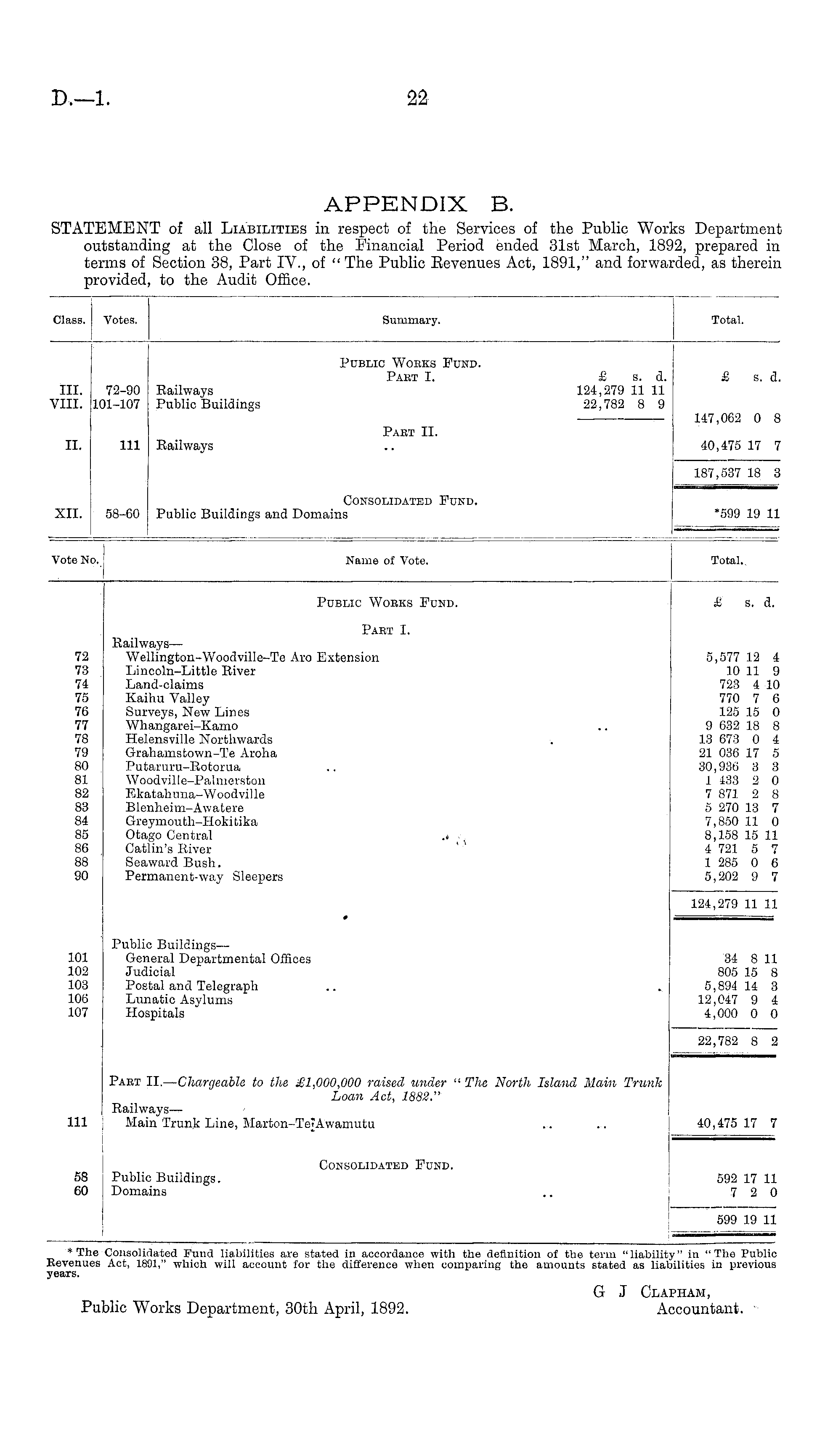 APPENDIX B. STATEMENT of all Liabilities in respect of the Services of the Public Works Department outstanding at the Close of the Financial Period ended 31st March, 1892, prepared in terms of Section 38, Part IV., of "The Public Revenues Act, 1891," and forwarded, as therein provided, to the Audit Office.