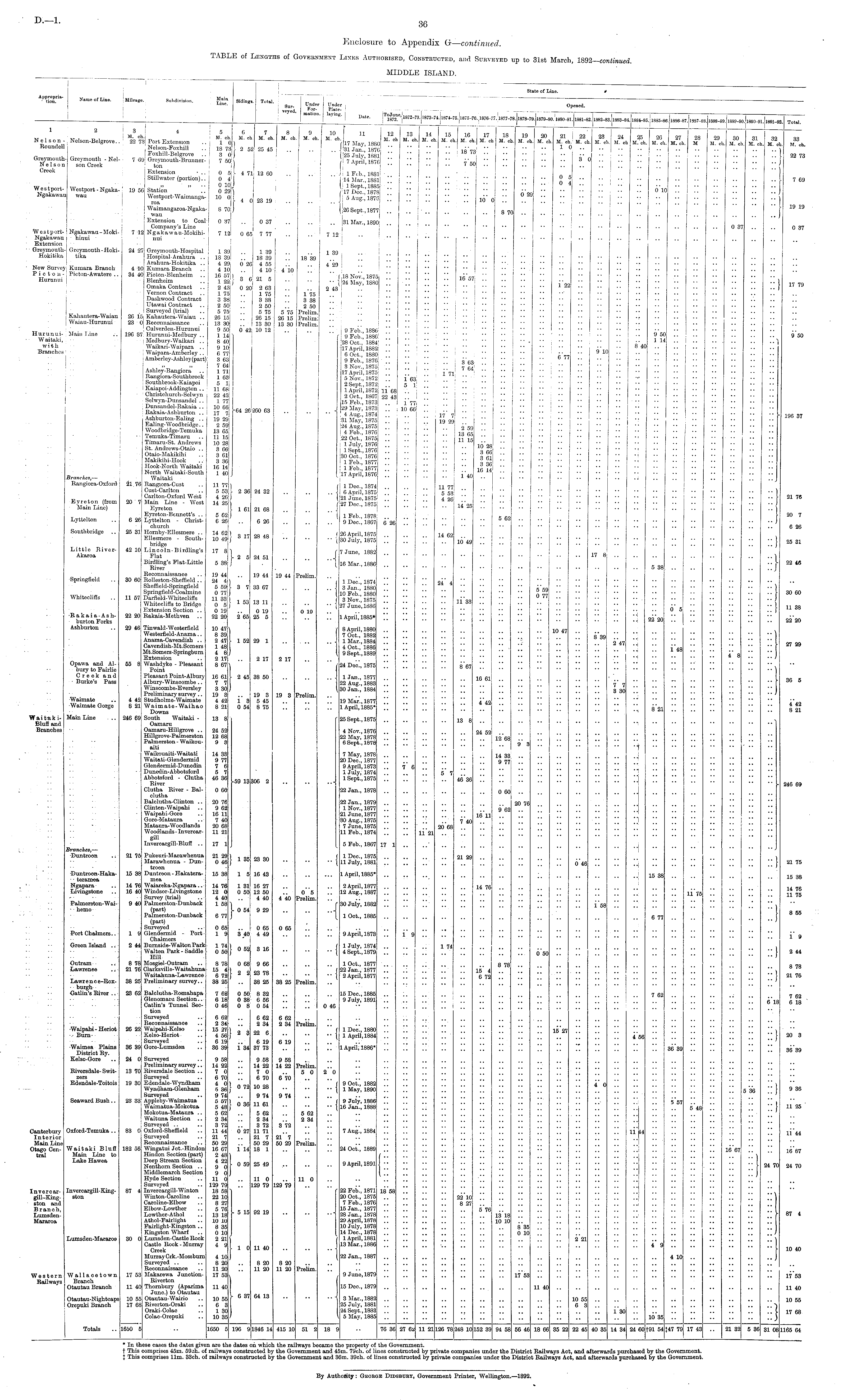 Enclosure to Appendix G—continued. TABLE of Lengths of Government Lines Authorised, Constructed, and Surveyed up to 31st March, 1892-continued. MIDDLE ISLAND.