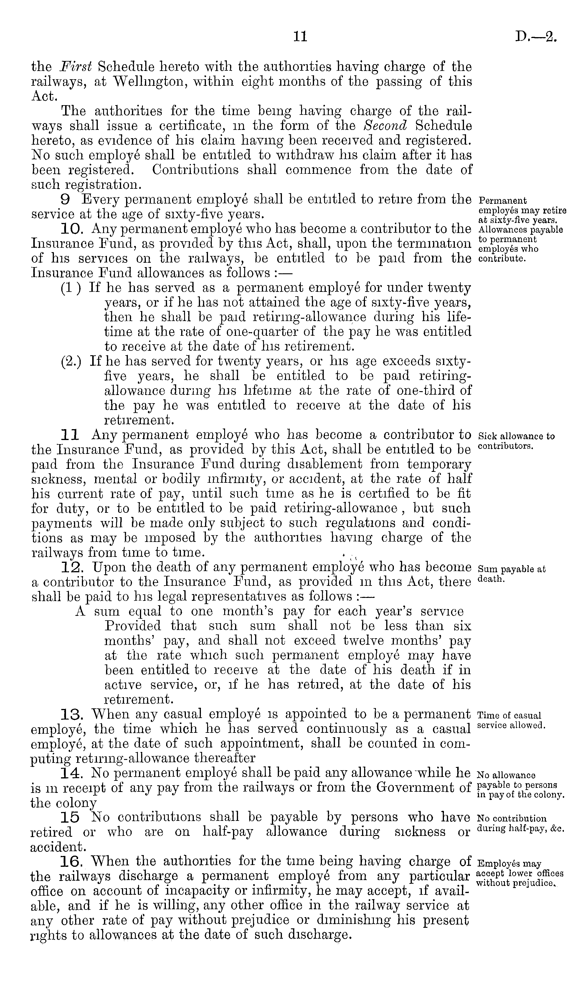 the First Schedule hereto with the authorities having charge of the railways, at Wellington, within eight months of the passing of this Act. The authorities for the time being having charge of the railways shall issue a certificate, in the form of the Second Schedule hereto, as evidence of his claim having been received and registered. No such employe shall be entitled to withdraw his claim after it has been registered. Contributions shall commence from the date of such registration. 9 Every permanent employe shall be entitled to retire from the service at the age of sixty-five years. 10. Any permanent employe who has become a contributor to the Insurance Fund, as provided by this Act, shall, upon the termination of his services on the railways, be entitled to be paid from the Insurance Fund allowances as follows : — (1) If he has served as a permanent employe for under twenty years, or if he has not attained the age of sixty-five years, then he shall be paid retiring-allowance during his lifetime at the rate of one-quarter of the pay he was entitled to receive at the date of his retirement. (2.) If he has served for twenty years, or his age exceeds sixtyfive years, he shall be entitled to be paid retiringallowance during his lifetime at the rate of one-third of the pay he was entitled to receive at the date of his retirement. 11 Any permanent employe who has become a contributor to the Insurance Fund, as provided by this Act, shall be entitled to be paid from the Insurance Fund during disablement from temporary sickness, mental or bodily infirmity, or accident, at the rate of half his current rate of pay, until such time as he is certified to be fit for duty, or to be entitled to be paid retiring-allowance , but such payments will be made only subject to such regulations and conditions as may be imposed by the authorities having charge of the railways from time to time. 12. Upon the death of any permanent employe who has become a contributor to the Insurance Fund, as provided in this Act, there shall be paid to his legal representatives as follows : — A sum equal to one month's pay for each year's service Provided that such sum shall not be less than six months' pay, and shall not exceed twelve months' pay at the rate which such permanent employe may have been entitled to receive at the date of his death if in active service, or, if he has retired, at the date of his retirement. 13. When any casual employe is appointed to be a permanent employe, the time which he has served continuously as a casual employe, at the date of such appointment, shall be counted in computing retiring-allowance thereafter 14. No permanent employe shall be paid any allowance while he is m receipt of any pay from the railways or from the Government of the colony 15 No contributions shall be payable by persons who have retired or who are on half-pay allowance during sickness or accident. 16. When the authorities for the time being having charge of the railways discharge a permanent employe from any particular office on account of incapacity or infirmity, he may accept, if available, and if he is willing, any other office in the railway service at any other rate of pay without prejudice or diminishing his present rights to allowances at the date of such discharge.