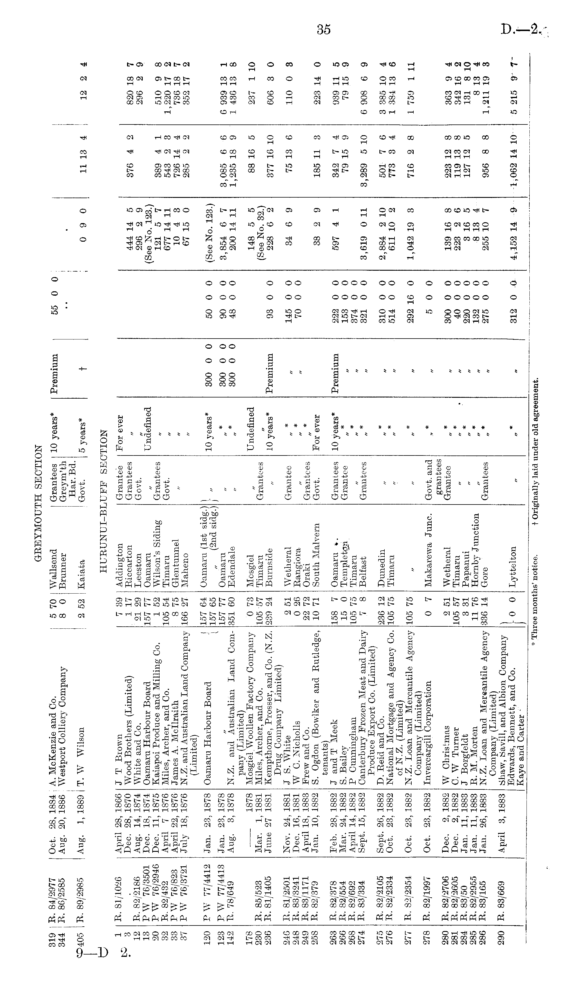 319 344 [ 405 R. 84/2977 R. 86/2585 Oct. 28, 1884 Aug. 20, 1886 A. McKenzie and Co. Westport Colliery Company T. \V Wilson i 5 70 8 0 2 52 Wallsend Brunner Grantees ! Grevm'th I Har. Bd. Govt, I 10 years* 5 years* Premium t 55 0 0 0 9 0 11 13 4 ! 12 2 4 R, 89/2985 Aug. 1, 1889 | Kaiata R. 81/1020 April 28, 1866 Dec. 28, 1870 Aug. 14, 1874 Dec. 18, 1874 Dec. 11, 1875 April 7 1876 April 22, 1876 July 18, 1876 J T Brown Wood Brothers (Limited) White and Co. Oamaru Harbour Board Kaiapoi Produce and Milling Co. Miles, Archer, and Co. James A. Mcllraith N.Z. and Australian Land Company (Limited) HURUNUI-BI ,UFF SEC TION 1 3 12 13 20 32 33 37 R. 82/2186 P W 70/3501 P W 76/2940 R. 82/432 P W 76/823 P W 76/3721 7 39 1 17 21 29 157 77 1 52 105 54 8 75 166 27 Addington Riccarton Leeston Oamaru Wilson's Siding Timaru Glentunnel Maheno Grantee Grantees Govt. Grantees Govt. For ever Undefined 444 14 5 296 2 9 (See No. 123.) 121 5 7 677 14 11 10 4 3 67 15 0 376 4 2 389 4 1 543 2 3 726 14 4 285 2 2 820 18 7 296 2 9 510 9 8 1,220 17 2 736 18 7 352 17 2 " " 120 123 142 PW 77/4412 P W 77/4413 R. 78/649 •Jan. 23, 1878 Jan. 23, 1S78 Aug. 3, 1878 Oamaru Harbour Board 157 64 157 65 157 77 351 60 Oamaru (1st sidg.) (2nd sidg.) Oamaru Edendale I " 10 years* * 300 0 0 300 0 0 300 0 0 50 0 0 90 0 0 48 0 0 (See No. 123.) 3,854 6 7 200 14 11 3,085 6 6 1,235 18 9 0 939 13 1 1 436 13 8 178 230 236 246 248 249 258 263 266 268 274 R. 85/523 R. 81/1405 R. 81/2501 R. 83/3241 R. 83/1171 R. 82/379 R. 82/378 R. 82/554 R, 82/692 R. 83/334 1878 Mar. 1, 1881 June 27 1881 Nov. 24, 1881 Dec. 16, 1881 April 18, 1883 Jan. 10, 1882 Feb. 28, 1882' Mar. 24, 1882 April 14, 1882 Sept. 15, 1882 N.Z. and Australian Land Company (Limited) Mosgiel Woollen Factory Company Miles, Archer, and Co. Kempthorne, Prosser, and Co. (N.Z. Drug Company Limited) J S. White W C. Nicholls Frew and Co. S. Ogdon (Bowlker and Rutledge, tenants) J and T Meek S. Bailey P Cunningham Canterbury Frozen Meat and Dairy Produce Export Go. (Limited) D. Reid and Co. National Mortgage and Agency Co. of N.Z. (Limited) N.Z. Loan and Mercantile Agency Company (Limited) Invercargill Corporation 0 73 105 57 239 24 2 51 0 26 22 72 10 71 158 7 15 0 105 75 7 8 Mosgiel Timaru Burnside Wetheral Rangiora Oraki South Malvern Oamaru ». Templetgn Timaru Belfast Grantees Grantee Grantees Govt. Grantees Grantee Undefined 10 years* * For ever 10 years* * Premium Premium 93 0 0 145 0 0 70 0 0 222 0 0 153 0 0 374 0 0 321 0 0 148 5 5 (See No. 32.) 228 6 2 34 6 9 38 2 9 597 4 1 88 16 5 377 10 10 75 13 6 185 11 3 342 7 4 79 15 9 237 1 10 606 3 0 110 0 3 223 14 0 939 11 5 79 15 9 Grantees 3,619 0 11 3,289 5 10 6 908 6 9 275 276 R. 82/2105 R. 82/2334 Sept. 26, 1882 Oct. 23, 1882 236 12 105 75 Dunedin Timaru 310 0 0 514 0 0 2,884 2 10 611 10 2 501 7 6 773 3 4 3 385 10 4 1 384 13 6 277 R. 82/2354 Oct. 23, 1882 105 75 * 292 16 0 1,042 19 3 716 2 8 1 759 1 11 » 278 R. 82/1997 Oct. 23, 1882 0 7 Makarewa June. Govt, and gran tees Grantee * 5 0 0 280 281 284 285 286 R. 82/2706 R. 82/2605 R. 83/50 R. 82/2955 R. 83/165 Dec. 2, 1882 Dec. 2, 1882 Jan. 11, 1883 Jan. 11, 1883 Jan. 26, 1883 W Christmas C. W Turner J Borgfcldt R. M. Morten N.Z. Loan and Mersantile Agency Company (Limited) Shaw, Savill, and Albion Company Edwards, Bennett, and Co. Kaye and Carter ■ 2 51 105 57 3 31 11 76 336 14 Wetheral Timaru Papanui Hornby Junction Gore * 300 0 0 40 0 0 220 0 0 132 0 0 275 0 0 139 16 8 223 2 6 3 16 5 8 13 4 255 10 7 223 12 8 119 13 8 127 12 5 956 8 8 363 9 4 342 16 2 131 8 10 8 13 4 1,211 19 3 Grantees * * 290 R. 83/669 April 3, 1883 ) .- 0 0 J Lyttelton 312 0 0 4,152 14 9 1,062 14 10 5 215 9 7 * Three months' notice. t Originally laid under old agreement.