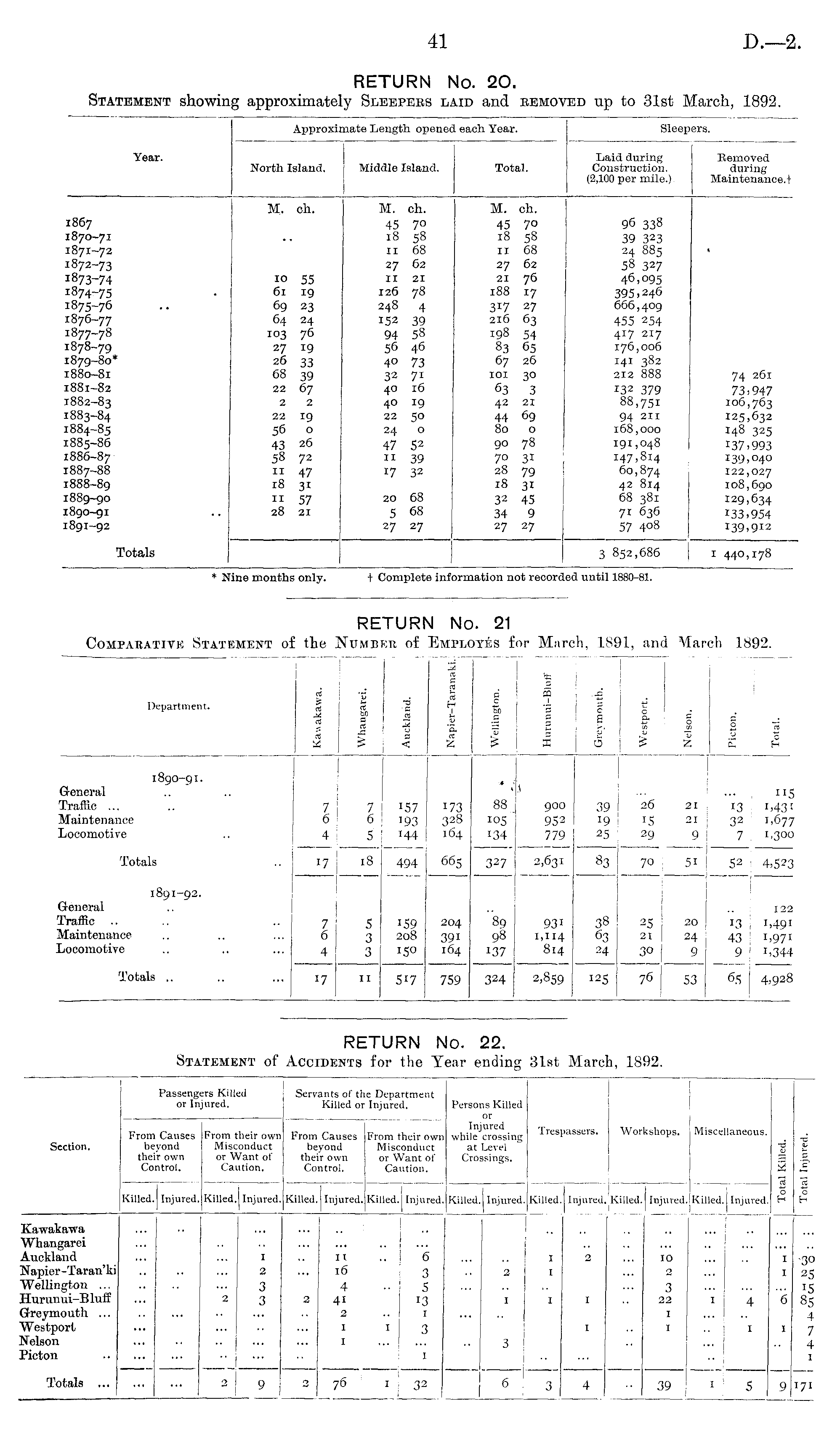 RETURN No. 20. Statement showing approximately Sleepers laid and removed up to 31st March, 1892.