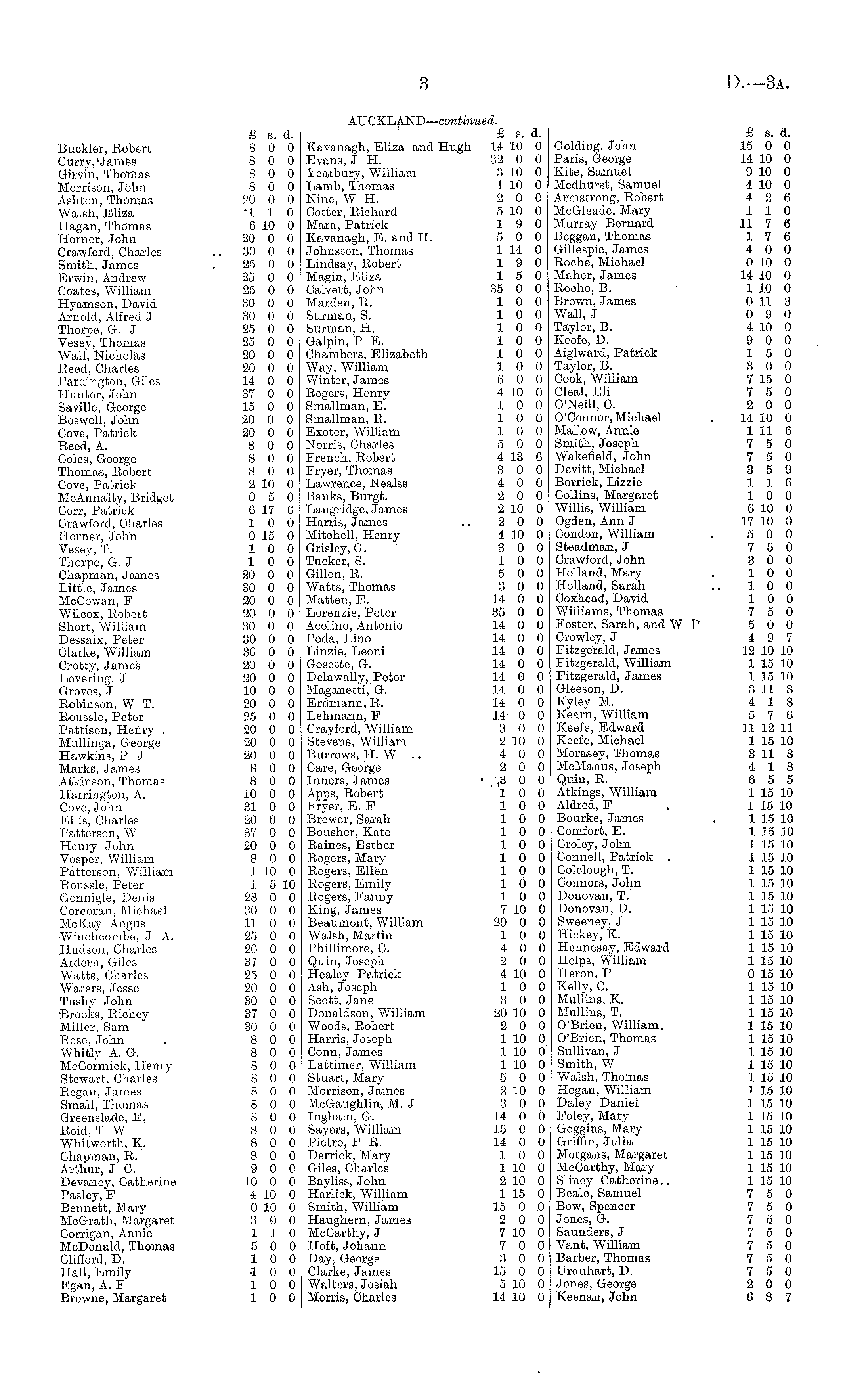 AUCKLAND— continued. £ s. d. & s. d. £ s. d. Buckler, Robert 8 0 0 Kavanagh, Eliza and Hugh 14 10 0 Golding, John 15 0 0 Curry,* James 8 0 0 Evans, J H. 32 0 0 Paris, George 14 10 0 Girvin, Thomas 8 0 0 Yeaibury, William 3 10 0 Kite, Samuel 9 10 0 Morrison, John 8 0 0 Lamb, Thomas 1 10 0 Medhurst, Samuel 4 10 0 Ashton, Thomas 20 0 0 Nine, W H. 2 0 0 Armstrong, Robert 4 2 6 Walsh, Eliza 110 Cotter, Richard 5 10 0 McGleade, Mary 110 Hagan, Thomas 6 10 0 Mara, Patrick 19 0 Murray Bernard 11 7 6 Homer, John 20 0 0 Kavanagh, E. and H. 5 0 0 Beggan, Thomas 17 6 Crawford, Charles .. 30 0 0 Johnston, Thomas 114 0 Gillespie, James 4 0 0 Smith, James . 25 0 0 Lindsay, Robert 19 0 Roche, Michael 0 10 0 Erwin, Andrew 25 0 0 Magin,'Eliza 15 0 Maher, James 14 10 0 Coates, William 25 0 0 Calvert, John 35 0 0 Roehe, B. 1 10 0 Hyamson, David 30 0 0 Harden, R. 10 0 Brown, James 0 11 3 Arnold, Alfred J 30 0 0 Surman, S. 10 0 Wall, J 0 9 0 Thorpe, G. J 25 0 0 Surman, H. 10 0 Taylor, B. 4 10 0 Vesey, Thomas 25 0 0 Galpin, P E. 10 0 Keefe, D. 9 0 0 Wall, Nicholas 20 0 0 Chambers, Elizabeth 10 0 Aiglward, Patrick 15 0 Reed, Charles 20 0 0 Way, William 10 0 Taylor, B. 3 0 0 Pardington, Giles 14 0 0 Winter, James 0 0 0 Cook, William 7 15 0 Hunter, John 37 0 0 Rogers, Henry 4 10 0 Oleal, Eli 7 5 0 Saville, George 15 0 0 Smallman, E. 10 0 O'Neill, C. 2 0 0 Boswell, John 20 0 0 Smallman, R. 10 0 O'Connor, Michael . 14 10 0 Cove, Patrick 20 0 0 Exeter, William 10 0 Mallow, Annie 1 11 6 Reed, A. 8 0 0 Norris, Charles 5 0 0 Smith, Joseph 7 5 0 Coles, George 8 0 0 French, Robert 4 13 6 Wakefield, John 7 5 0 Thomas, Robert 8 0 0 Fryer, Thomas 3 0 0 Devitt, Michael 3 5 9 Cove, Patrick 2 10 0 Lawrence, Nealss 4 0 0 Borrick, Lizzie 116 McAnnalty, Bridget 0 5 0 Banks, Burgt. 2 0 0 Collins, Margaret 10 0 Corr, Patrick 6 17 6 Langridge, James 2 10 0 Willis, William 6 10 0 Crawford, Charles 10 0 Harris, James .. 2 0 0 Ogden, Ann J 17 10 0 Homer, John 0 15 0 Mitchell, Henry 4 10 0 Condon, William . 5 0 0 Vesey, T. 10 0 Grisley, G. 3 0 0 Stoadman, J 7 5 0 Thorpe, G. J 10 0 Tucker, S. 10 0 Crawford, John 3 0 0 Chapman, James 20 0 0 Gillon, R. 5 0 0 Holland, Mary .. 10 0 Little, James 30 0 0 Watts, Thomas 3 0 0 Holland, Sarah .. 10 0 McCowan, P 20 0 0 Matten, E. 14 0 0 Ooxhead, David 10 0 Wilcox, Robert 20 0 0 Lorenzie, Potor 35 0 0 Williams, Thomas 7 5 0 Short, William 30 0 0 Acolino, Antonio 14 0 0 Poster, Sarah, and W P 5 0 0 Dessaix, Peter 30 0 0 Poda, Lino 14 0 0 Crowley, J 4 9 7 Clarke, William 36 0 0 Linzie, Leoni 14 0 0 Fitzgerald, James 12 10 10 Crotty, James 20 0 0 Gosette, G. 14 0 0 Fitzgerald, William 1 15 10 Loveriug, J 20 0 0 Delawally, Peter 14 0 0 Fitzgerald, James 1 15 10 Groves, J 10 0 0 Maganetti, G. 14 0 0 Gleeson, D. 3 11 8 Robinson, W T. 20 0 0 Erdmann, R. 14 0 0 Kyley M. 4 18 Roussle, Peter 25 0 0 Lehmann, P 14 0 0 Kearn, William 5 7 6 Pattison, Henry . 20 0 0 Crayford, William 3 0 0 Keefe, Edward 11 12 11 Mullinga, George 20 0 0 Stevens, William 2 10 0 Keefe, Michael 1 15 10 Hawkins, P J 20 0 0 Burrows, H. W .. 4 0 0 Morasey, Thomas 311 8 Marks, James 8 0 0 Care, George 2 0 0 McManus, Joseph 4 18 Atkinson, Thomas 8 0 0 Inners, James ' ;,3 0 0 Quin, R. 6 5 5 Harrinfton, A. 10 0 0 Apps, Robert 10 0 Atkings, William 1 15 10 Cove, John 31 0 0 Fryer, E. P 10 0 Aldred, P . 1 15 10 Ellis, Charles 20 0 0 Brewer, Sarah 10 0 Bourke, James . 1 15 10 Patterson, W 37 0 0 Bousher, Kate 10 0 Comfort, E. 1 15 10 Henry John 20 0 0 Raines, Esther 10 0 Croley, John 1 15 10 Vosper, William 8 0 0 Rogers, Mary 10 0 Connell, Patrick . 1 15 10 Patterson, William 1 10 0 Rogers, Ellen 10 0 Colclough, T. 1 15 10 Roussle, Peter 1 5 10 Rogers, Emily 10 0 Connors, John 1 15 10 Gonnigle, Denis 28 0 0 Rogers, Fanny 10 0 Donovan, T. 1 15 10 Corcoran, Michael 30 0 0 King, James 7 10 0 Donovan, D. 1 15 10 McKay Angus 11 0 0 Beaumont, William 29 0 0 Sweeney, J 1 15 10 Winchcombe, J A. 25 0 0 Walsh, Martin 10 0 Hickey, K. 1 15 10 Hudson, Charles 20 0 0 Phillimore, C. 4 0 0 Hennesay, Edward 1 15 10 Ardern, Gilos 37 0 0 Quin, Joseph 2 0 0 Helps, William 1 15 10 Watts, Charles 25 0 0 Healey Patrick 4 10 0 Heron, P 0 15 10 Waters, Jesse 20 0 0 Ash, Joseph 10 0 Kelly, C. 1 15 10 Tushy John 30 0 0 Scott, Jane 3 0 0 Mullins, K. 1 15 10 Brooks, Richey 37 0 0 Donaldson, William 20 10 0 Mullins, T. 1 15 10 Miller, Sam " 30 0 0 Woods, Robert 2 0 0 O'Brien, William. 1 15 10 Rose, John ~ 8 0 0 Harris, Joseph 1 10 0 O'Brien, Thomas 1 15 10 Whitly A. G. 8 0 0 Conn, James 1 10 0 Sullivan, J 1 15 10 McCormick, Henry 8 0 0 Lattimer, William 1 10 0 Smith, W 1 15 10 Stewart, Charles 8 0 0 Stuart, Mary 5 0 0 Walsh, Thomas 1 15 10 Regan, James 8 0 0 Morrison, James 2 10 0 Hogan, William 1 15 10 Small, Thomas 8 0 0 McGaughlin, M. J 3 0 0 Daley Daniel 1 15 10 Greenslade, E. 8 0 0 Ingham, G. 14 0 0 Foley, Mary 1 15 10 Reid, T W 8 0 0 Sayers, William 15 0 0 Goggins, Mary 1 15 10 Whitwortb, K. 8 0 0 Pietro, PR. 14 0 0 Griffin, Julia 1 15 10 Chapman, R. 8 0 0 Derrick, Mary 10 0 Morgans, Margaret 1 15 10 Arthur, J C. 9 0 0 Giles, Charles 1 10 0 McCarthy, Mary 1 15 10 Devaney, Catherine 10 0 0 Bayliss, John 2 10 0 Sliney Catherine.. 1 15 10 Pasley, P 4 10 0 Harlick, William 1 15 0 Beale, Samuel 7 5 0 Bennett, Mary 0 10 0 Smith, William 15 0 0 Bow, Spencer 7 5 0 McGrath, Margaret 3 0 0 Haughern, James 2 0 0 Jones, G. 7 5 0 Corrigan, Annie 110 McCarthy, J 7 10 0 Saunders, J 7 5 0 McDonald, Thomas 5 0 0 Hoffc, Johann 7 0 0 Vant, William 7 5 0 Clifford, D. 10 0 Day, George 3 0 0 Barber, Thomas 7 5 0 Hall, Emily 10 0 Clarke, James 15 0 0 Urquhart, D. 7 5 0 Egan, A. F 10 0 Walters, Josiah 5 10 0 Jones, George 2 0 0 Browne, Margaret 10 0 Morris, Charles 14 10 0 Keenan, John 6 8 7