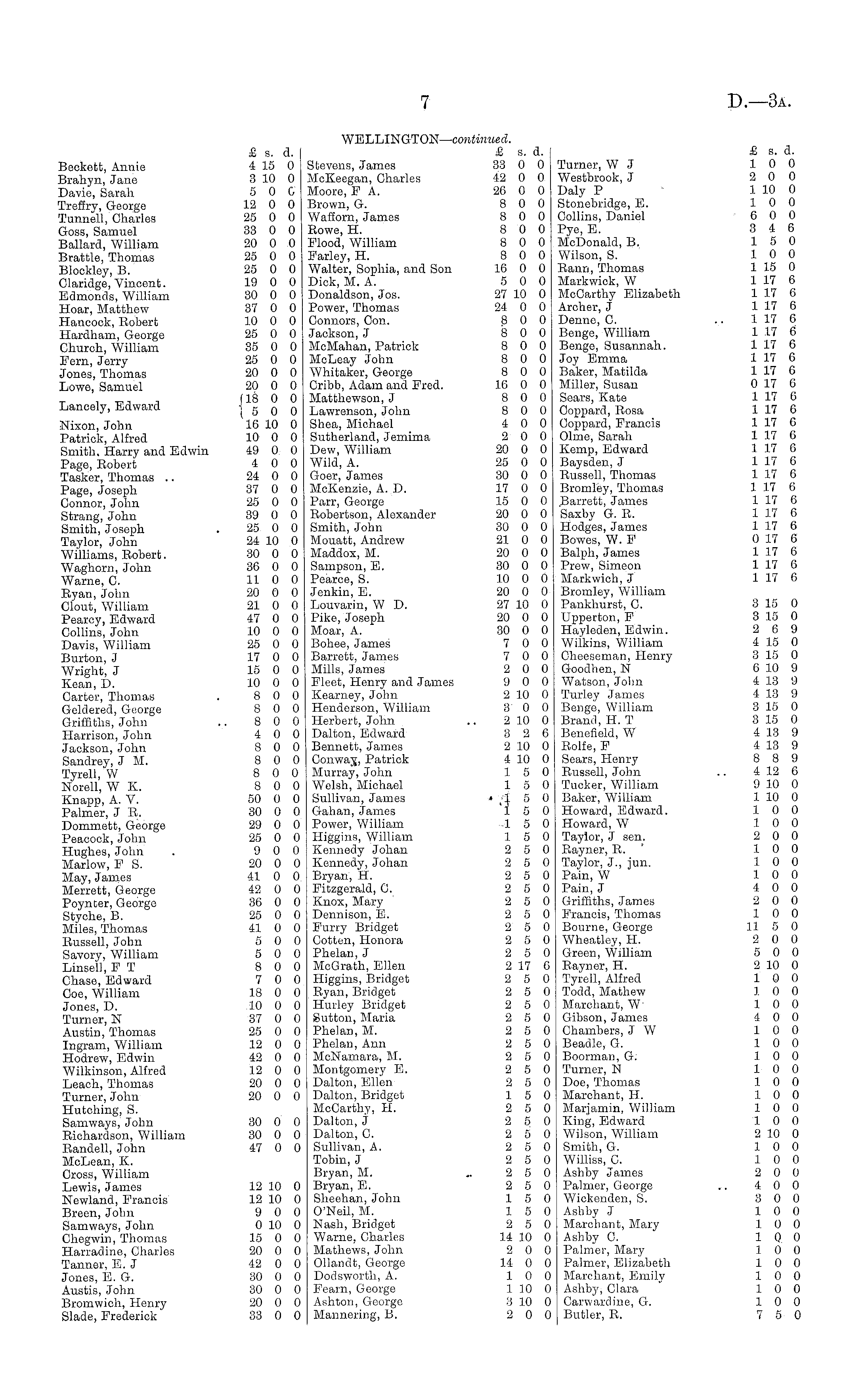 WELLINGTON— continued. £ s. d. £ s. d. £ s. d. Beckett, Annie 4 15 0 Stevens, James 33 0 0 Turner, W J 10 0 Brahyn, Jane 3 10 0 MoKeegan, Charles 42 0 0 Westbrook, J 2 0 0 Davie, Sarah 5 0 0 Moore, FA. 26 0 0 Daly P 1 10 0 Treffry, George 12 0 0 Brown, G. 8 0 0 Stonebridge, E. 10 0 Tunnell, Charles 25 0 0 Wafforn, James 8 0 0 Collins, Daniel 6 0 0 Goss, Samuel 33 0 0 Rowe, H. 8 0 0 Pye, E. 3 4 6 Ballard, William 20 0 0 Flood, William 8 0 0 McDonald, B. 15 0 Brattle, Thomas 25 0 0 Farley, H. 8 0 0 Wilson, S. 10 0 Blockley, B. 25 0 0 Walter, Sophia, and Son 16 0 0 Rann, Thomas 1 15 0 Claridge, Vincent. 19 0 0 Dick, M. A. 5 0 0 Markwick, W 1 17 6 Edmonds, William 30 0 0 Donaldson, Jos. 27 10 0 McCarthy Elizabeth 1 17 6 Hoar, Matthew 37 0 0 Power, Thomas 24 0 0 Archer, J 1 17 6 Hancock, Robert 10 0 0 Connors, Con. 8 0 0 Denne, C. 1 17 6 Hardham, George 25 0 0 Jackson, J 8 0 0 Benge, William 1 17 6 Church, William 35 0 0 McMahan, Patrick 8 0 0 Benge, Susannah. 1 17 6 Fern, Jerry 25 0 0 McLeay John 8 0 0 Joy Emma 1 17 6 Jones, Thomas 20 0 0 Whitaker, George 8 0 0 Baker, Matilda 1 17 6 Lowe, Samuel 20 0 0 Cribb, Adam and Fred. 16 0 0 Miller, Susan 0 17 6 ,_, , (18 0 0 Matthewson, J 8 0 0 Scars, Kato 117 6 Lancely, Edward ] 5 0 0 Lawrenson, John 8 0 0 Coppard, Rosa 1 17 6 Nixon, John 16 10 0 Shea, Michael 4 0 0 Coppard, Francis 1 17 6 Patrick, Alfred 10 0 0 Sutherland, Jemima 2 0 0 Olme, Sarah 1 17 6 Smith, Harry and Edwin 49 0 0 Dew, William 20 0 0 Kemp, Edward 1 17 6 Page, Robert 4 0 0 Wild, A. 25 0 0 Baysden, J 1 17 6 Tasker, Thomas .. 24 0 0 Goer, James 30 0 0 Russell, Thomas 117 6 Page, Joseph 37 0 0 McKenzie, A. D. 17 0 0 Bromley, Thomas 1 17 6 Connor, John 25 0 0 Parr, George 15 0 0 Barrett, James 1 17 6 Strang, John 39 0 0 Robertson, Alexander 20 0 0 Saxby G. R. 1 17 6 Smith, Joseph . 25 0 0 Smith, John 30 0 0 Hodges, James 117 6 Taylor, John 24 10 0 Mouatt, Andrew 21 0 0 Bowes, W. P 0 17 6 Williams, Robert. 30 0 0 Maddox, M. 20 0 0 Balph, James 1 17 6 Waghorn, John 36 0 0 Sampson, E. 30 0 0 Prew, Simeon 1 17 6 Warne, C. 11 0 0 Pearce, S. 10 0 0 Markwich, J 1 17 6 Ryan, John 20 0 0 Jenkin, E. 20 0 0 Bromley, William Clout', William 21 0 0 Louvarin, W D. 27 10 0 Pankhurst, 0. 3 15 0 Pearcy, Edward 47 0 0 Pike, Joseph 20 0 0 Upperton, F 3 15 0 Collins, John 10 0 0 Moar, A. 30 0 0 Hayleden, Edwin. 2 6 9 Davis, William 25 0 0 Bohee, James 7 0 0 Wilkins, William 4 15 0 Burton, J 17 0 0 Barrett, James 7 0 0 Cheeseman, Henry 3 15 0 Wright, J 15 0 0 Mills, James 2 0 0 Goodhen, N 6 10 9 Kean, D. 10 0 0 Fleet, Henry and James 9 0 0 Watson, John 4 13 9 Carter, Thomas . 8 0 0 Kearney, John 2 10 0 Turley James 4 13 9 Geldered, George 8 0 0 Henderson, William 3 0 0 Benge, William 3 15 0 Griffiths, John .. 8 0 0 Herbert, John .. 2 10 0 Brand, H. T 3 15 0 Harrison, John 4 0 0 Dalton, Edward 3 2 6 Benefield, W 4 13 9 Jackson, John 8 0 0 Bennett, James 2 10 0 Rolfe, F 4 13 9 Sandrey, J M. 8 0 0 Conway,, Patrick 4 10 0 Sears, Henry 8 8 9 Tyrell, W 80 0 Murray, John 15 0 Russell, John .. 412 6 Norell, W K. 8 0 0 Welsh, Michael 15 0 Tucker, William 9 10 0 Knapp, A. V. 50 0 0 Sullivan, James ■ ;1_ 5 0 Baker, William 1 10 0 Palmer, JR. 30 0 0 Gahan, James 15 0 Howard, Edward. 10 0 Dommett, George 29 0 0 Power, William 15 0 Howard, W 10 0 Peacock, John 25 0 0 Higgins, William 15 0 Taylor, J sen. 2 0 0 Hughes, John . 9 0 0 Kennedy Johan 2 5 0 Rayner, R. 10 0 Marlow, PS. 20 0 0 Kennedy, Johan 2 5 0 Taylor, J., jun. 10 0 May, James 41 0 0 Bryan, H. 2 5 0 Pain, W 10 0 Merrett, George 42 0 0 Fitzgerald, C. 2 5 0 Pain, J 4 0 0 Poynter, George 36 0 0 Knox, Mary 2 5 0 Griffiths, James 2 0 0 Styche, B. 25 0 0 Dennison, E. 2 5 0 Francis, Thomas 10 0 Miles, Thomas 41 0 0 Furry Bridget 2 5 0 Bourne, George 11 5 0 Russell, John 5 0 0 Gotten, Honora 2 5 0 Wheatley, H. 2 0 0 Savory William 5 0 0 Phelan, J 2 5 0 Green, William 5 0 0 Linsell, FT 8 0 0 McGrath, Ellen 2 17 6 Rayner, H. 2 10 0 Chase, Edward 7 0 0 Higgins, Bridget 2 5 0 Tyrell, Alfred 10 0 Coe, William 18 0 0 Ryan, Bridget 2 5 0 Todd, Mathew 10 0 Jones, D. 10 0 0 Hurley Bridget 2 5 0 Marchant, W 10 0 Turner, N 37 0 0 Sutton, Maria 2 5 0 Gibson, James 4 0 0 Austin, Thomas 25 0 0 Phelan, M. 2 5 0 Chambers, J W 10 0 Ingram, William 12 0 0 Phelan, Ann 2 5 0 Beadle, G. 10 0 Hodrew, Edwin 42 0 0 McNamara, M. 2 5 0 Boorman, G. 10 0 Wilkinson, Alfred 12 0 0 Montgomery E. 2 5 0 Turner, N 10 0 Leach, Thomas 20 0 0 Dalton, Ellen 2 5 0 Doe, Thomas 10 0 Turner, John 20 0 0 Dalton, Bridget 15 0 Marchant, H. 10 0 Hutching, S. McCarthy, H. 2 5 0 Marjamin, William 10 0 Samways, John 30 0 0 Dalton, J 2 5 0 King, Edward 10 0 Richardson, William 30 0 0 Dalton, C. 2 5 0 Wilson, William 2 10 0 Randcll, John 47 0 0 Sullivan, A. 2 5 0 Smith, G. 10 0 McLean, K. Tobin, J 2 5 0 Williss, C. 10 0 Cross, William Bryan, M. „ 2 5 0 Ashby James 2 0 0 Lewis, James 12 10 0 Bryan, E. 2 5 0 Palmer, George .. 4 0 0 Newland, Francis 12 10 0 Sheehan, John 15 0 Wickenden, S. 3 0 0 Breen, John 9 0 0 O'Neil, M. 15 0 Ashby J 10 0 Samways, John 0 10 0 Nash, Bridget 2 5 0 Marchant, Mary 10 0 Chegwin, Thomas 15 0 0 Warne, Charles 14 10 0 Ashby C. 10 0 Harradine, Charles 20 0 0 Mathews, John 2 0 0 Palmer, Mary 1 0 0 Tanner, E. J 42 0 0 Qllandt, George 14 0 0 Palmer, Elizabeth 10 0 Jones, E.G. 30 0 0 Dodsworth, A. 10 0 Marchant, Emily 10 0 Austis, John 30 0 0 Fearn, George 1 10 0 Ashby, Clara 10 0 Bromwich, Henry 20 0 0 Ashton, George 3 10 0 Carwardine, G. 10 0 Slade, Frederick 33 0 0 Mannering, B. 2 0 0 Butler, R. 7 5 0