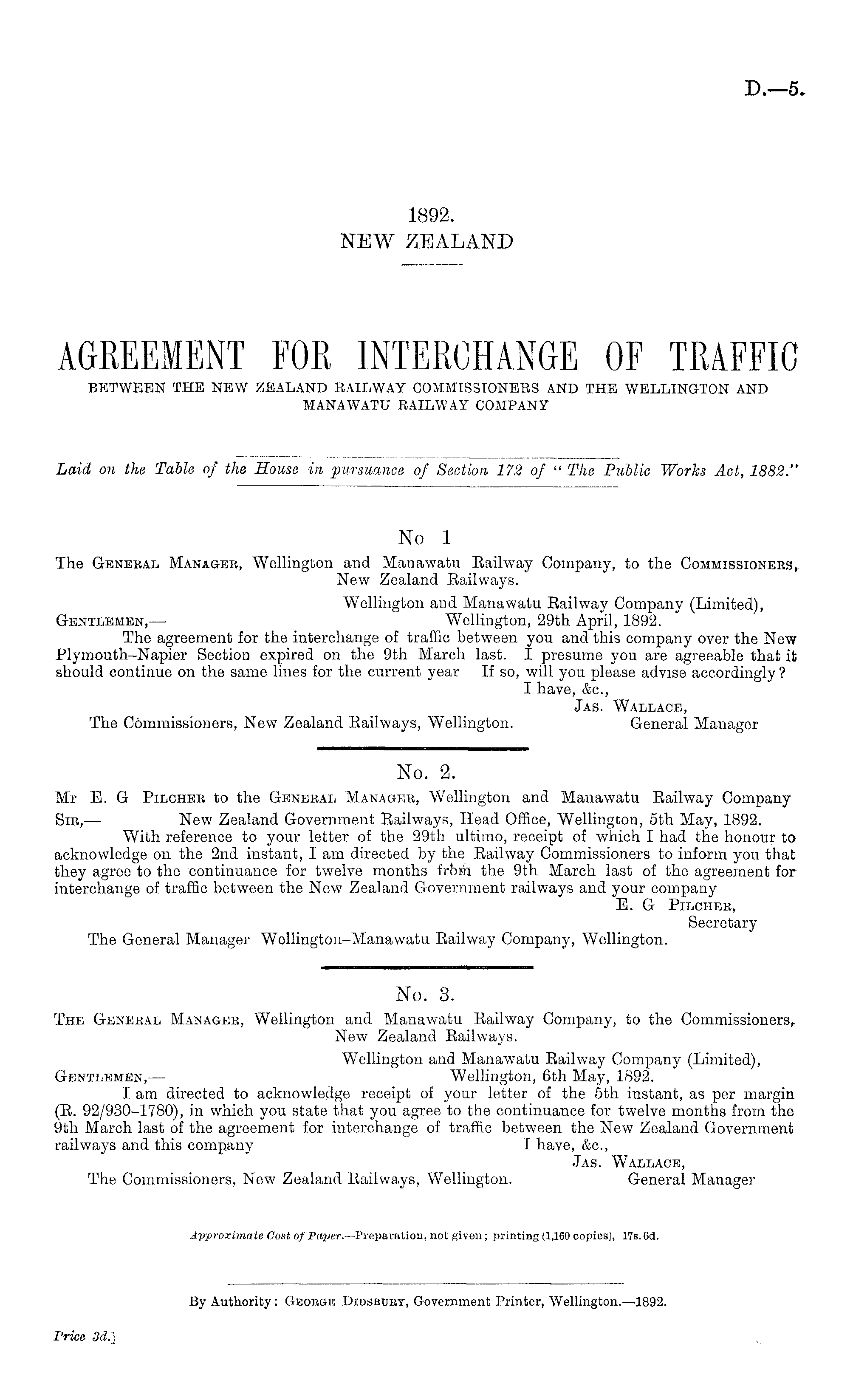 No 1 The General Manager, Wellington and Manawatu Eailway Company, to the Commissioners, New Zealand Eailways. Wellington and Manawatu Eailway Company (Limited), Gentlemen,— Wellington, 29th April, 1892. The agreement for the interchange of traffic between you and this company over the New Plymouth-Napier Section expired on the 9th March last. I presume you are agreeable that it should continue on the same lines for the current year If so, will you please advise accordingly? I have, &c, Jas. Wallace, The Commissioners, New Zealand Eailways, Wellington. General Manager