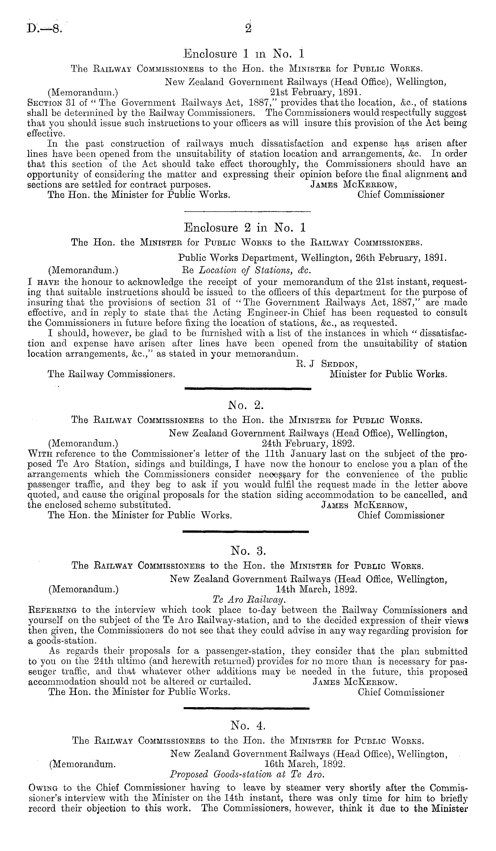 Mo. 2. The Eailway Commissioners to the Hon. the Minister for Public Woeks. New Zealand Government Eailways (Head Office), Wellington, (Memorandum.) 24th February, 1892. With reference to the Commissioner's letter of the 11th January last on the subject of the proposed To Aro Station, sidings and buildings, I have now the honour to enclose you a plan of the arrangements which the Commissioners consider necessary for the convenience of the public passenger traffic, and they beg to ask if you would fulfil the request made in the letter above quoted, and cause the original proposals for the station siding accommodation to be cancelled, and the enclosed scheme substituted. James McKeeeow, The Hon. the Minister for Public Works. Chief Commissioner