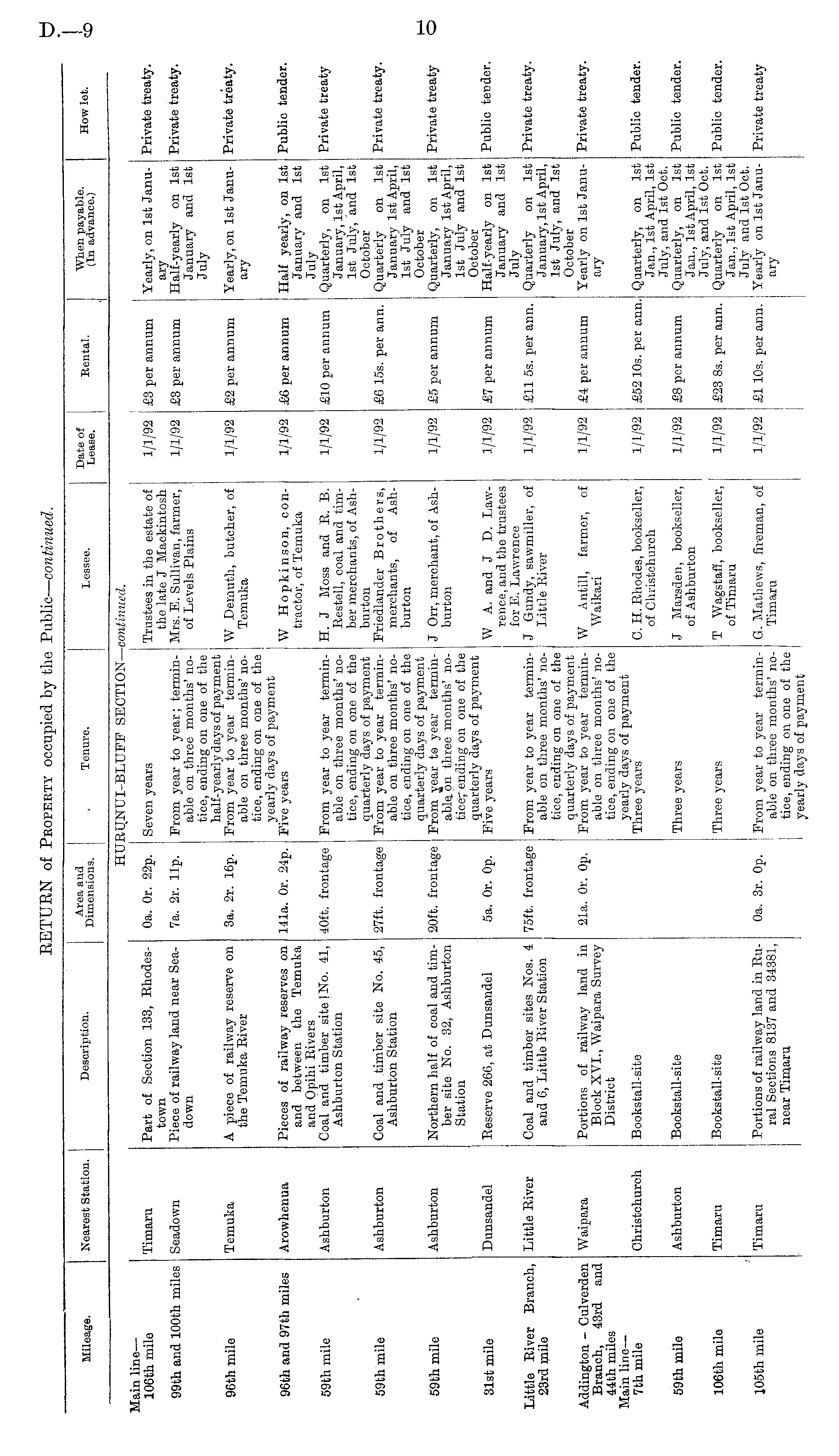 Mileage. Nearest Station. Description. Area and Dimensions. Tenure. Lessee. Date of Lease. Rental. When payable. (In advance.) How let. HURUNUI-BLUPF SECTIONI ■continued. Main line — 106th mile Timaru Part of Section 133, Rhodestown Piece of railway land near Seadown 0a. Or. 22p. Seven years Trustees in the estate of the late J Mackintosh Mrs. E. Sullivan, farmer, of Levels Plains 1/1/92 £3 per annum Yearly, on 1st January Half-yearly on 1st January and 1st July Private treaty. 99th and 100th miles Seadown 7a. 2r. lip. From year to year; terminable on three months' notice, ending on one of the half-yearly days of payment 3a. 2r. 16p. From year to year terminable on three months' notice, ending on one of the yearly days of payment 141a. Or. 24p. Five years 1/1/92 £3 per annum Private treaty. 96th mile Temuka A piece of railway reserve on the Temnka River W Demuth, butcher, of Temuka 1/1/92 £2 per annum Yearly, on 1st January Private treaty. 96th and 97th miles Arowhenua Pieces of railway reserves on and between the Temuka and Opihi Rivers Coal and timber site! No. 41, Ashburton Station W Hopkinson, contractor, of Temuka 1/1/92 £6 per annum Half yearly, on 1st January and 1st July Quarterly, on 1st January, 1st April, 1st July, and 1st October Quarterly on 1st January 1st April, 1st July and 1st October Quarterly, on 1st January 1st April, 1st July and 1st October Half-yearly on 1st January and 1st July Quarterly on 1st January, 1st April, 1st July, and 1st October Yearly on 1st January Public tender. 59th mile Ashburton 40ft. frontage From year to year terminable on three months' notice, ending on one of the quarterly days of payment 27ft. frontage From year to year terminable on three months' notice, ending on one of the quarterly days of payment 20ft. frontage i From year te year terminable, on three months' notice;" ending on one of the quarterly days of payment 5a. Or. Op. Five years H. J Moss and R. B. Restell, coal and timber merchants, of Ashburton Friedlander Brothers, merchants, of Ashburton 1/1/92 £10 per annum Private treaty 59th mile Ashburton Coal and timber site No. 45, Ashburton Station 1/1/92 £6 15s. per ann. Private treaty. 59 th mile Ashburton Northern half of coal and timber site No. 32, Ashburton Station J Orr, merchant, of Ashburton 1/1/92 £5 per annum Private treaty 31st mile Dunsandel Reserve 266, at Dunsandel \V A. and J D. Lawrence, and the trustees for E. Lawrence J Gundy, sawmiller, of Little River 1/1/92 £7 per annum Public tender. Little River Branch, 23rcl mile Little River Coal and timber sites Nos. 4 and 6, Little River Station 75ft. frontage From year to year terminable on three months' notice, ending on one of the quarterly days of payment 21a. Or. Op. From year to year terminable on three months' notice, ending on one of the yearly days of payment Three years 1/1/92 £11 5s. per ann. Private treaty. Addington - Culverden Branch, 43rd and 44th miles Main line — 7th mile Waipara Portions of railway land in Block XVI., Waipara Survey District W Antill, farmer, of Waikari 1/1/92 £4 per annum Private treaty. Christchurch Bookstall-site C. H. Rhodes, bookseller, of Christchuroh 1/1/92 £52 10s. per ann. Quarterly, on 1st Jan., 1st April, 1st July, and 1st Oct. Quarterly, on 1st Jan., 1st April, 1st July, and 1st Oct. Quarterly on 1st Jan., 1st April, 1st July and 1st Oct. Yearly on 1st aryPublic tender. 59 th mile Ashburton Bookstall-site Three years J Marsden, bookseller, of Ashburton 1/1/92 £8 per annum Public tender. 106th mile Timaru Bookstall-site Three years T Wagstaff, bookseller, of Timaru 1/1/92 £23 8s. per ann. Public tender, 105th mile Timaru Portions of railway land in Rural Sections 8137 and 34381, near Tiniaru 0a. 3r. Op. j From year to year terminable on three months' notice, ending on one of the yearly days of payment 0a. 3r. Op. G. Mathews, fireman, of Timaru 1/1/92 £1 10s. per ami. Private treaty